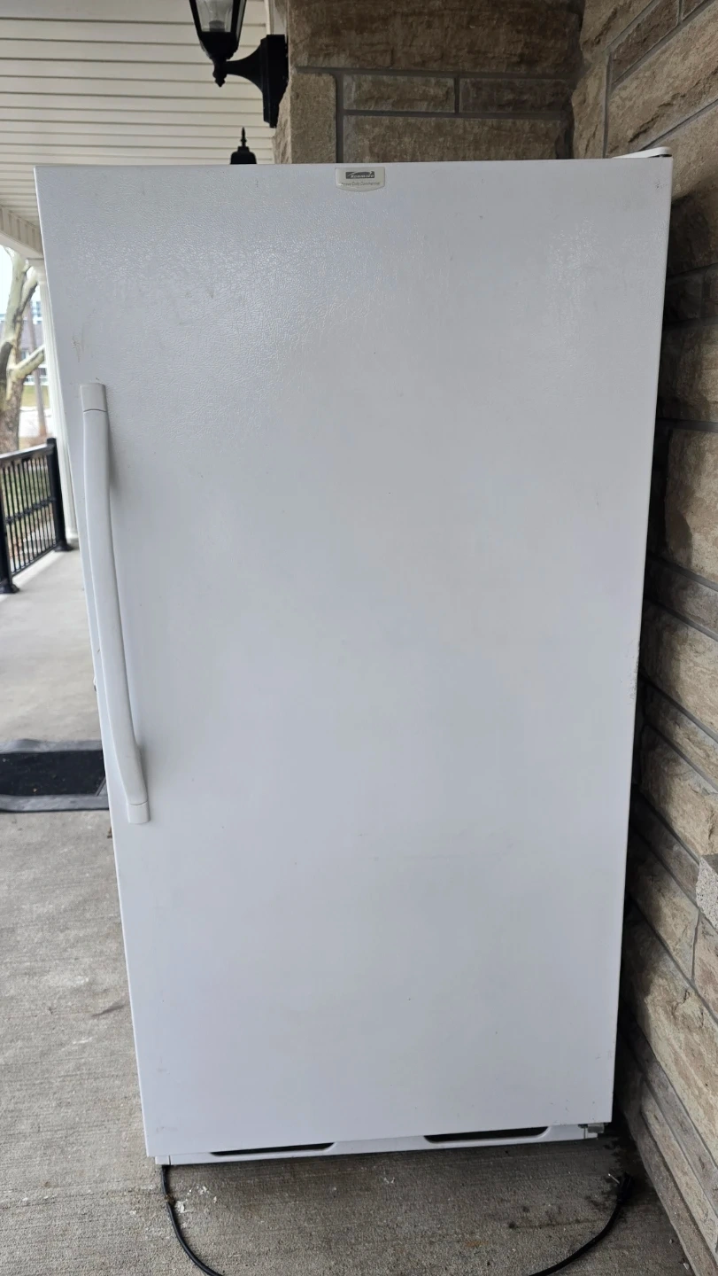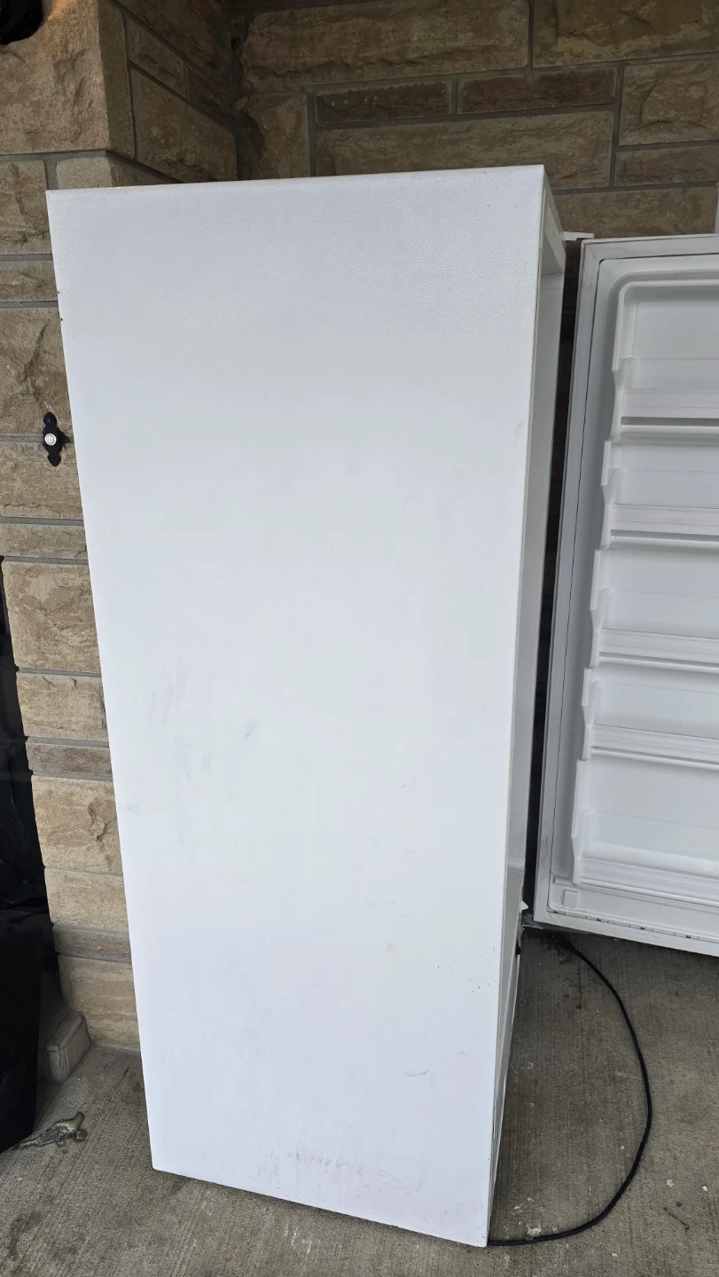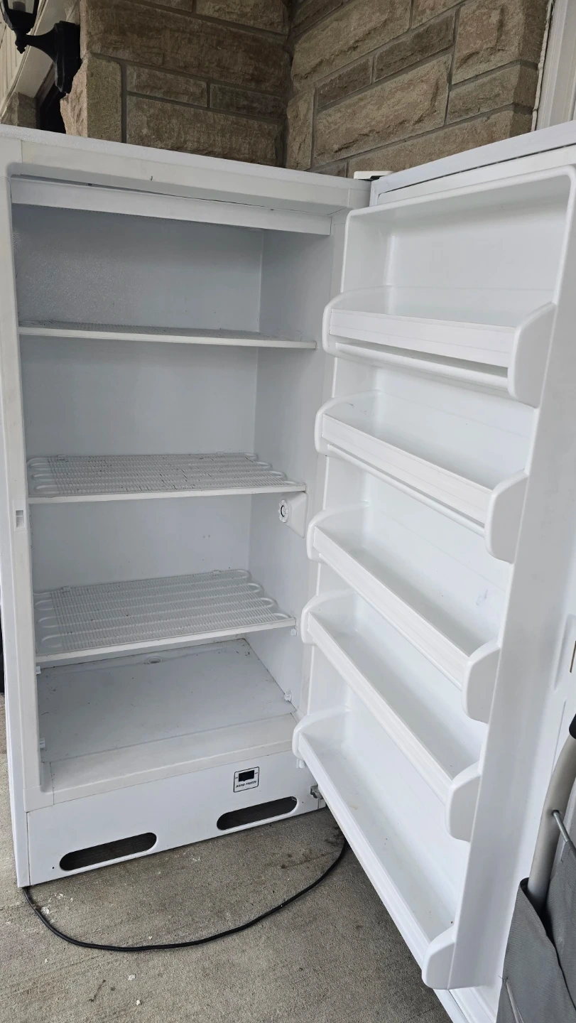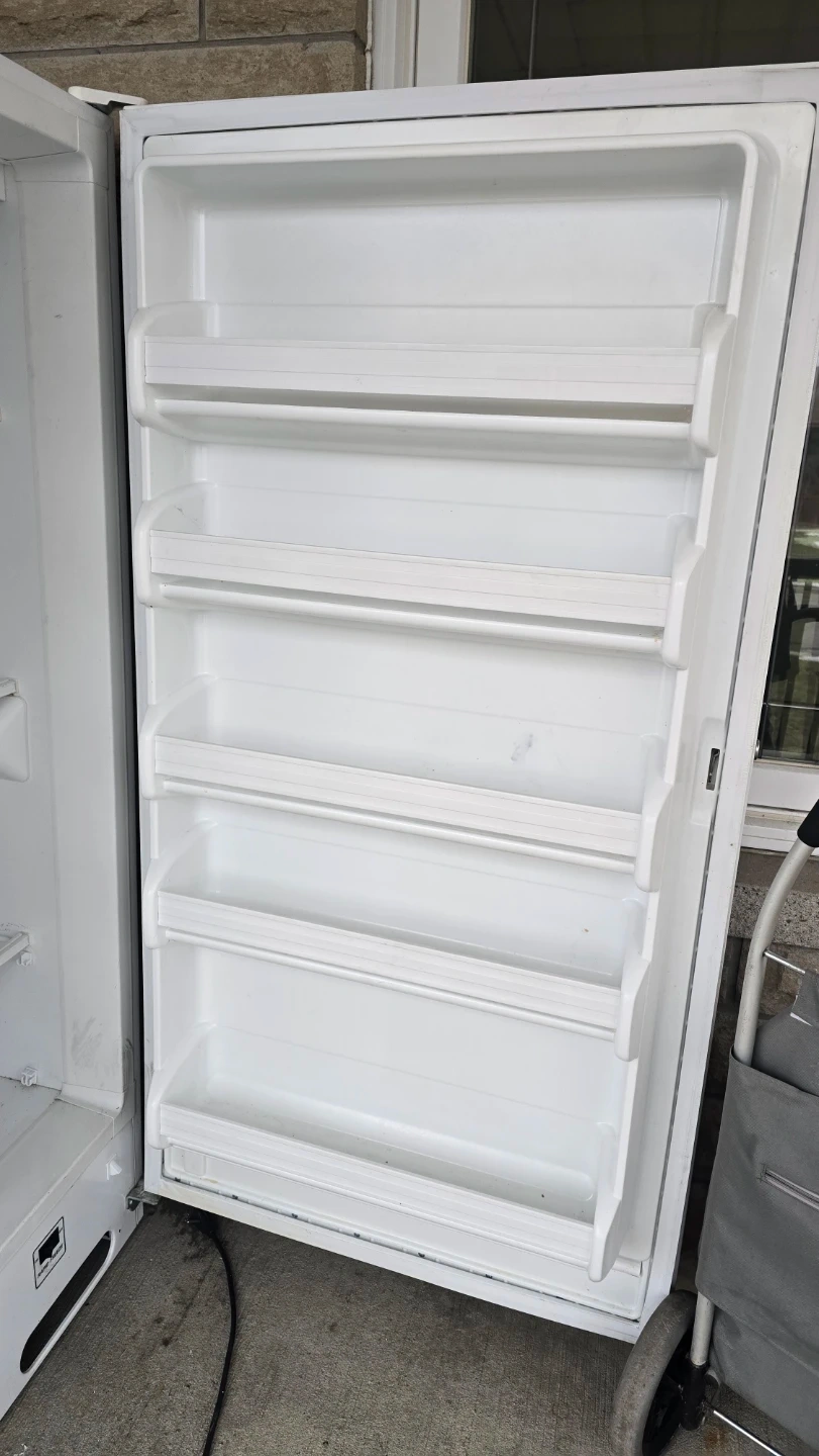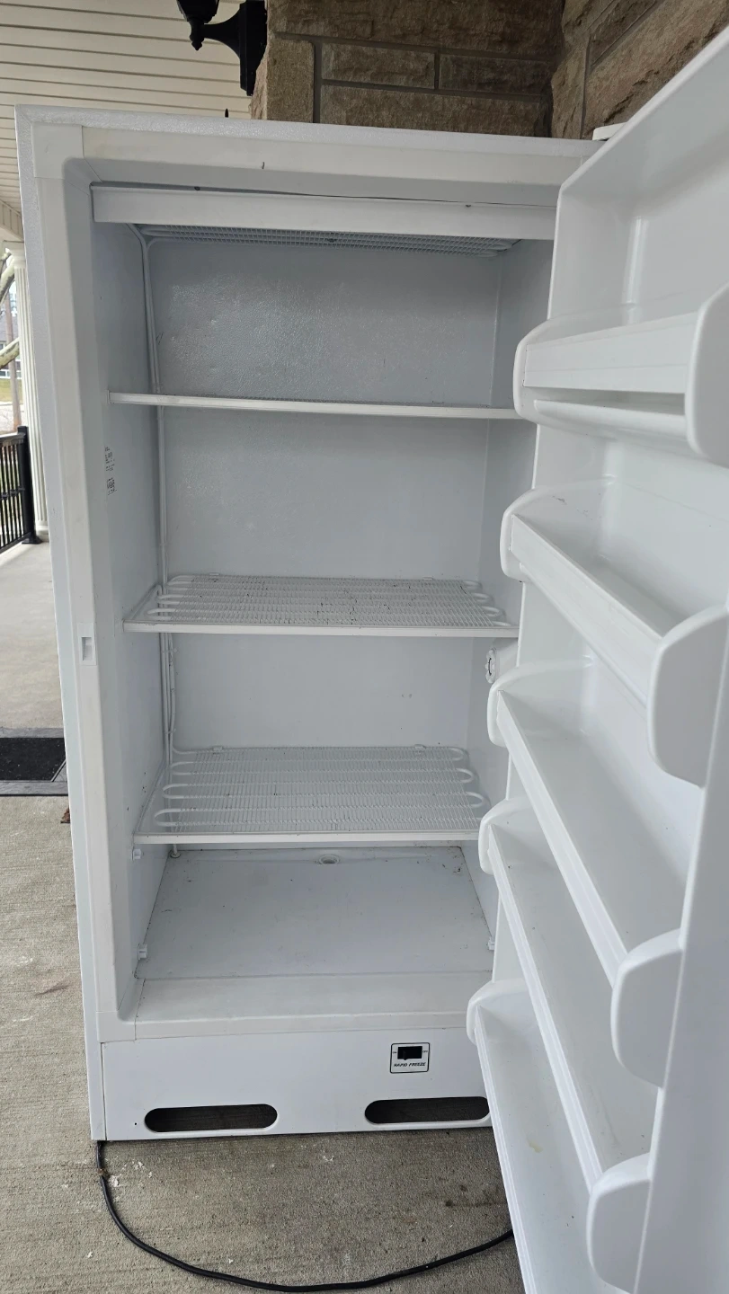 Selling a white upright freezer. It's in good condition and ready to keep your food frozen solid! It has shelves and door storage for easy organization