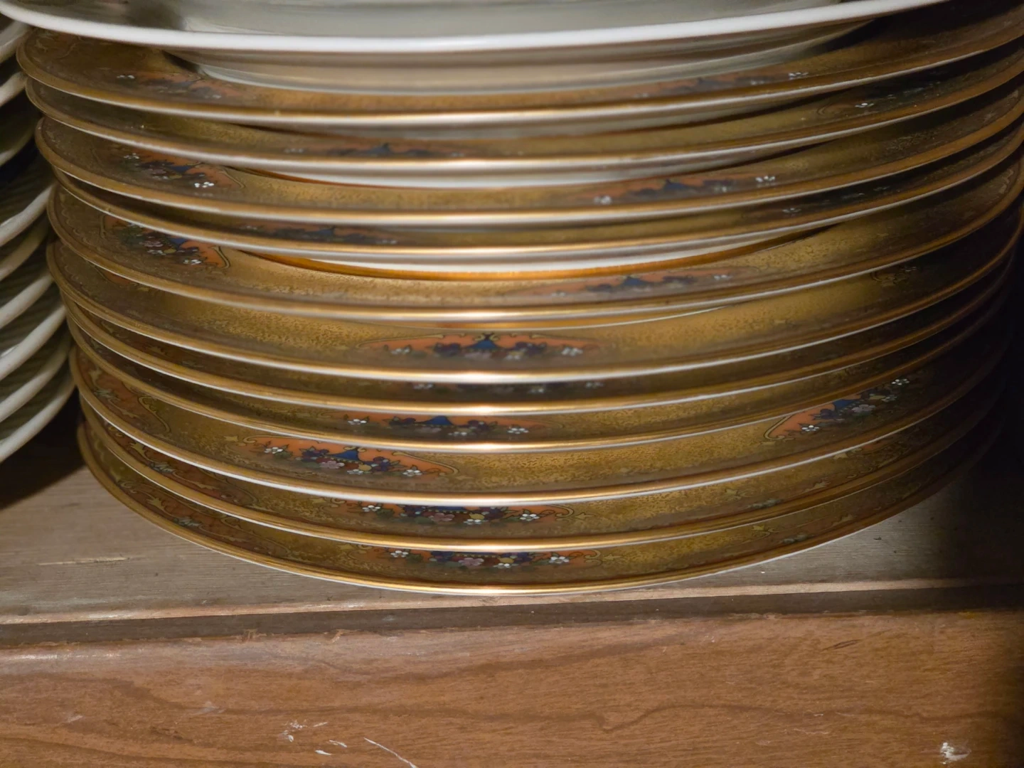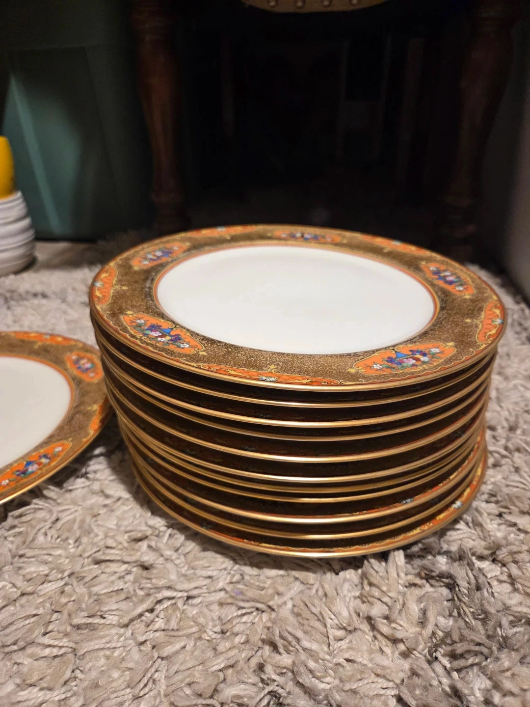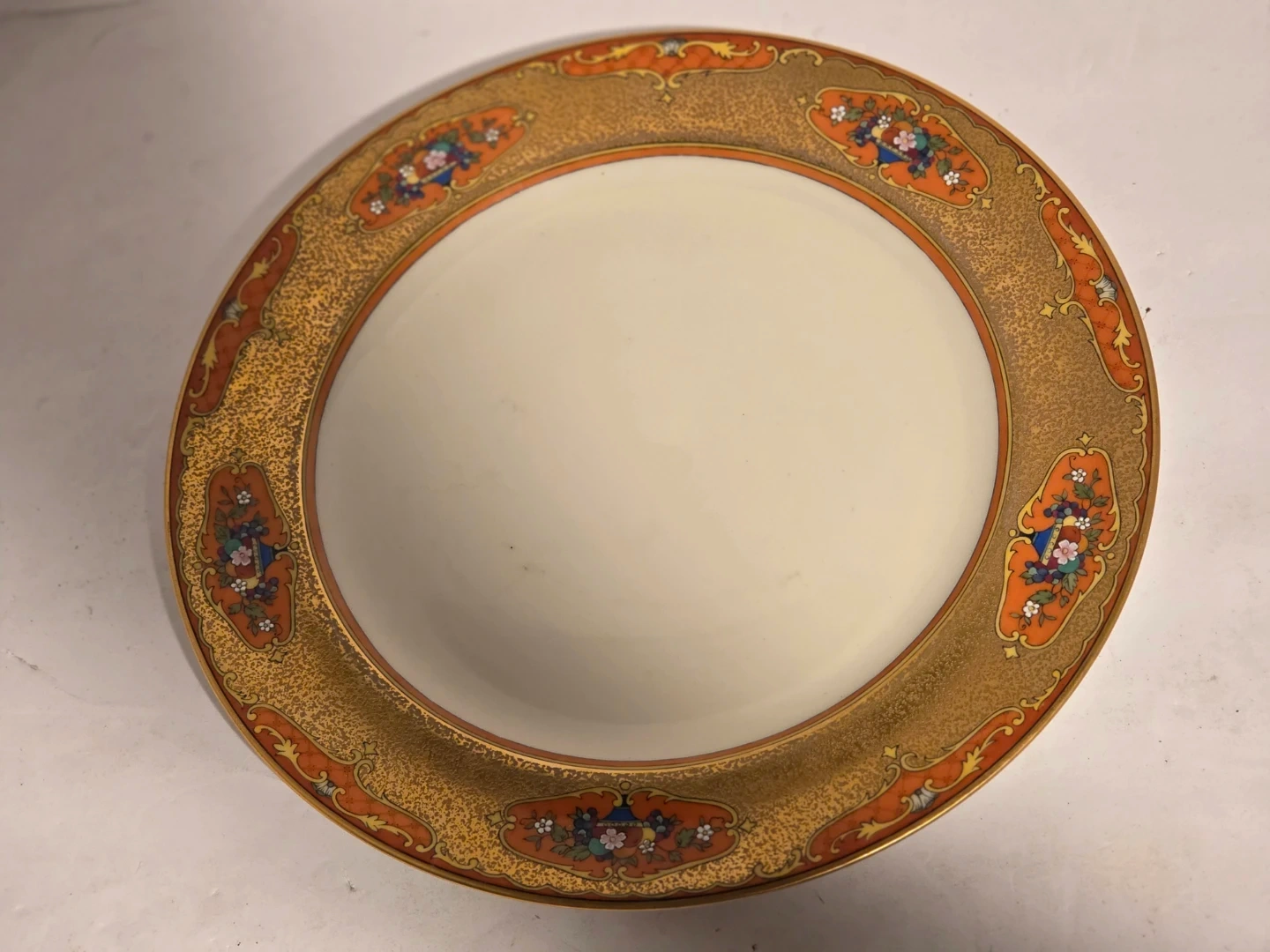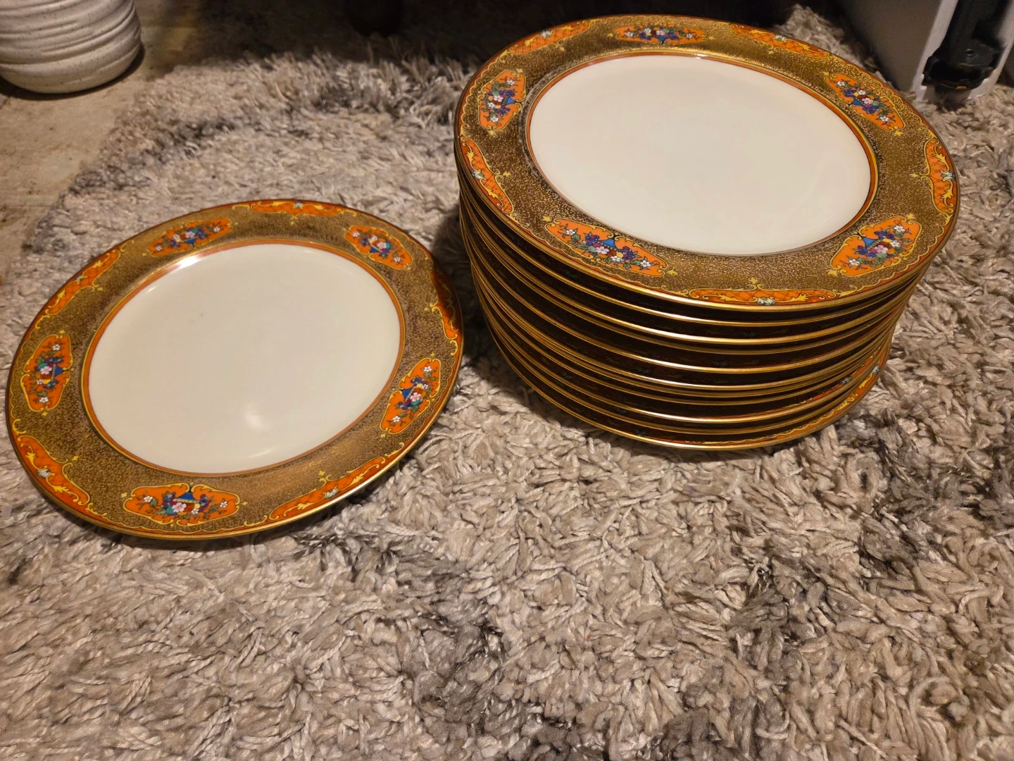 This is a set of Noritake dinner plates. They feature a gold rim with an orange and floral design. This set includes 12 plates. Perfect for formal dinners or everyday elegance!