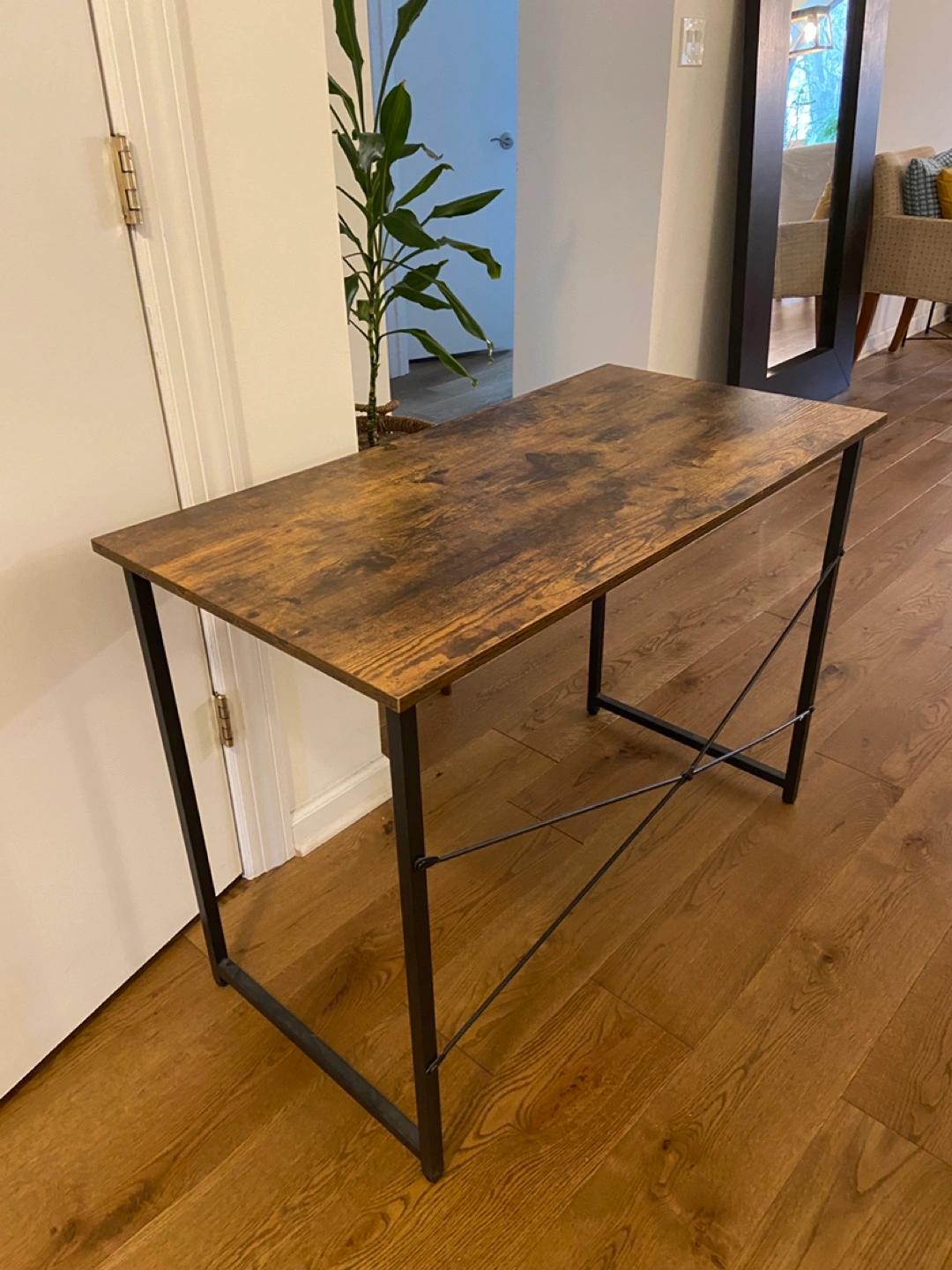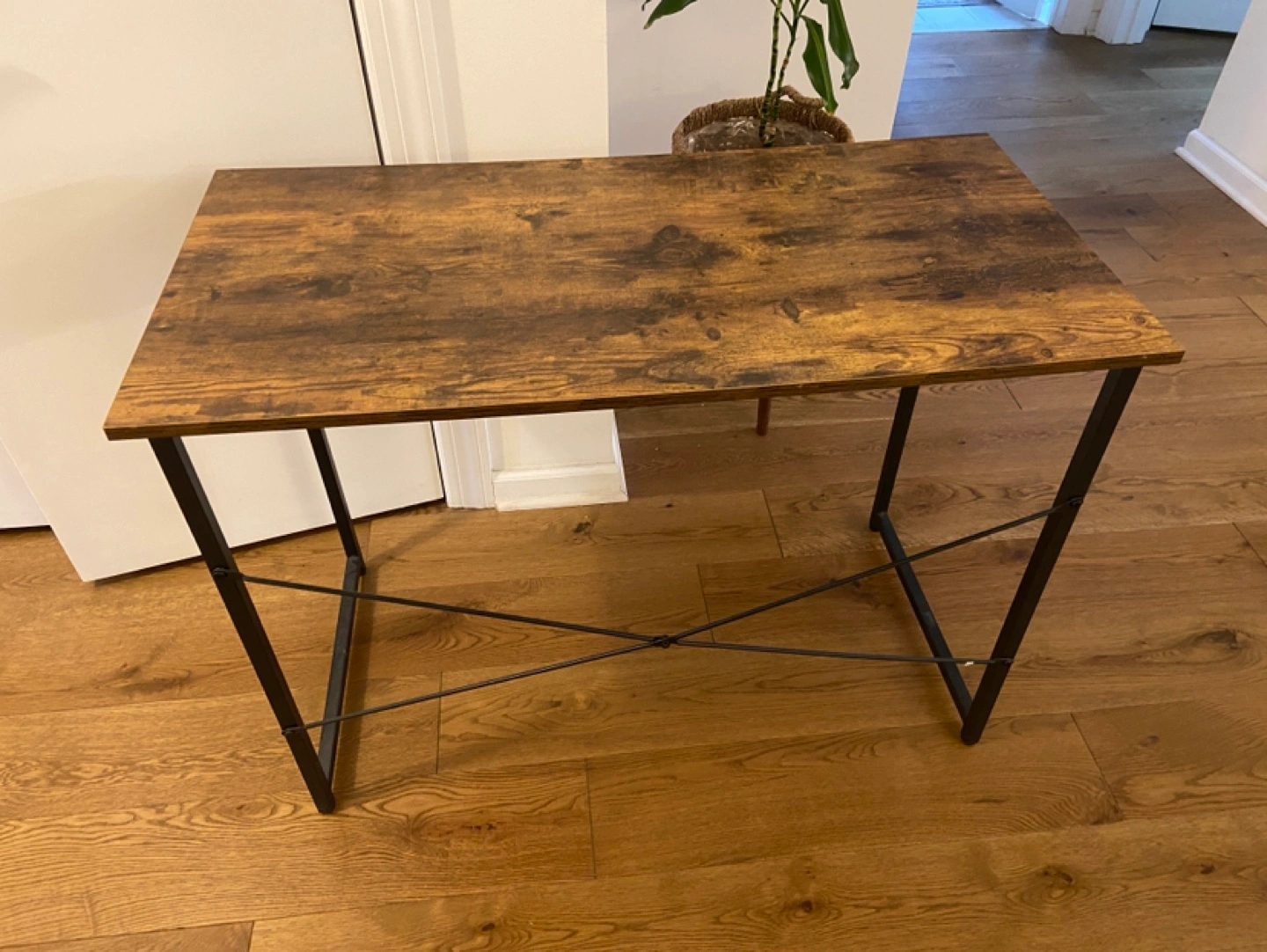 Small writing desk. Brown wood-look top. Black metal legs. X-shaped support. Simple design. Perfect for small spaces.