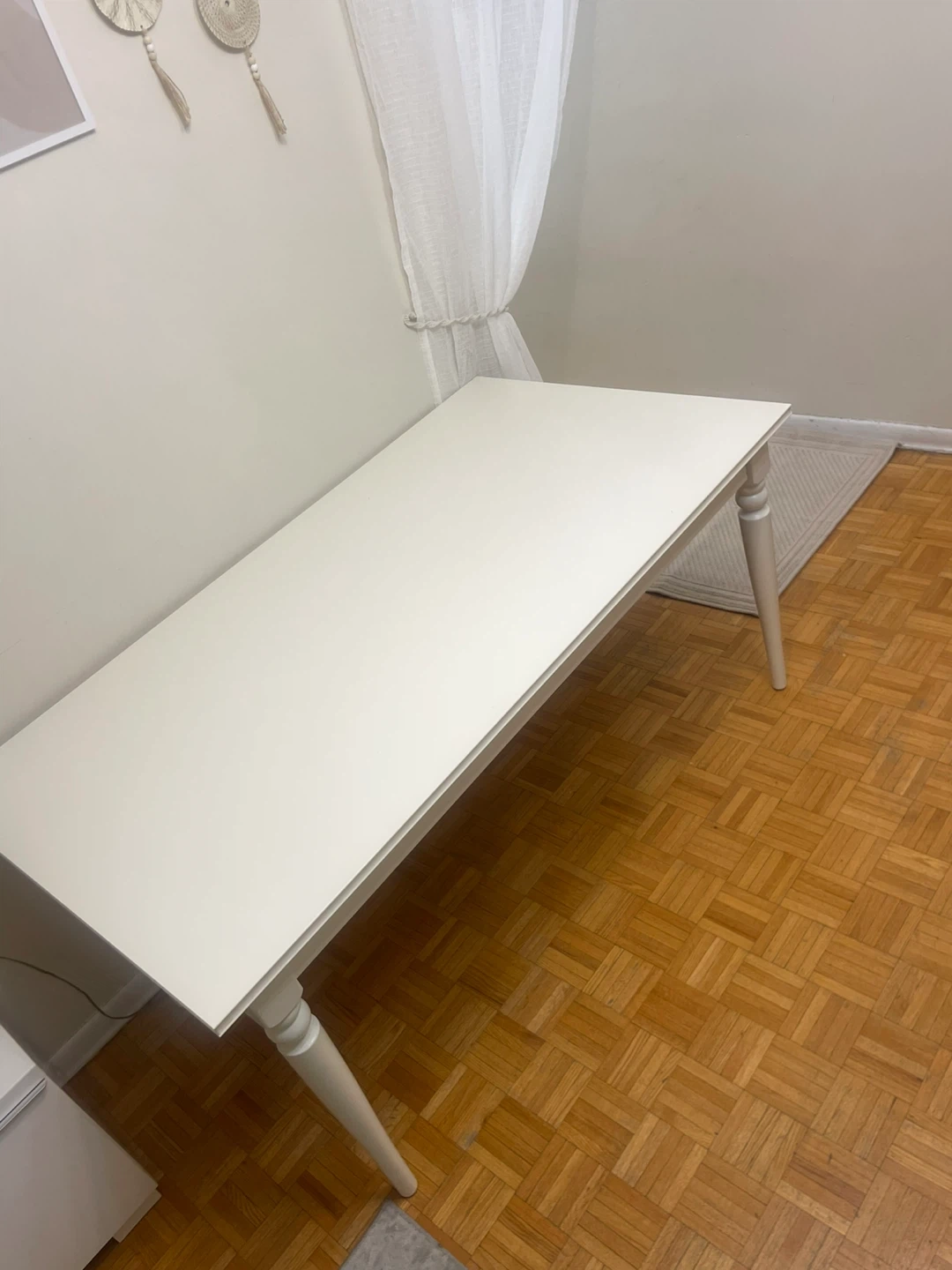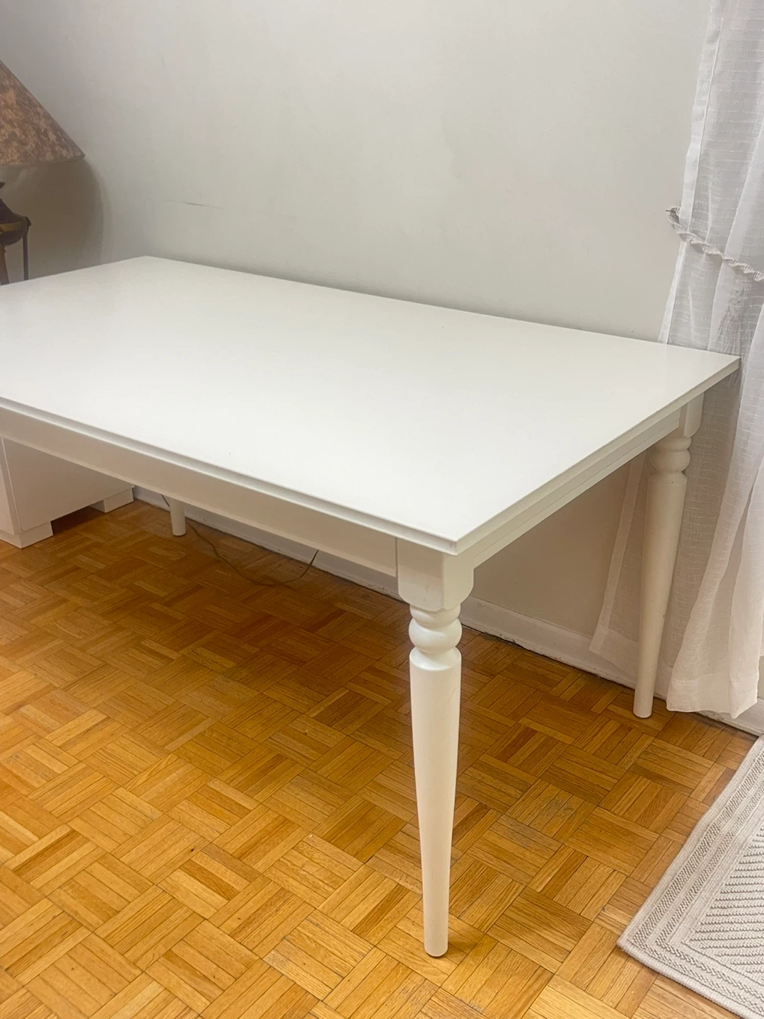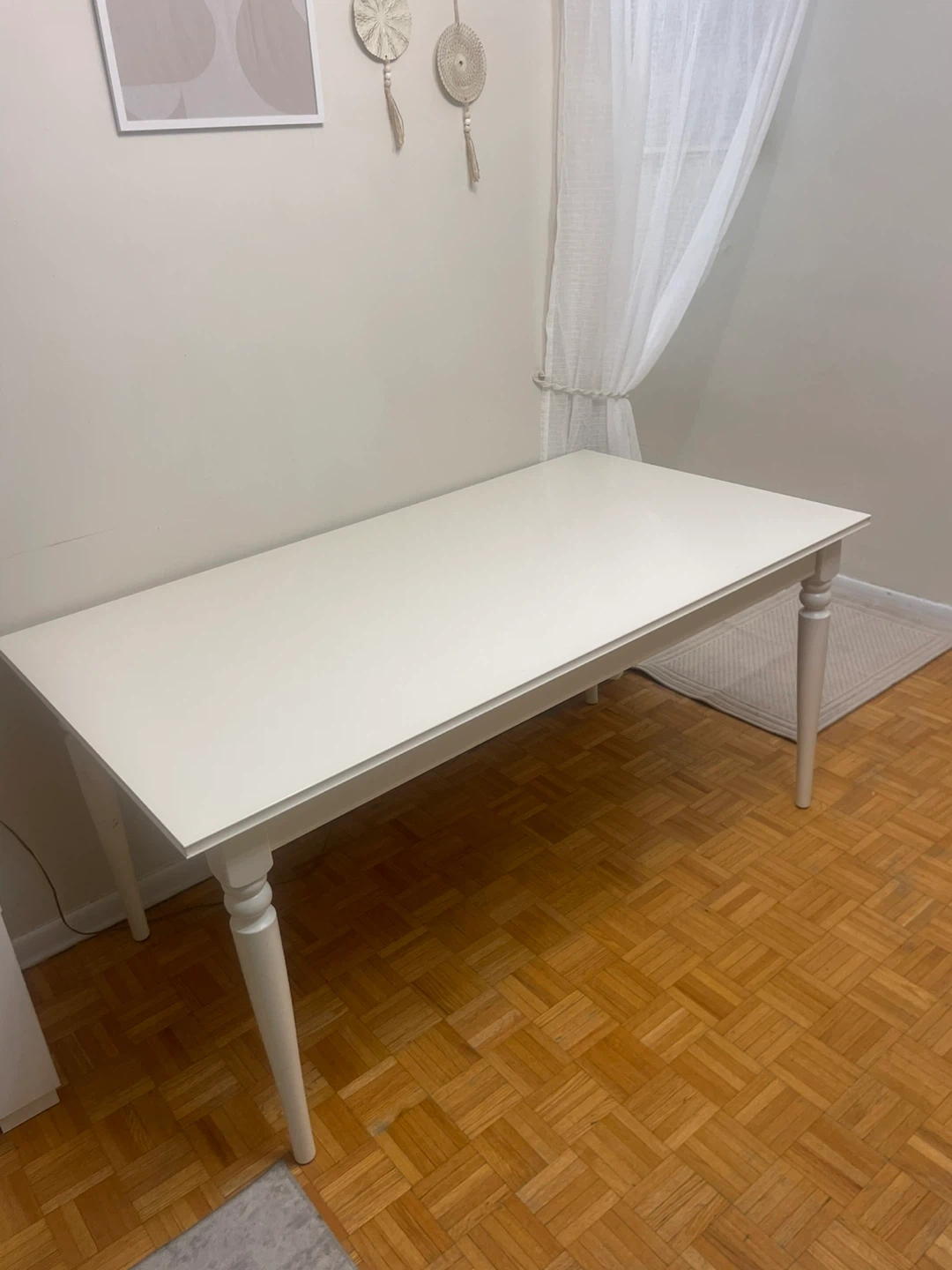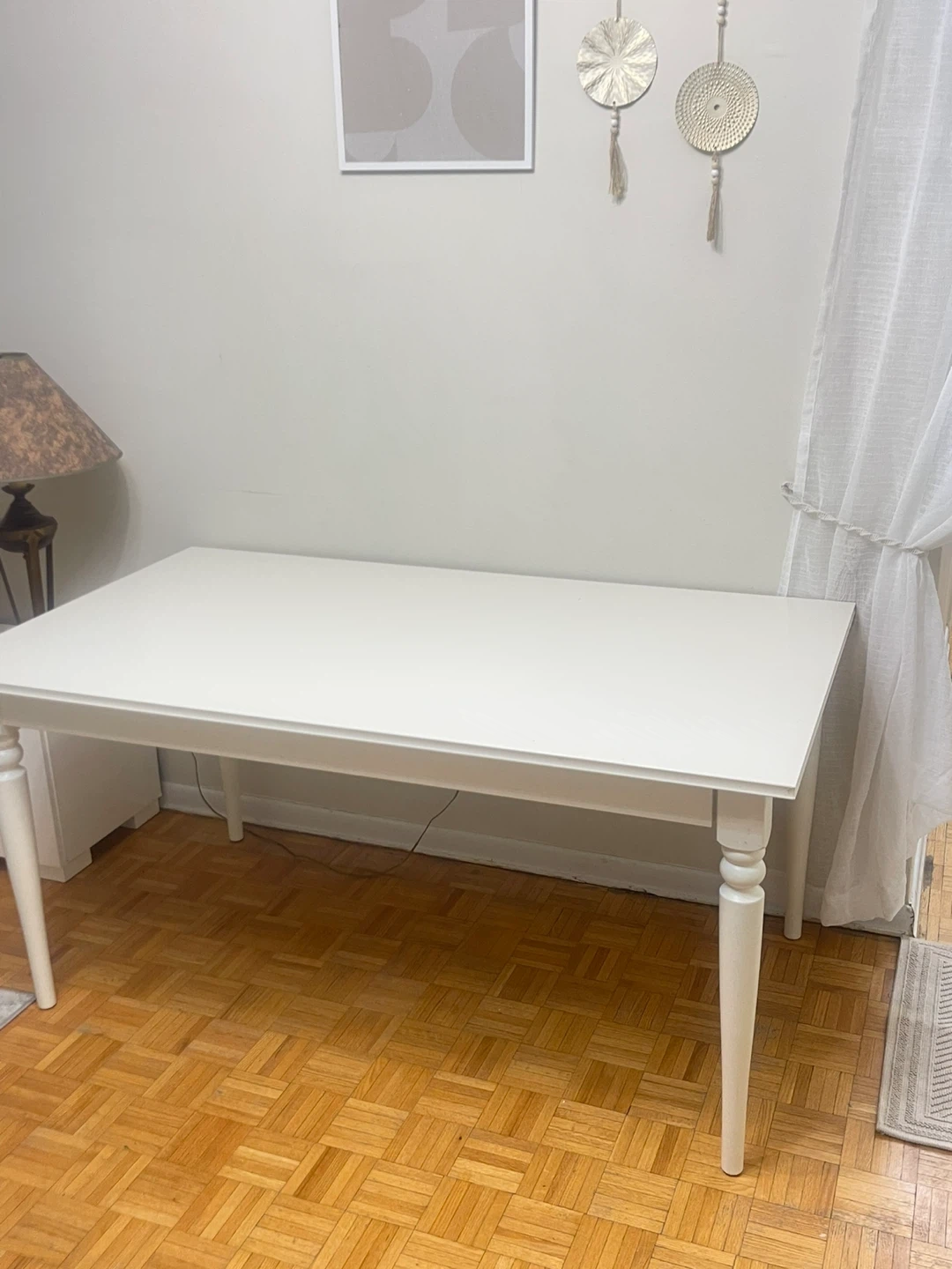 This is a white dining table with classic turned legs. It's a simple yet elegant piece for your dining space. The table is made of wood with a painted finish. It's large enough to seat multiple people comfortably. Length: 155 cm ≈ 61.02 in