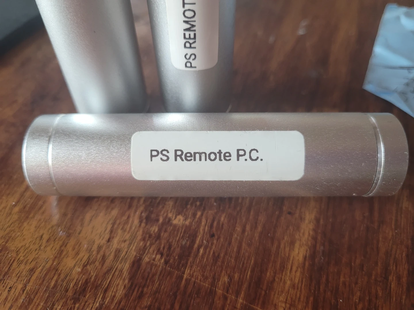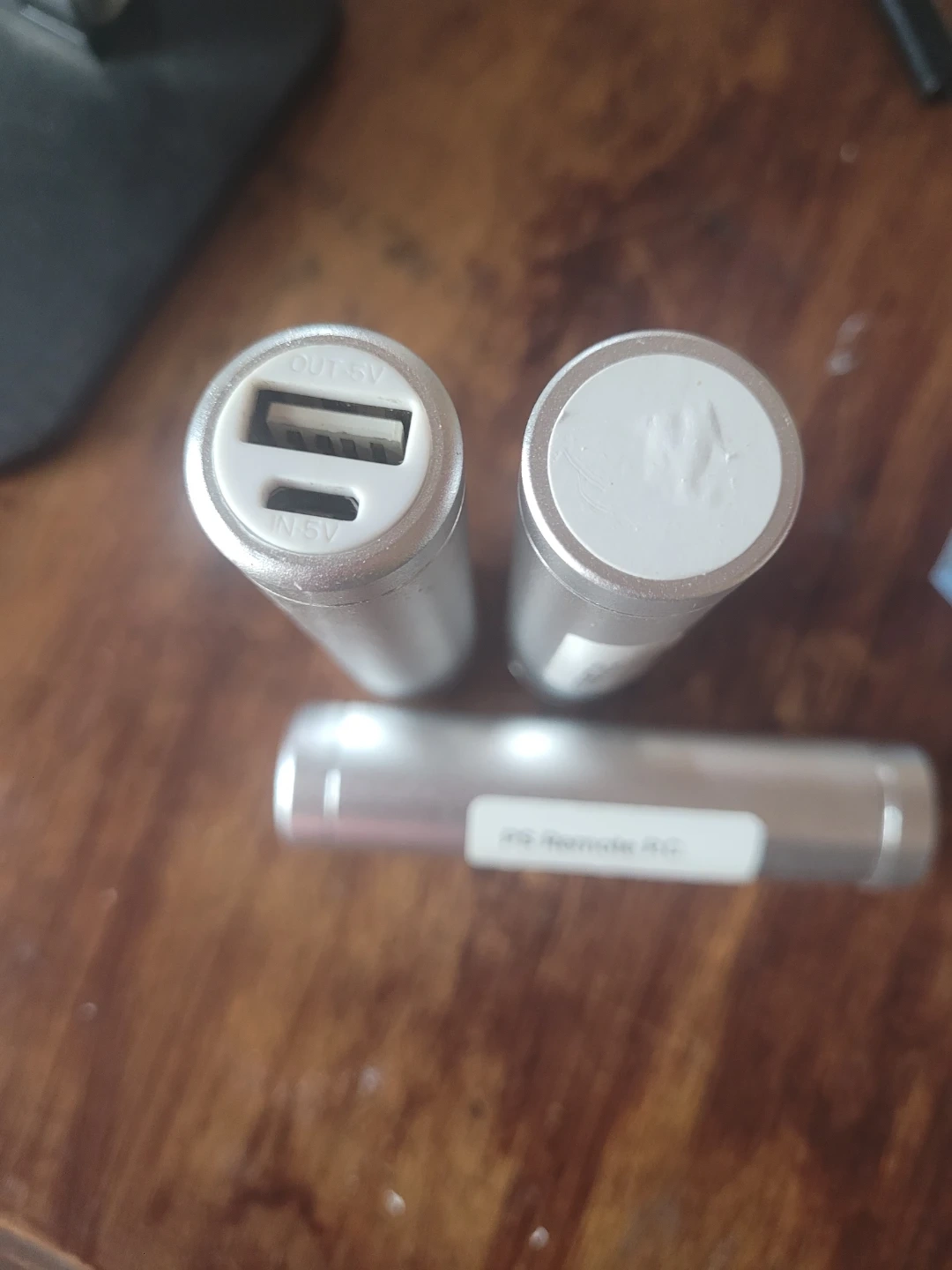 This is a set of two PS Remote P.C. USB power banks. They are silver and cylindrical in shape. One unit has a USB-A output port and a micro-USB input port.