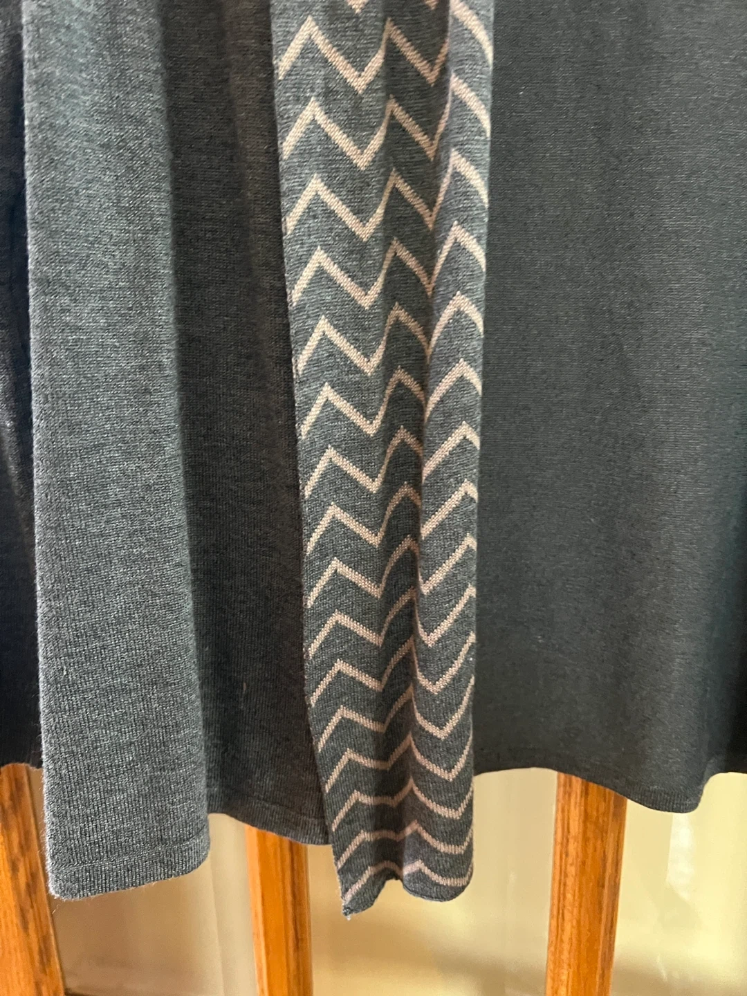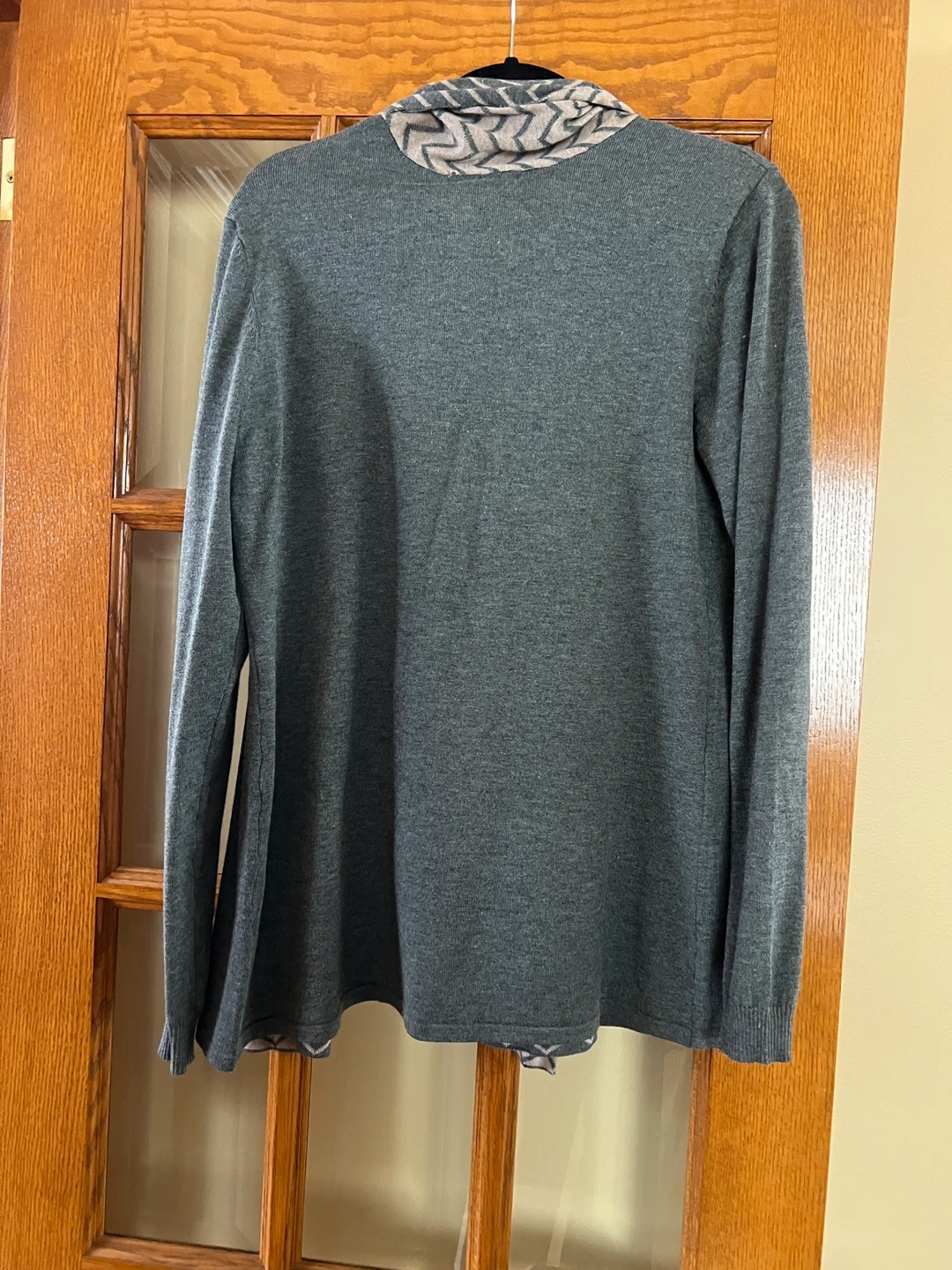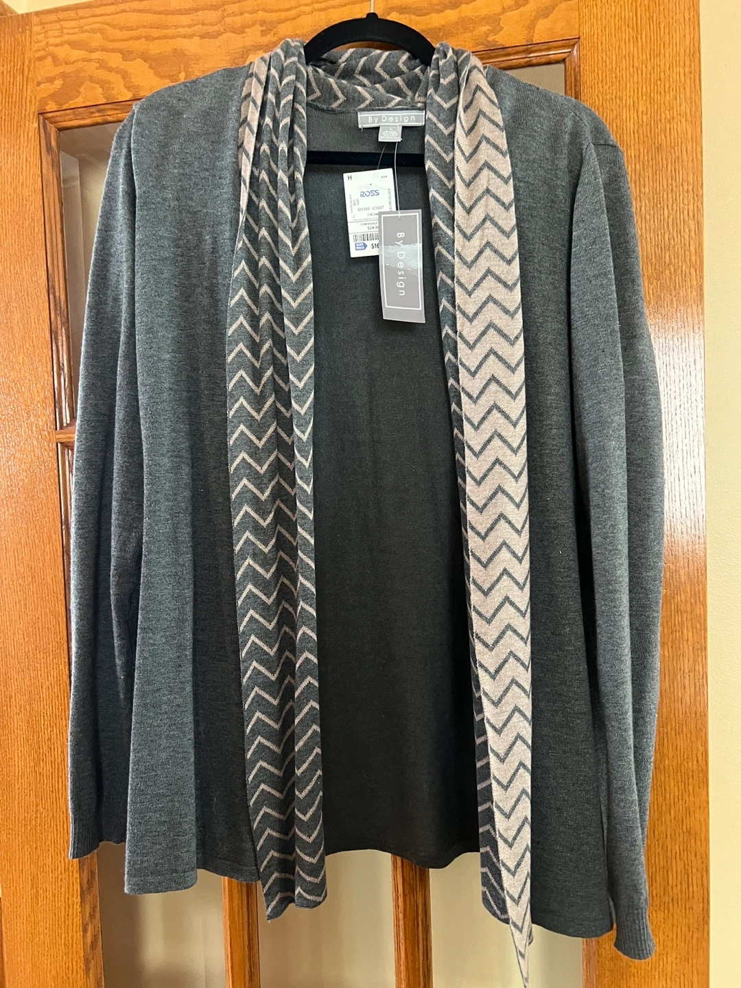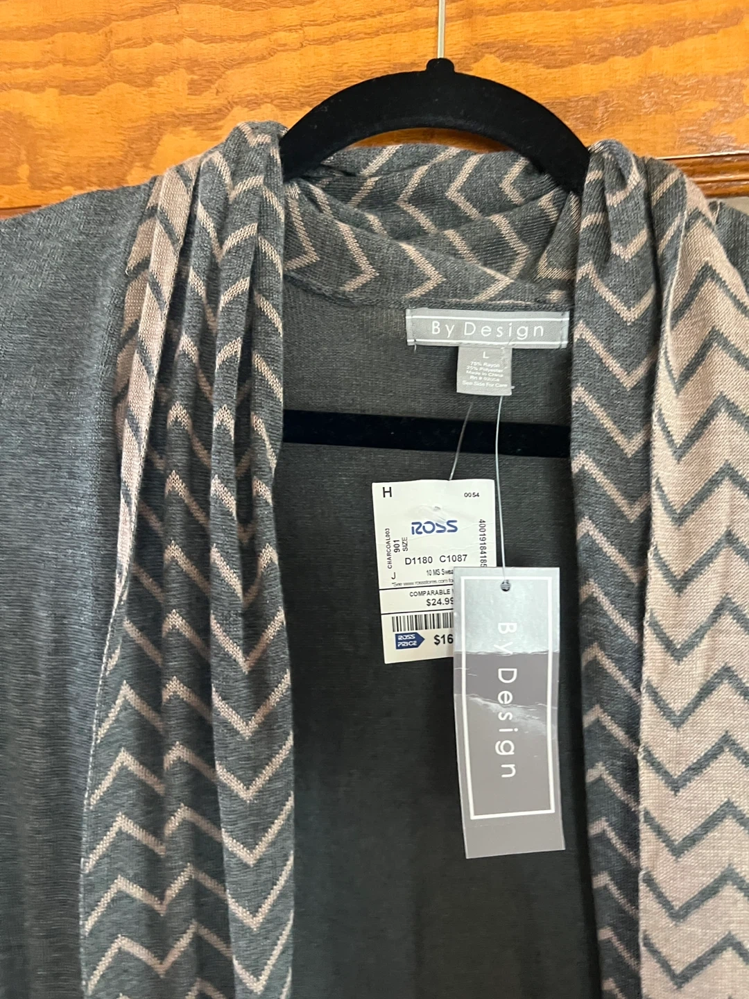 This is a band new women's open-front cardigan from By Design. It's a solid grey with a contrasting tan and grey chevron pattern on the collar and down the front. Made from a polyester and rayon blend. Item comes from a pet and smoke free home. Port Union/401/Pickering for pick up.