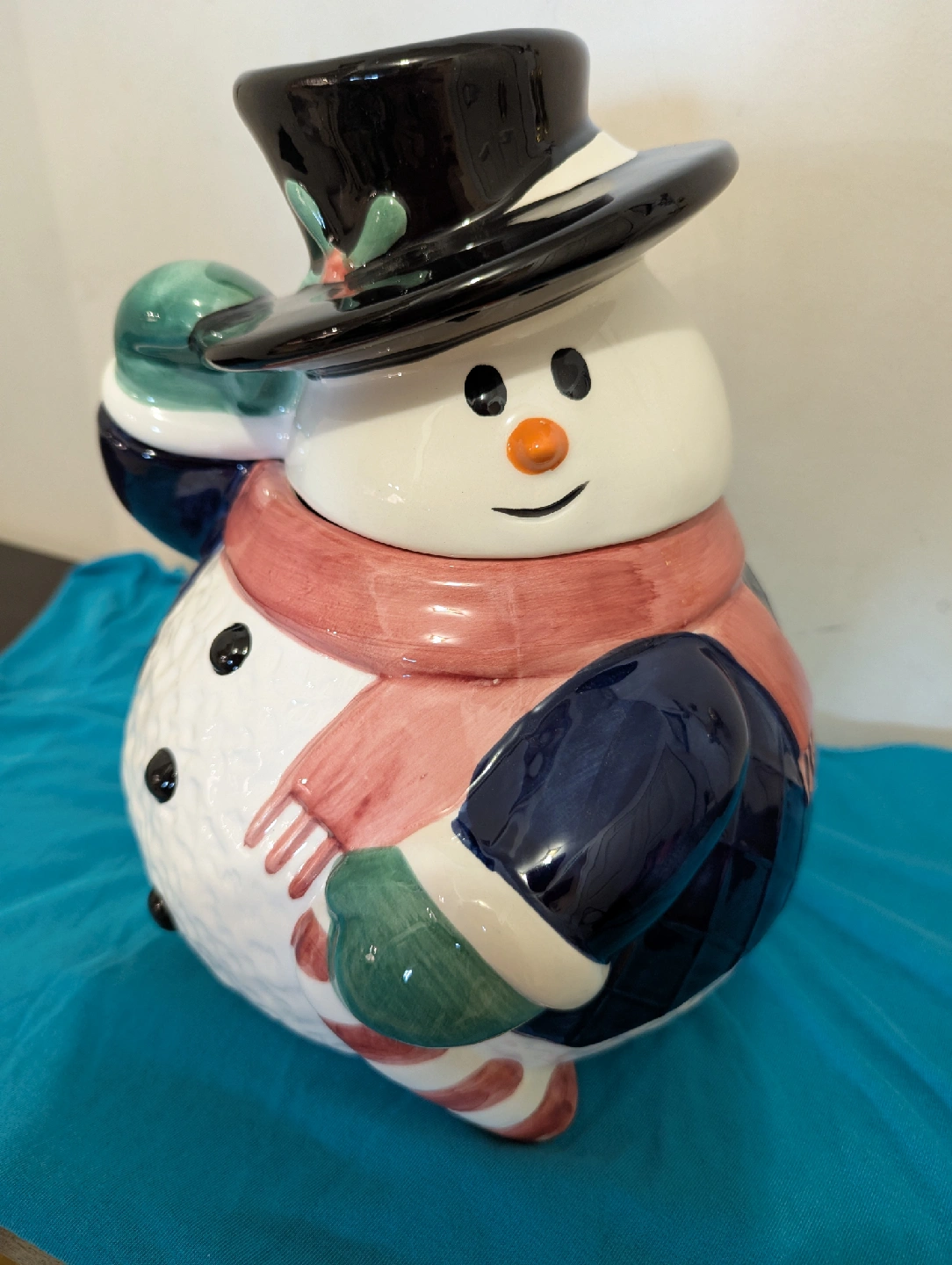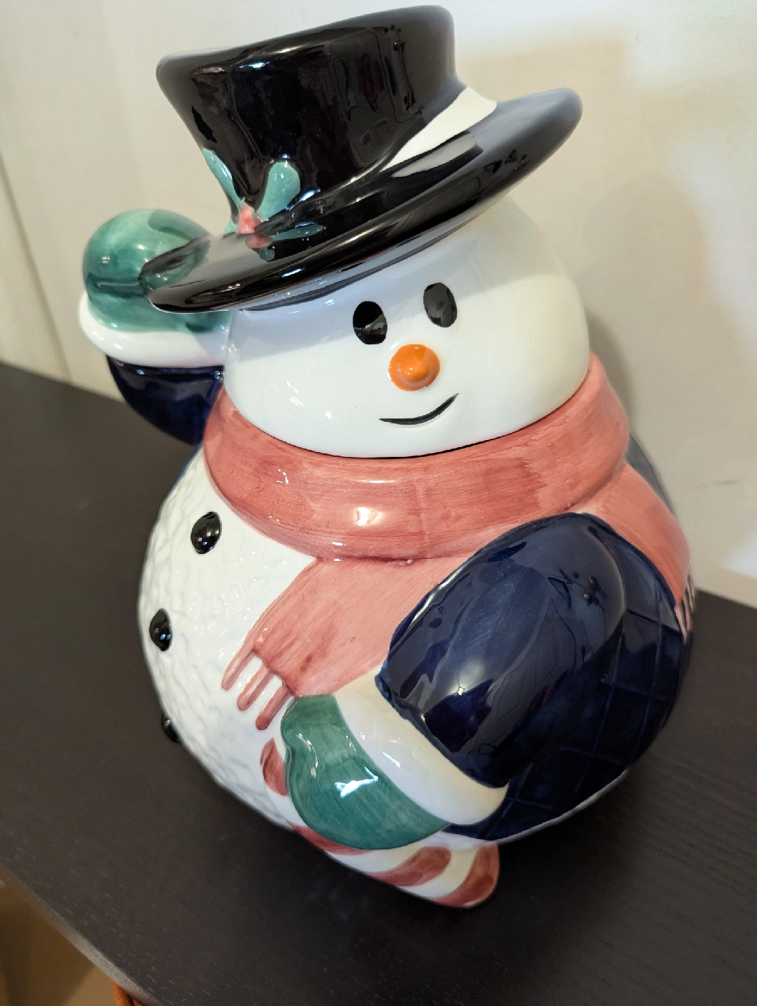 Add a touch of whimsy to your kitchen with this adorable Home Styles ceramic snowman cookie jar! This festive cookie jar is used, but remains in excellent condition. It would be perfect for storing your favourite holiday treats or as a charming decorative piece.