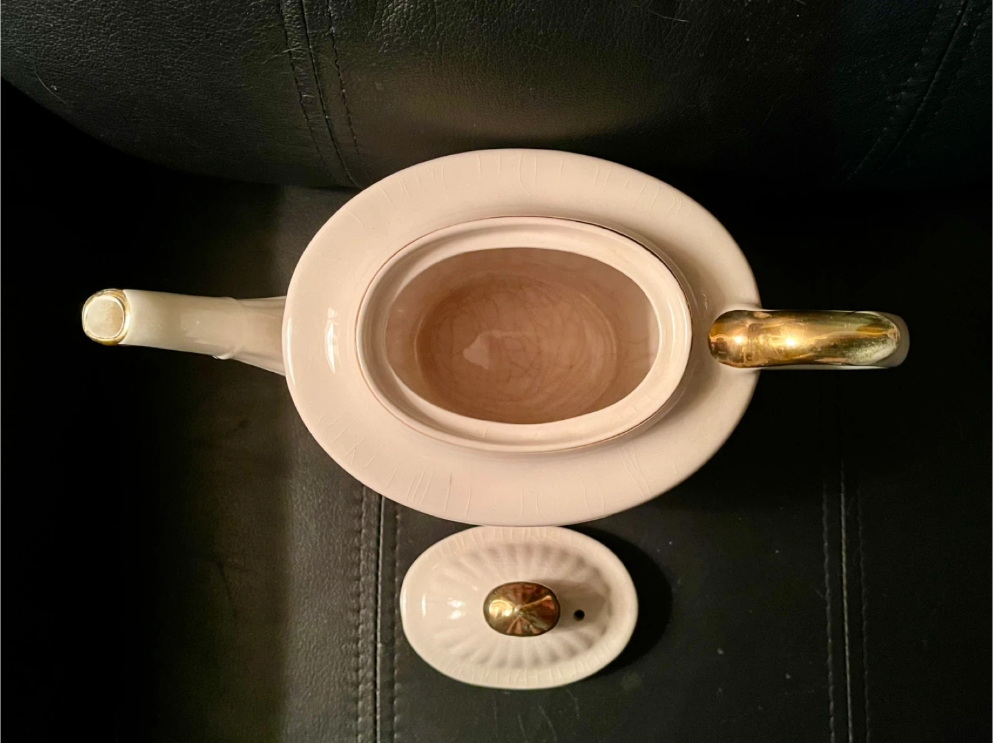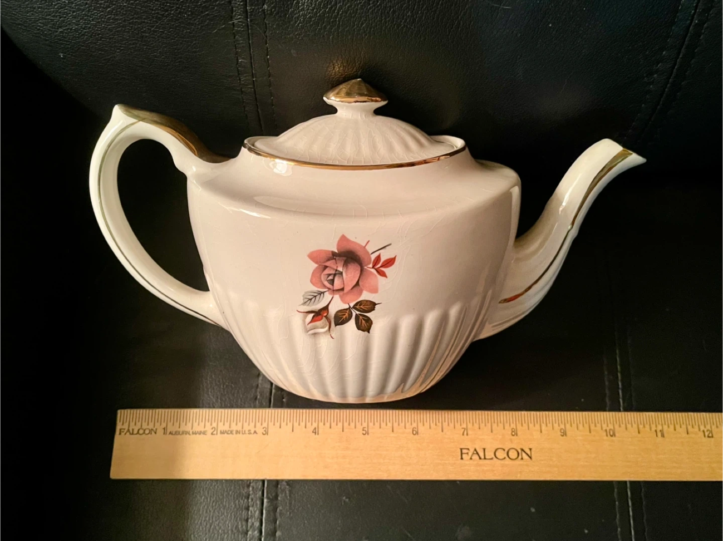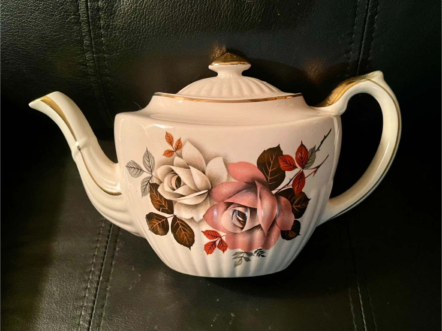Pretty teapot with a floral rose design and gold accents. This teapot is made of ceramic and features a fluted design around the base. It's a lovely piece for display or use. Holds 32 fluid ounces. Very good condition with no visible chips or cracks but has some crazing.