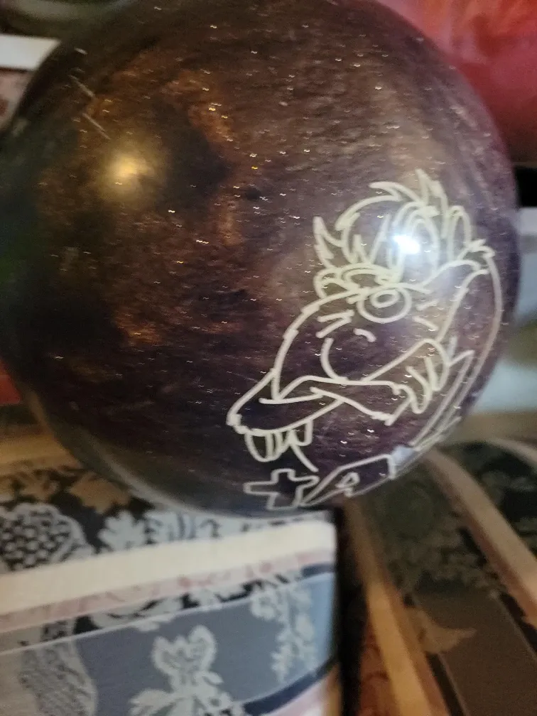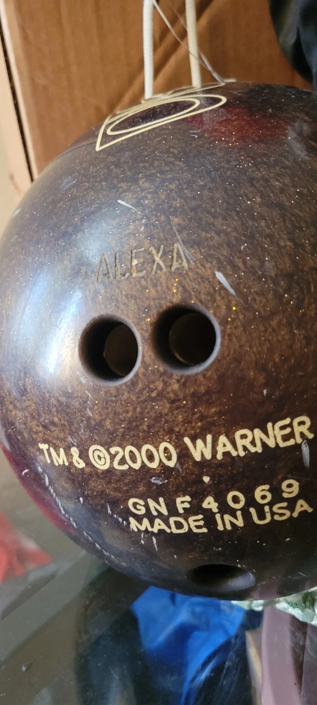 Bowling ball with a unique cartoon character design. Features "ALEXA" imprinted on the surface. Made in USA, manufactured in 2000 by Warner. Great for striking out!