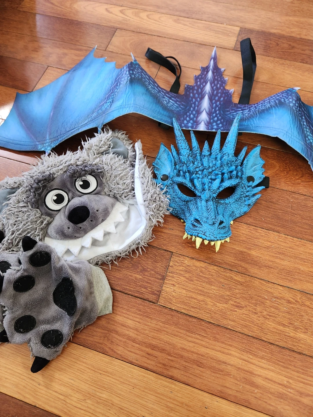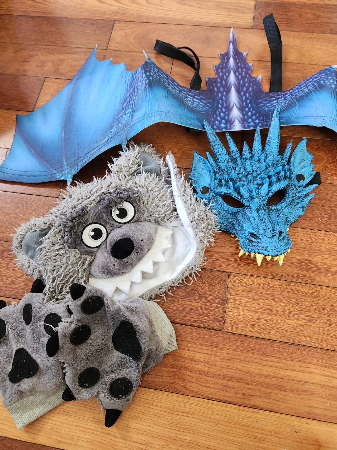 Dragon wings, a dragon mask, and a fuzzy wolf hood with paws. Great for dress-up! The dragon set is new & the wolf set was well loved. Take both for $5