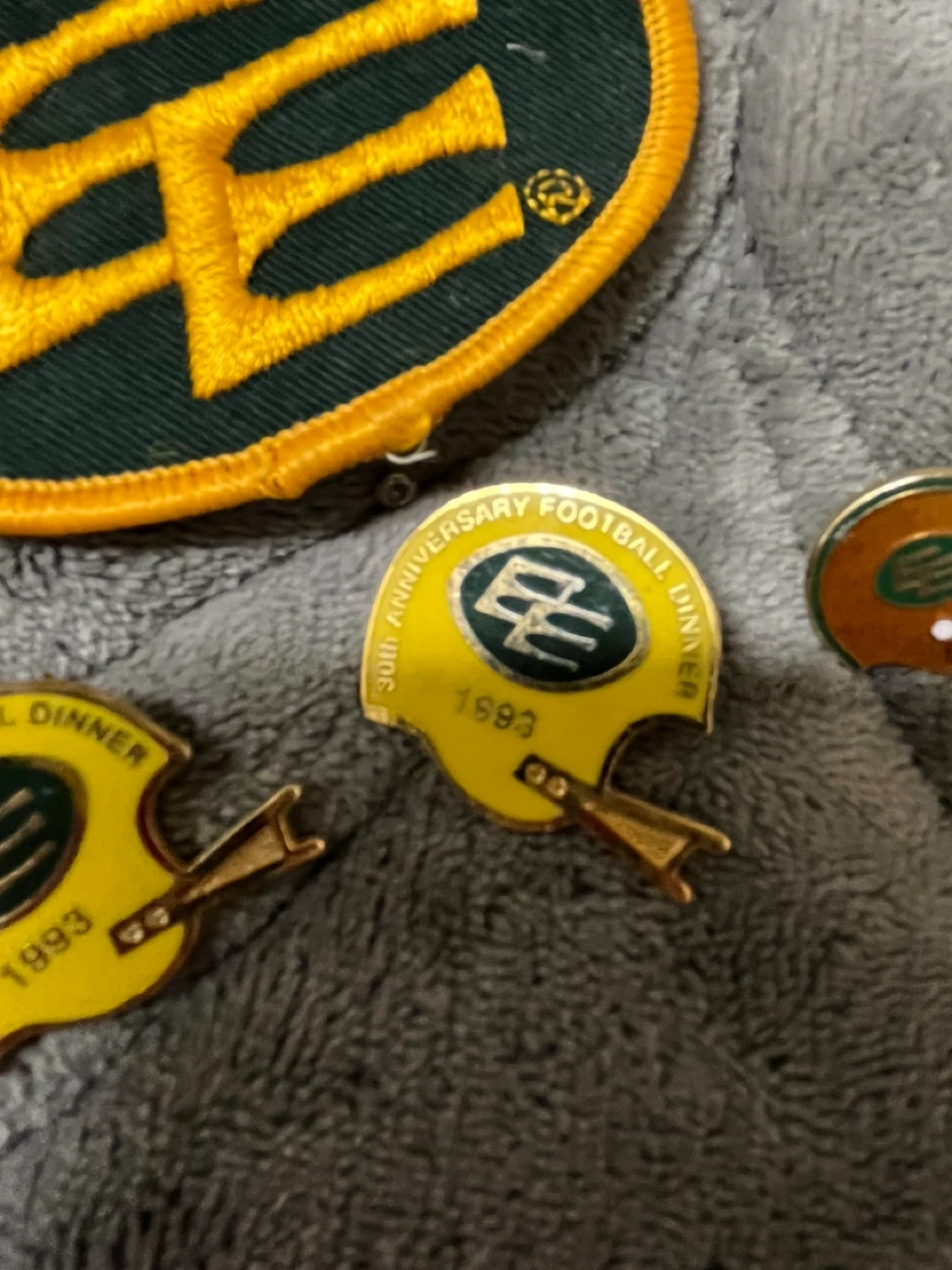 4 pieces of EE football commemorative from the 30th Anniversary Football Dinner in 1993. Features the Edmonton Elks logo and helmet design. Includes one embroidered patch.