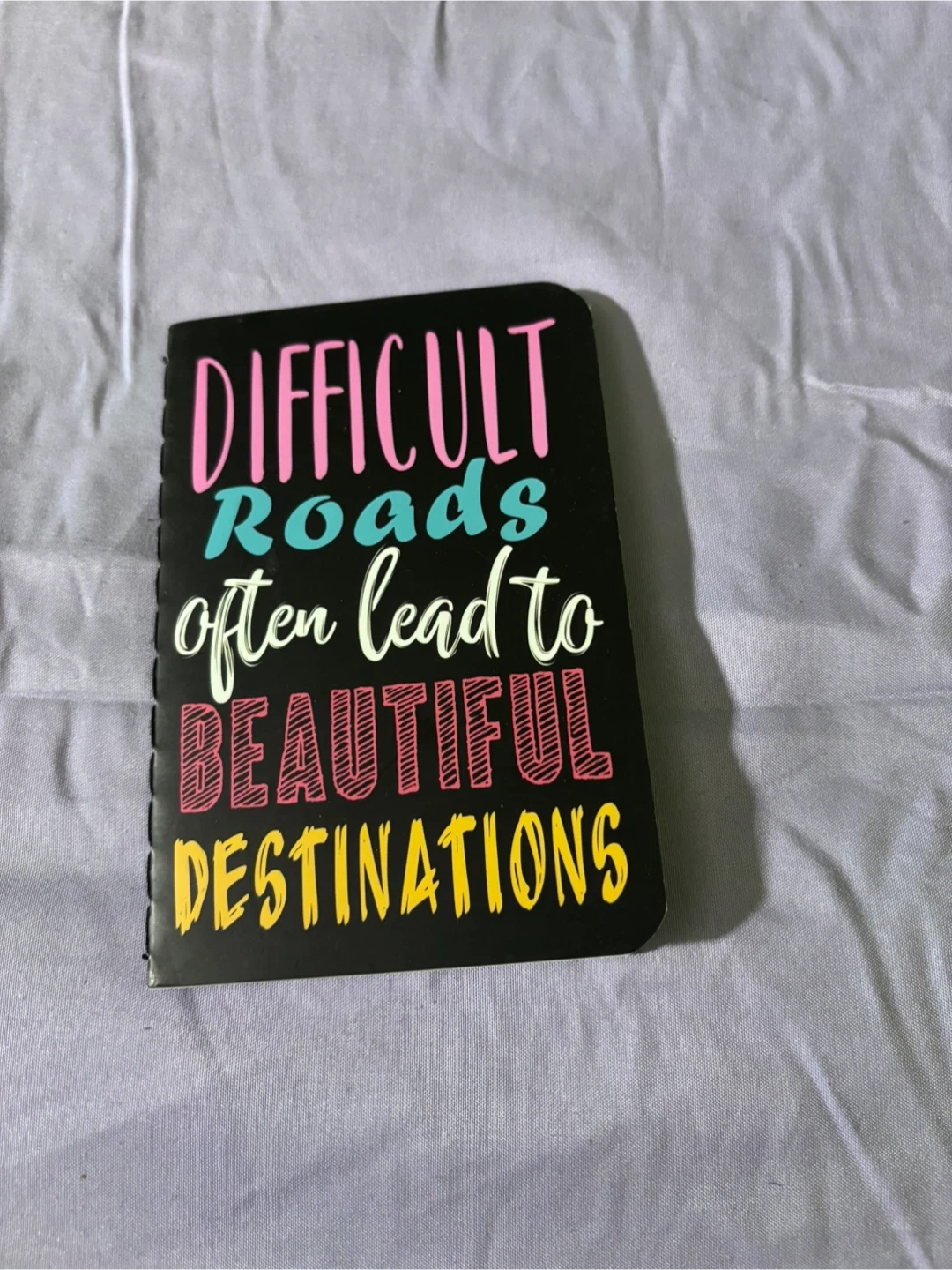 This is a small notebook featuring the quote 'Difficult Roads often lead to Beautiful Destinations'. It has lined pages inside, perfect for jotting down notes. Its compact size makes it easy to carry anywhere!