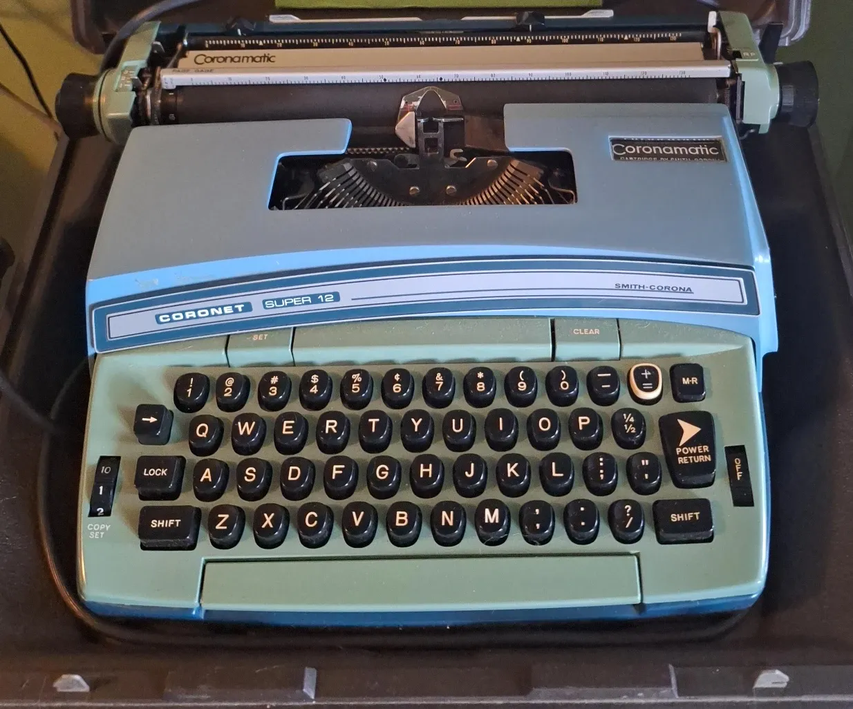 This is a Smith-Corona Coronet Super 12 typewriter. It features the Coronamatic cartridge system. Teal and mint green color scheme.