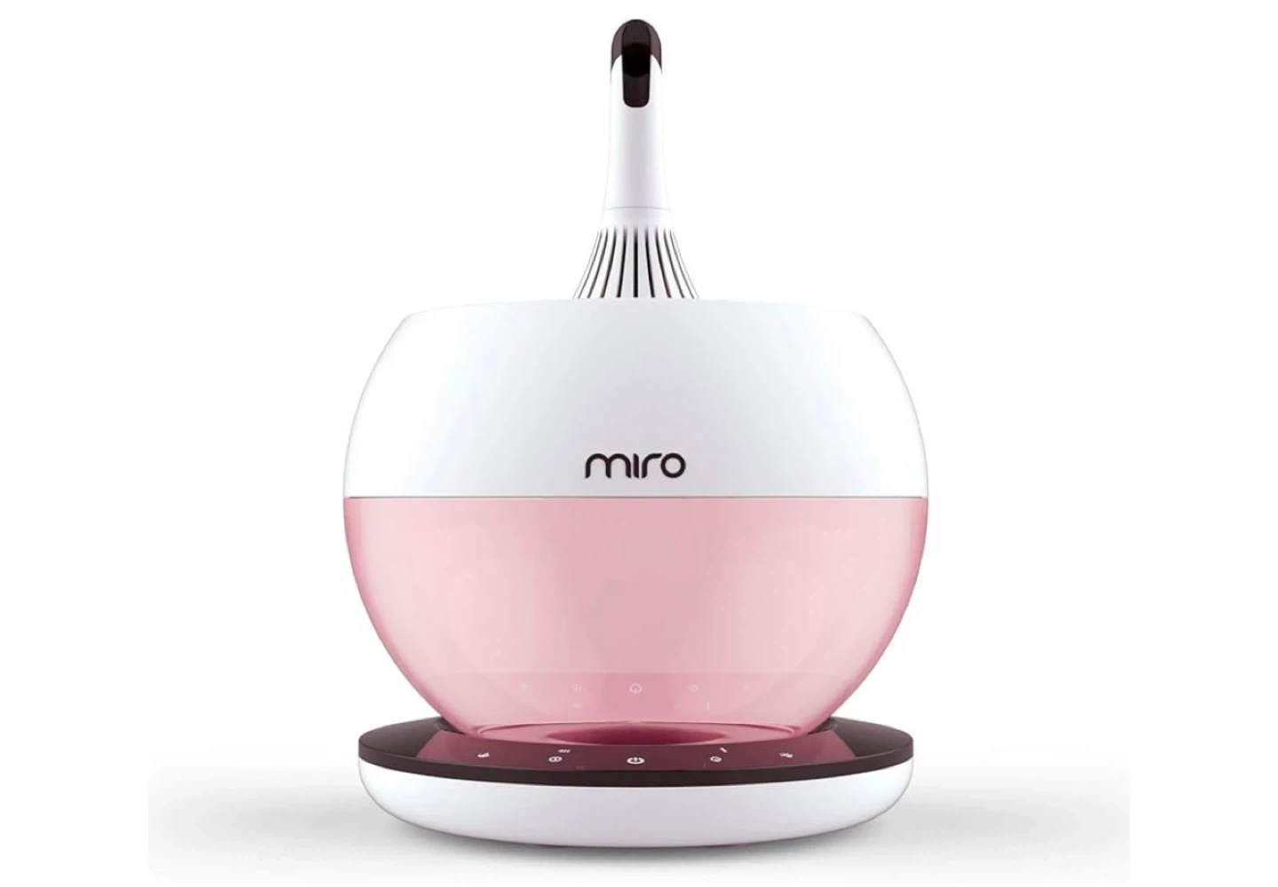 This Miro aroma diffuser has a modern spherical design with a white top and a translucent pink water reservoir. It features a swan-like mist outlet and a touch-sensitive base with multiple control icons. A stylish addition to any room!