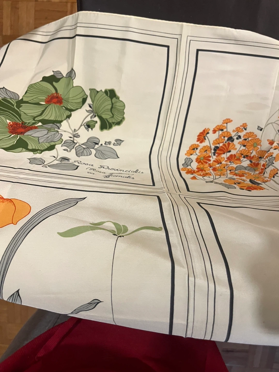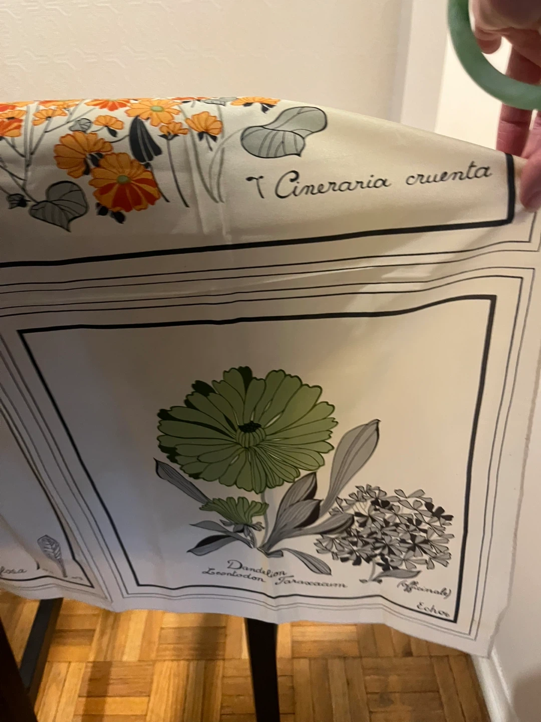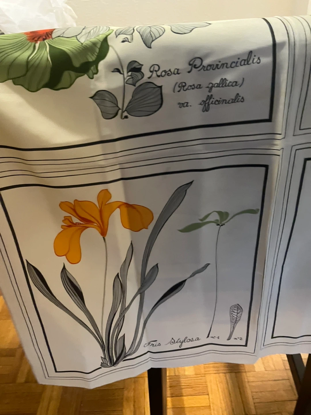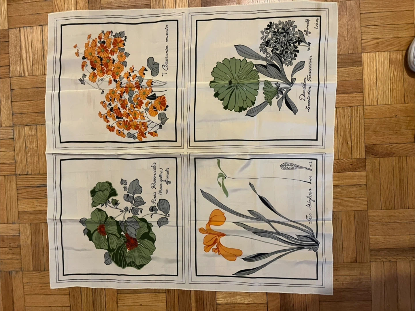 This scarf features a beautiful botanical print with illustrations of various flowers. It includes detailed depictions of Cineraria cruenta, Dandelion, Rosa Provincialis, and Iris Stylosa. The fabric feels like silk and it's a great piece for anyone who loves floral designs.