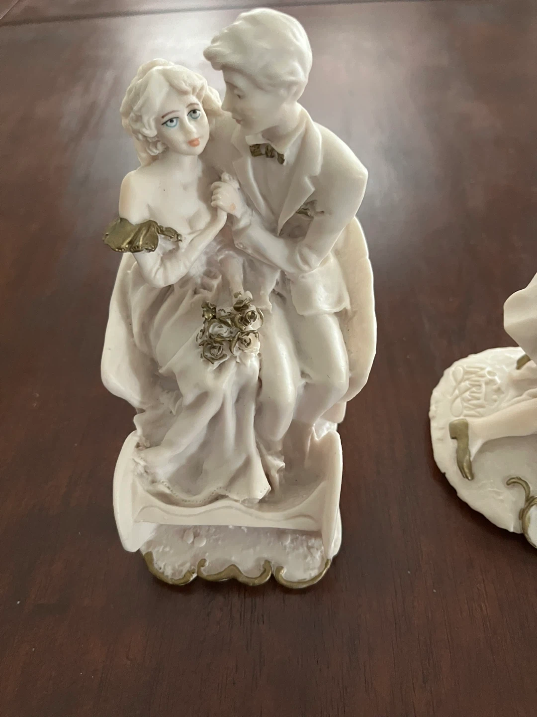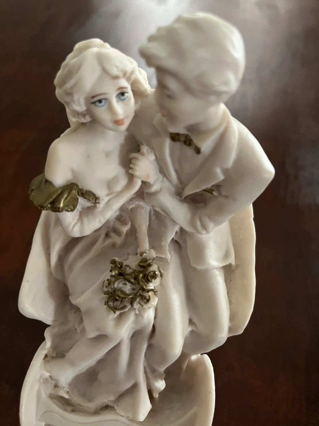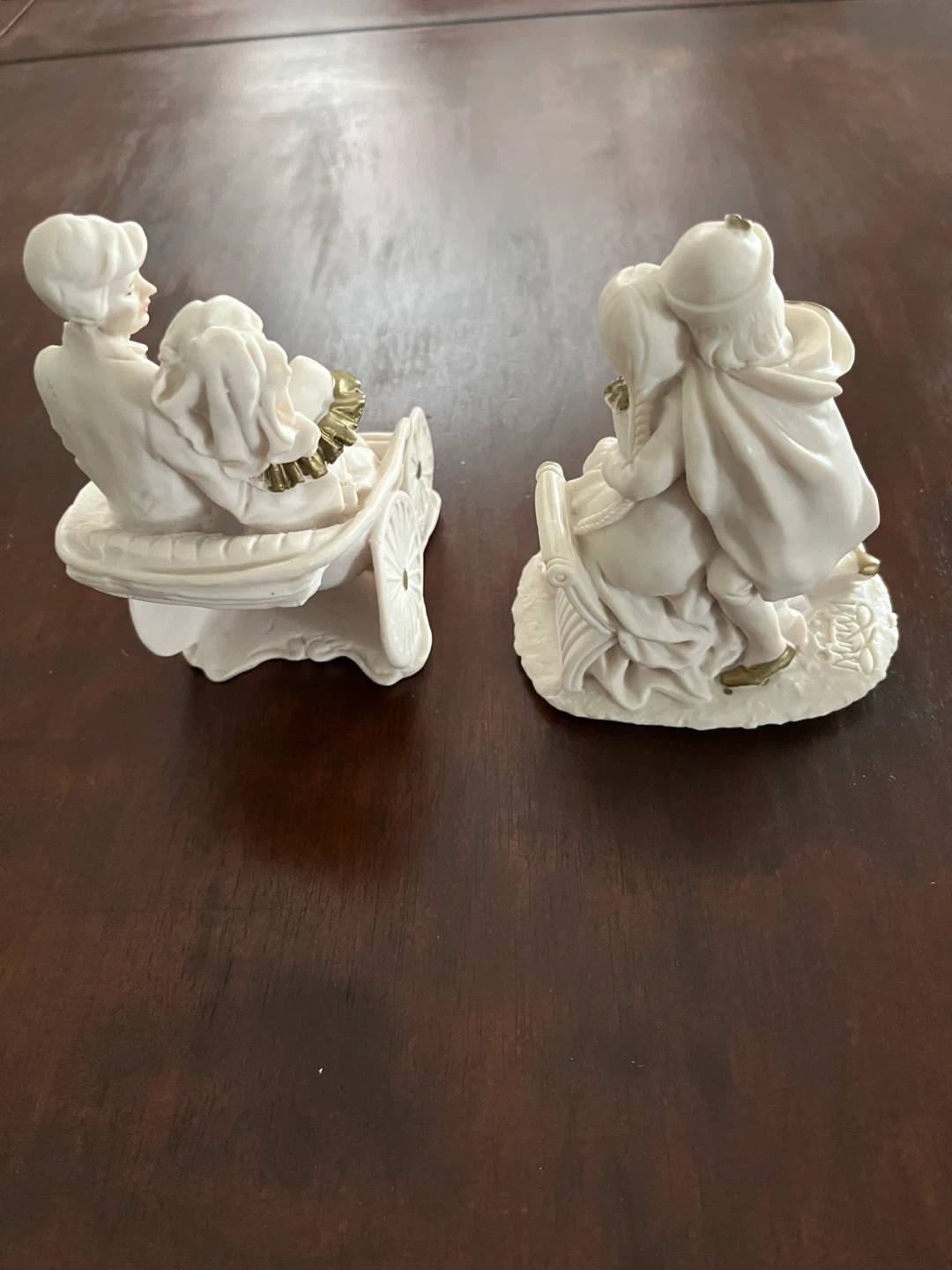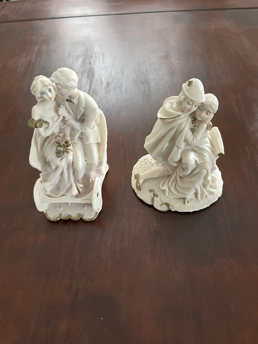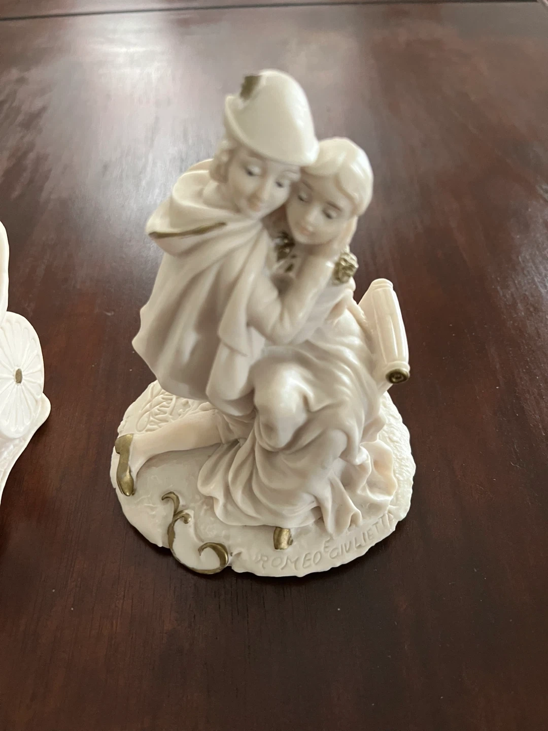 A pair of decorative figurines depicting Romeo and Juliet. The larger figurine is seated in a carriage, while the smaller one is embracing a companion. They are made of a cream-coloured material with gold accents. Some text is visible on the base of the embracing couple figurine, possibly indicating 'Romeo e Giulietta', 5.5 inches tall.