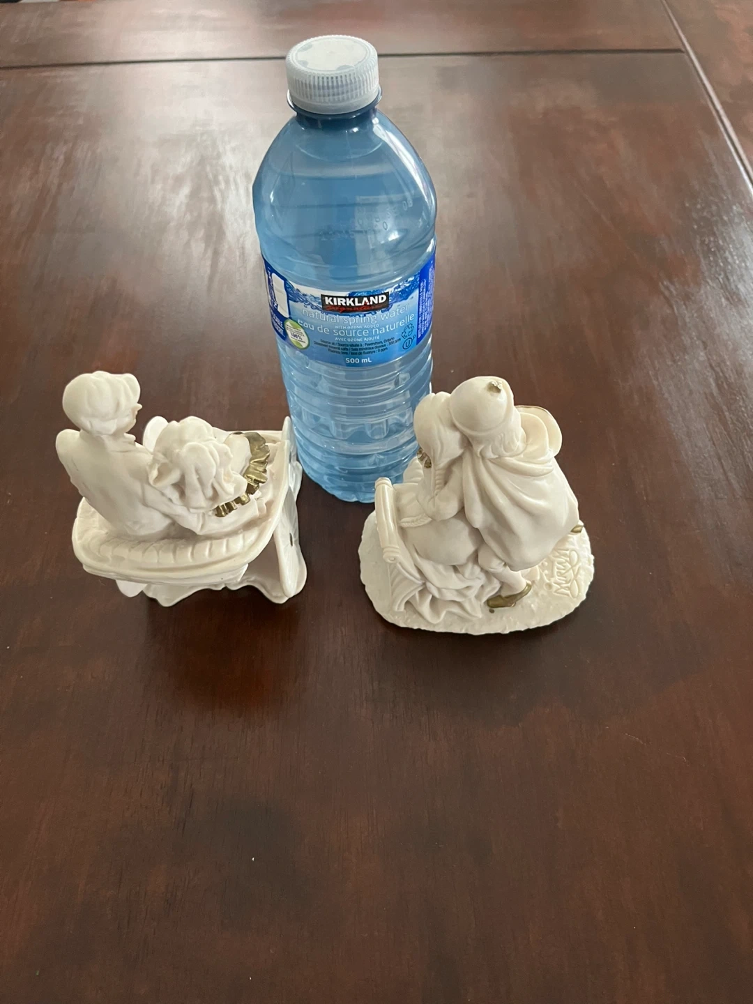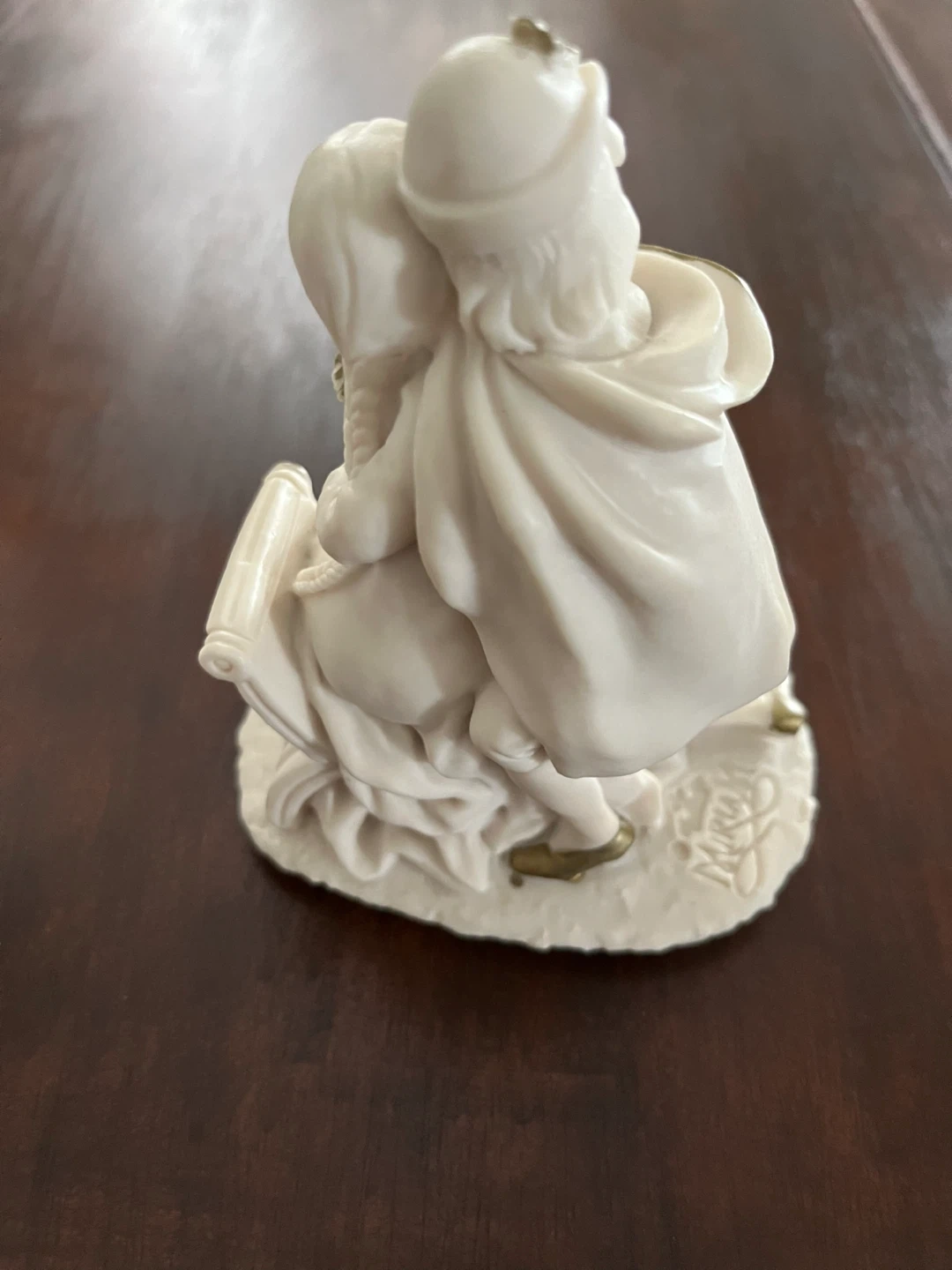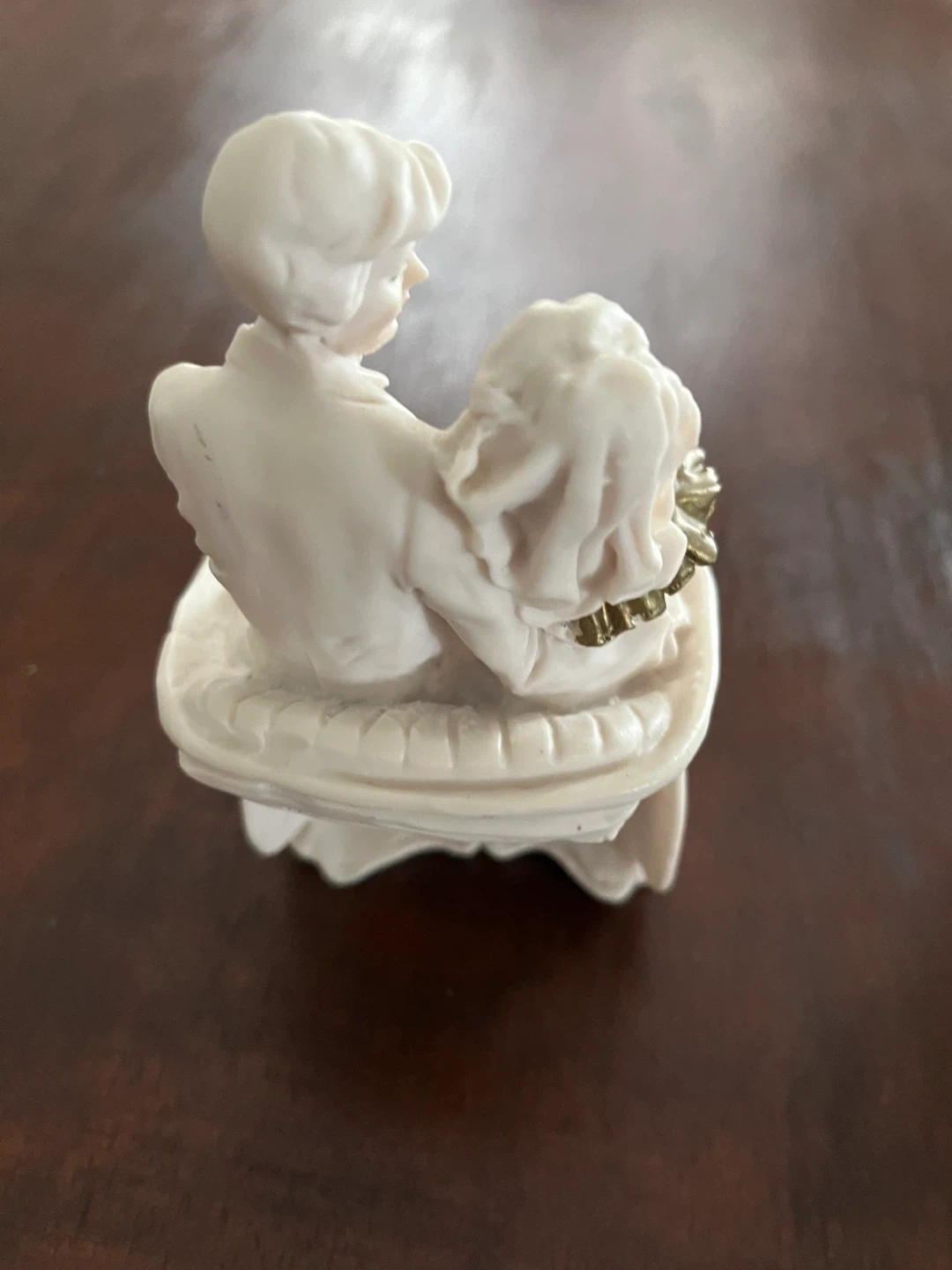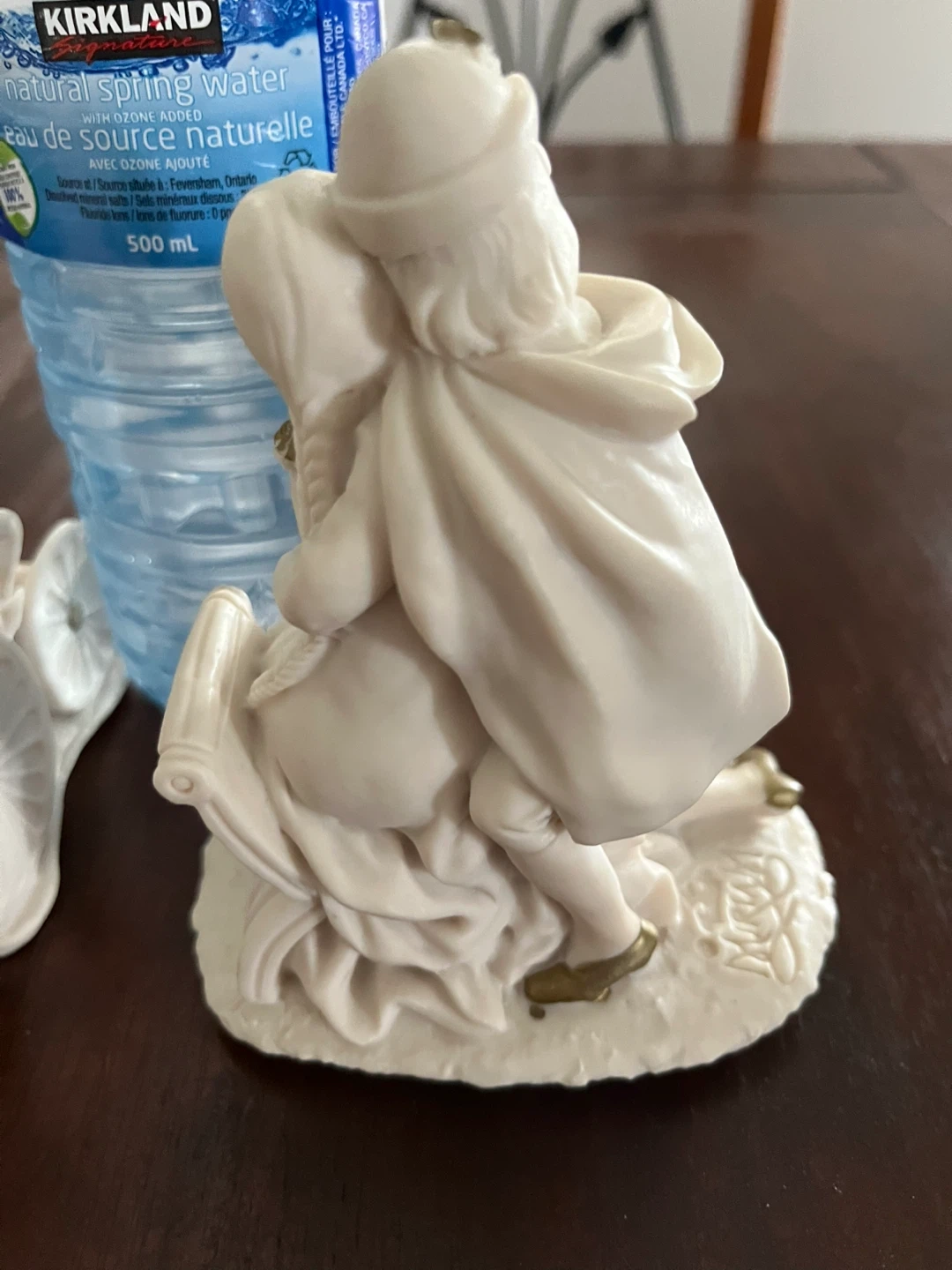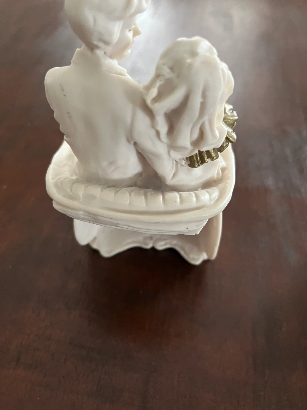 A pair of decorative figurines depicting Romeo and Juliet. The larger figurine is seated in a carriage, while the smaller one is embracing a companion. They are made of a cream-coloured material with gold accents. Some text is visible on the base of the embracing couple figurine, possibly indicating 'Romeo e Giulietta', 5.5 inches tall.