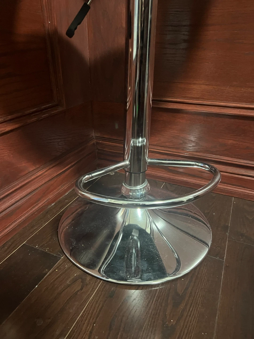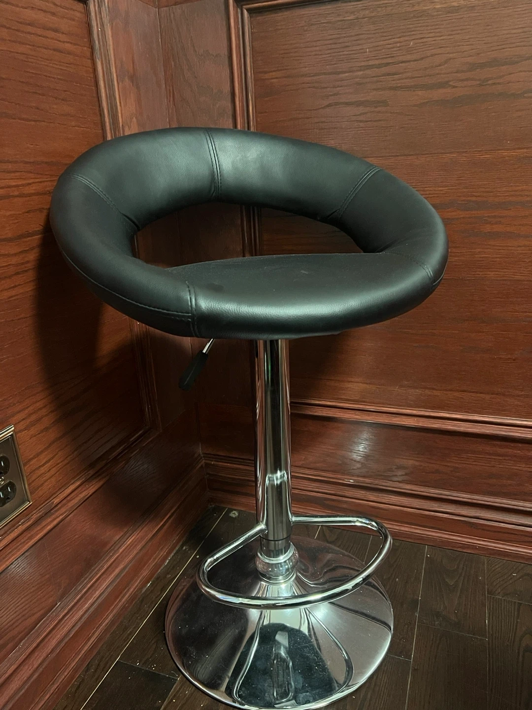 This is a black faux leather adjustable bar stool with a chrome base. It's comfortable and stylish for any kitchen or bar area. Features a swivel seat and adjustable height lever.