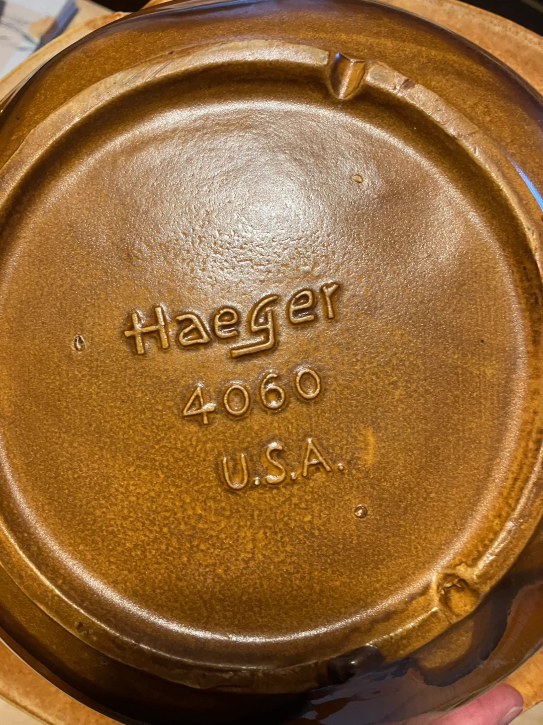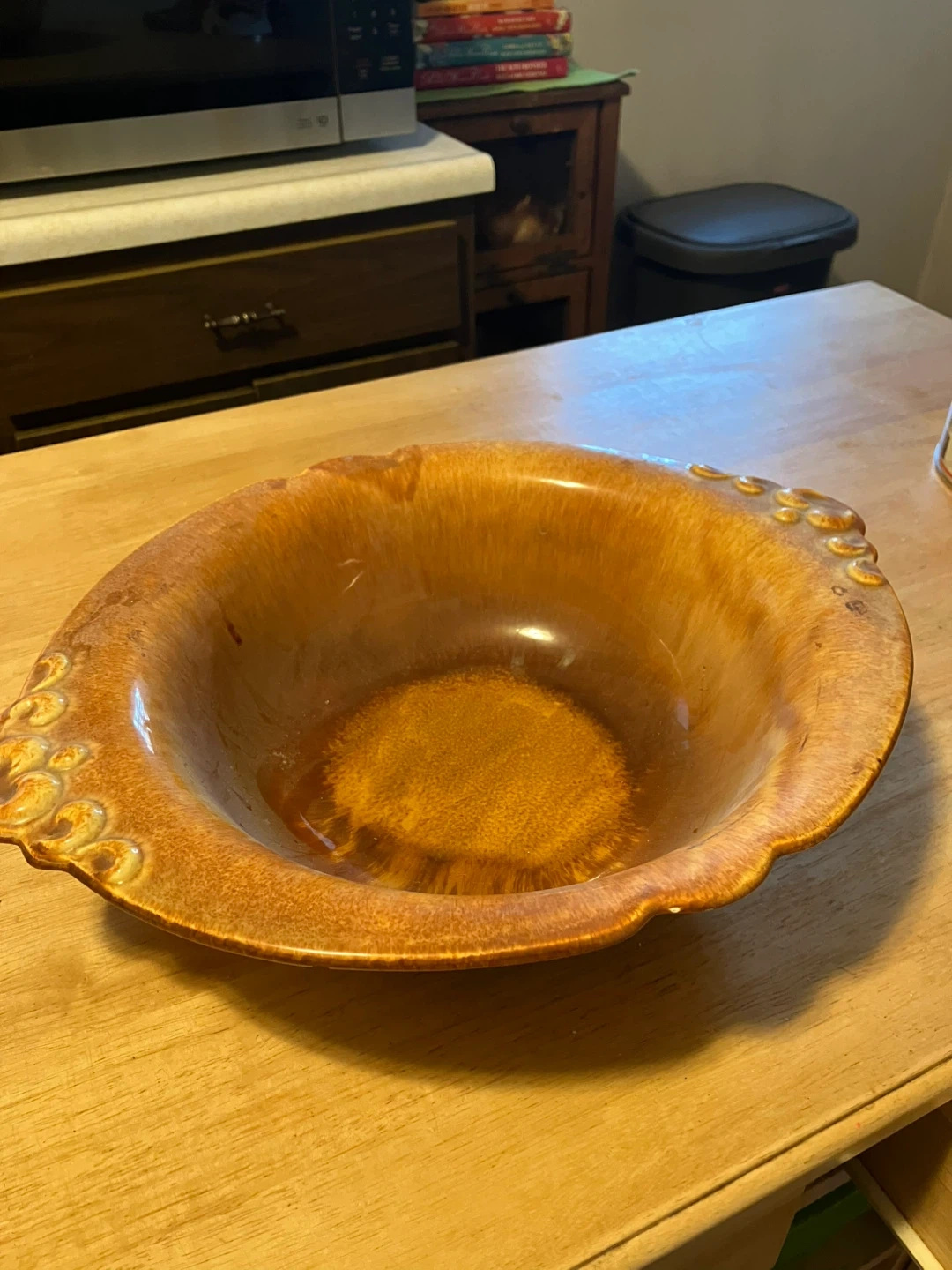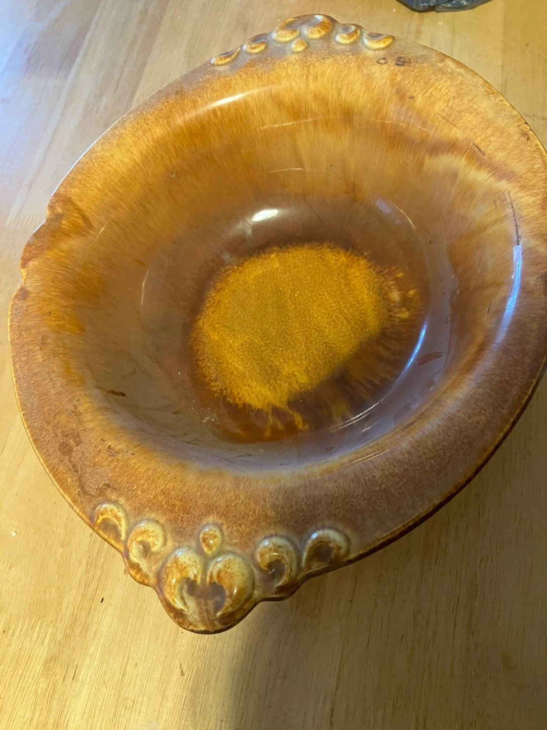 Vintage Haeger USA ceramic serving bowl. Model 4060. Amber glaze finish. This decorative piece adds a touch of retro charm to any home. It's a substantial size for salads or as a centerpiece.