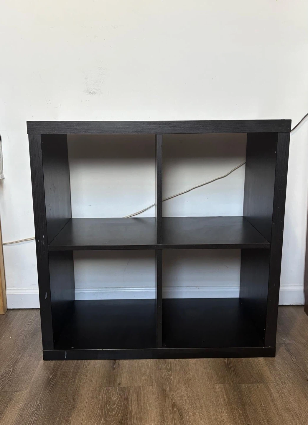 This black storage shelf has four cube compartments. It's made of wood composite material. This unit is great for organizing books or displaying items!