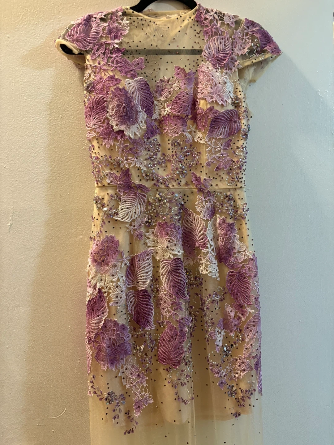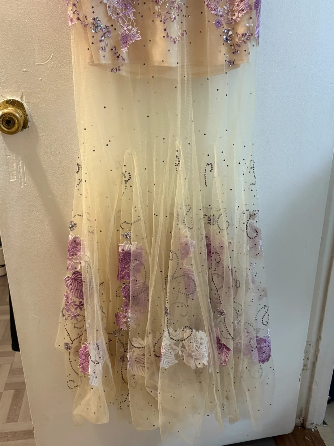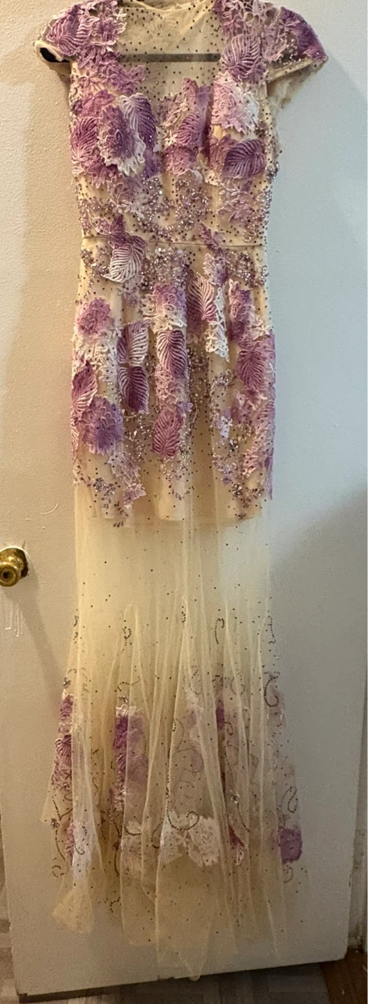 Exquisite sleeveless gown with intricate purple and white floral appliques and scattered beadwork throughout. Sheer tulle overlay with a delicate, flowy skirt. This dress is perfect for formal events or galas! Only worn once