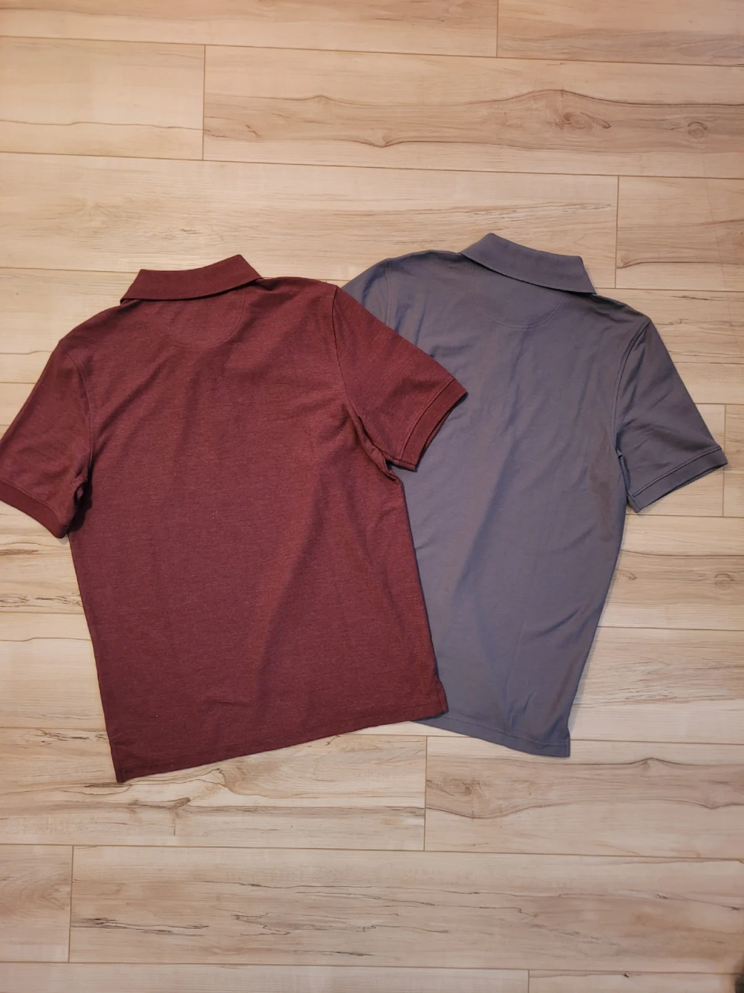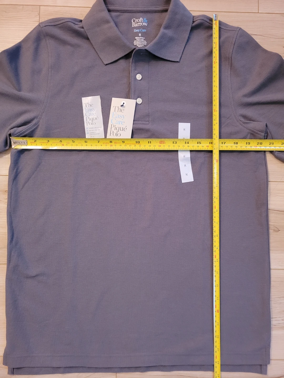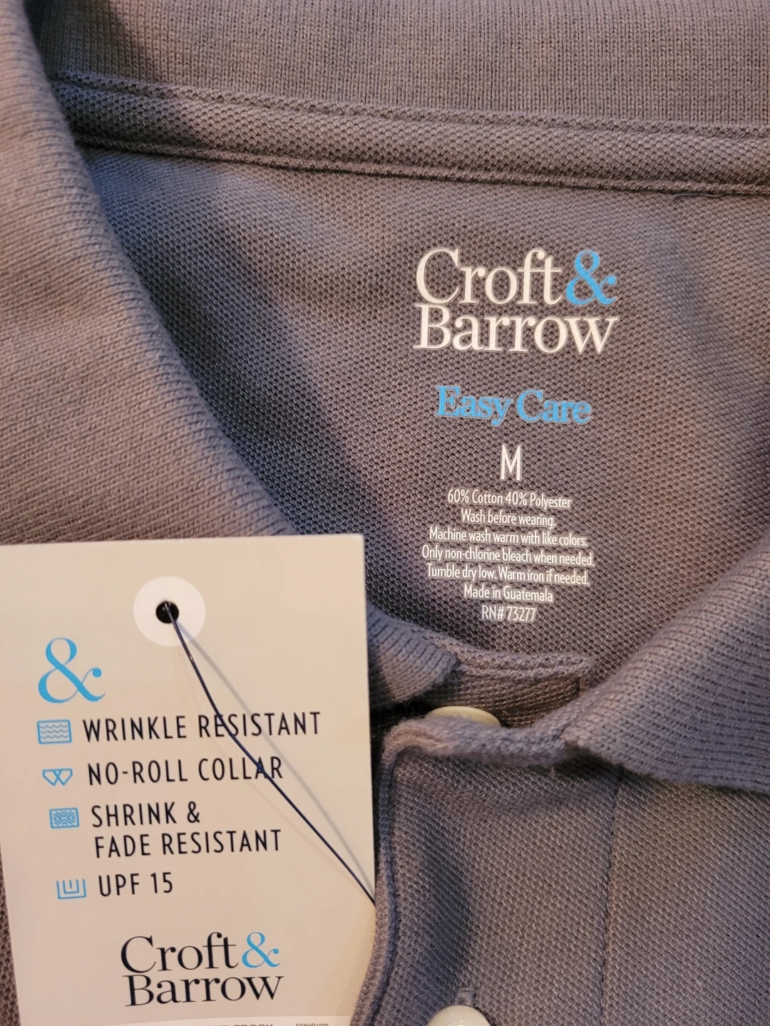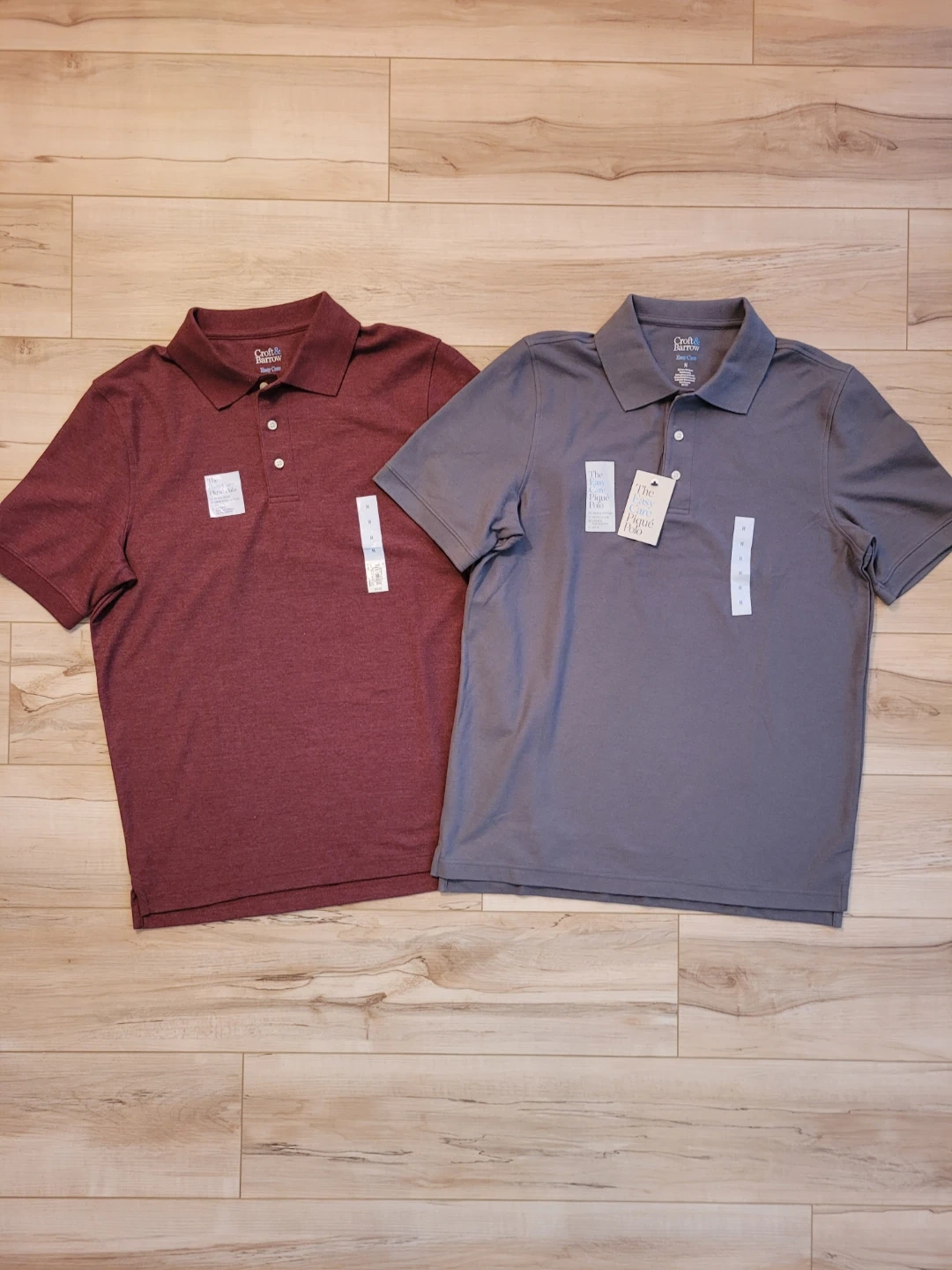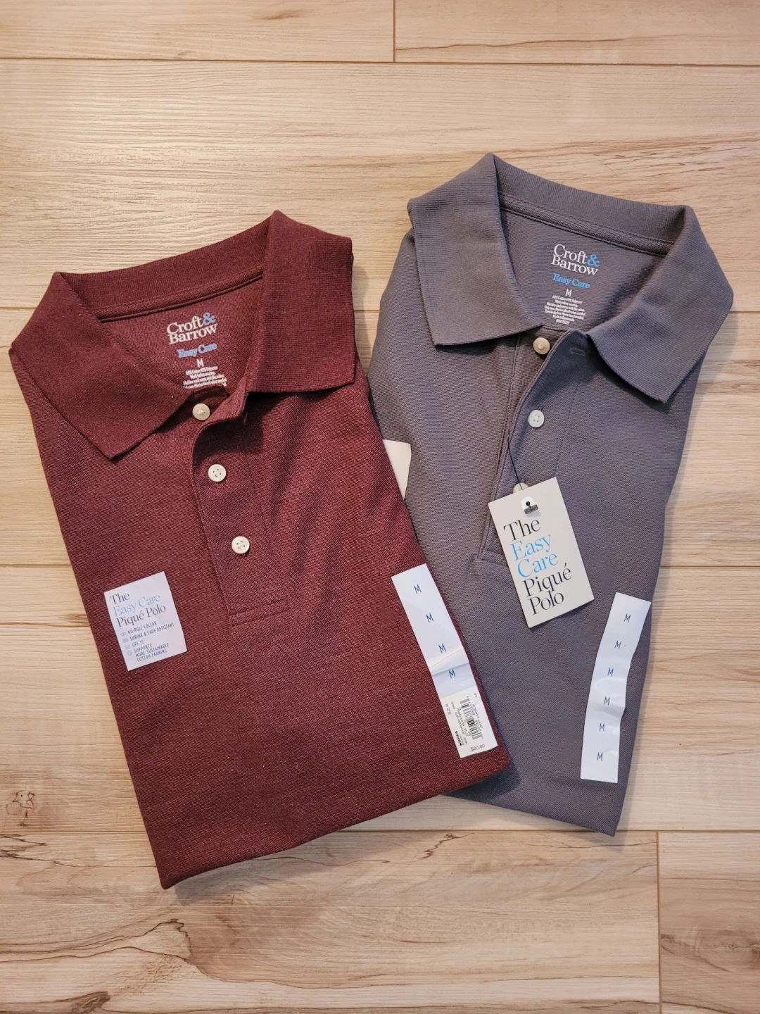 Two New Croft & Barrow Easy Care Pique Polo shirts in size medium both together for price. One is maroon, the other is gray. They're made with a 60% cotton and 40% polyester blend. These polos feature a no-roll collar and are shrink & fade resistant with UPF 15 protection.