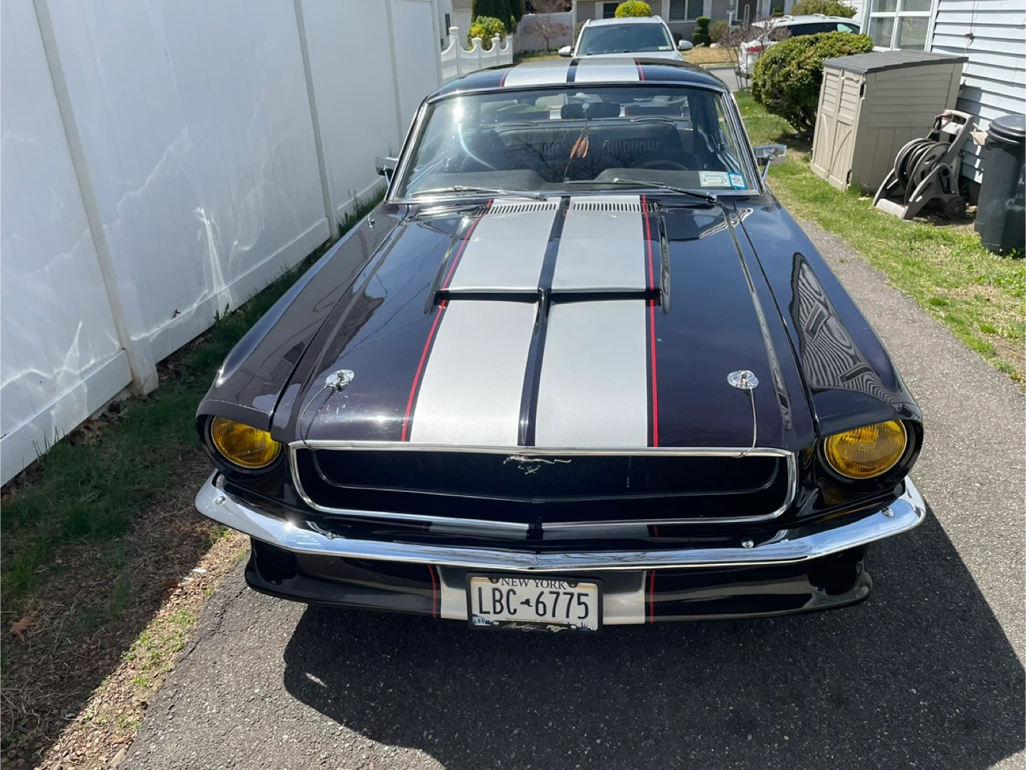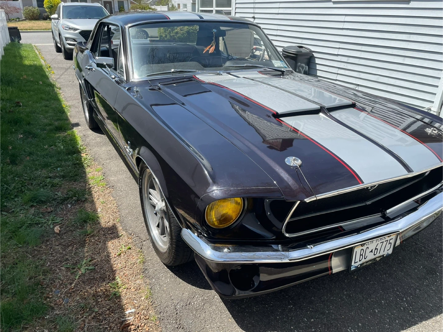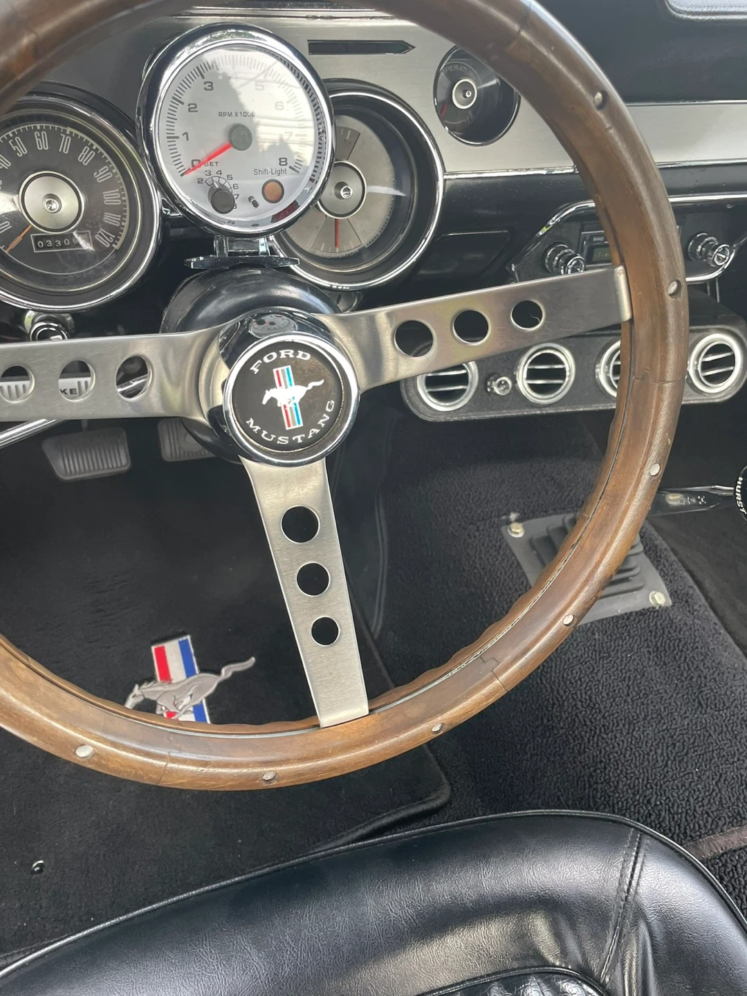 Classic Ford Mustang. Dark metallic paint with silver and red racing stripes. Black interior with wood steering wheel. Ready for a new owner!