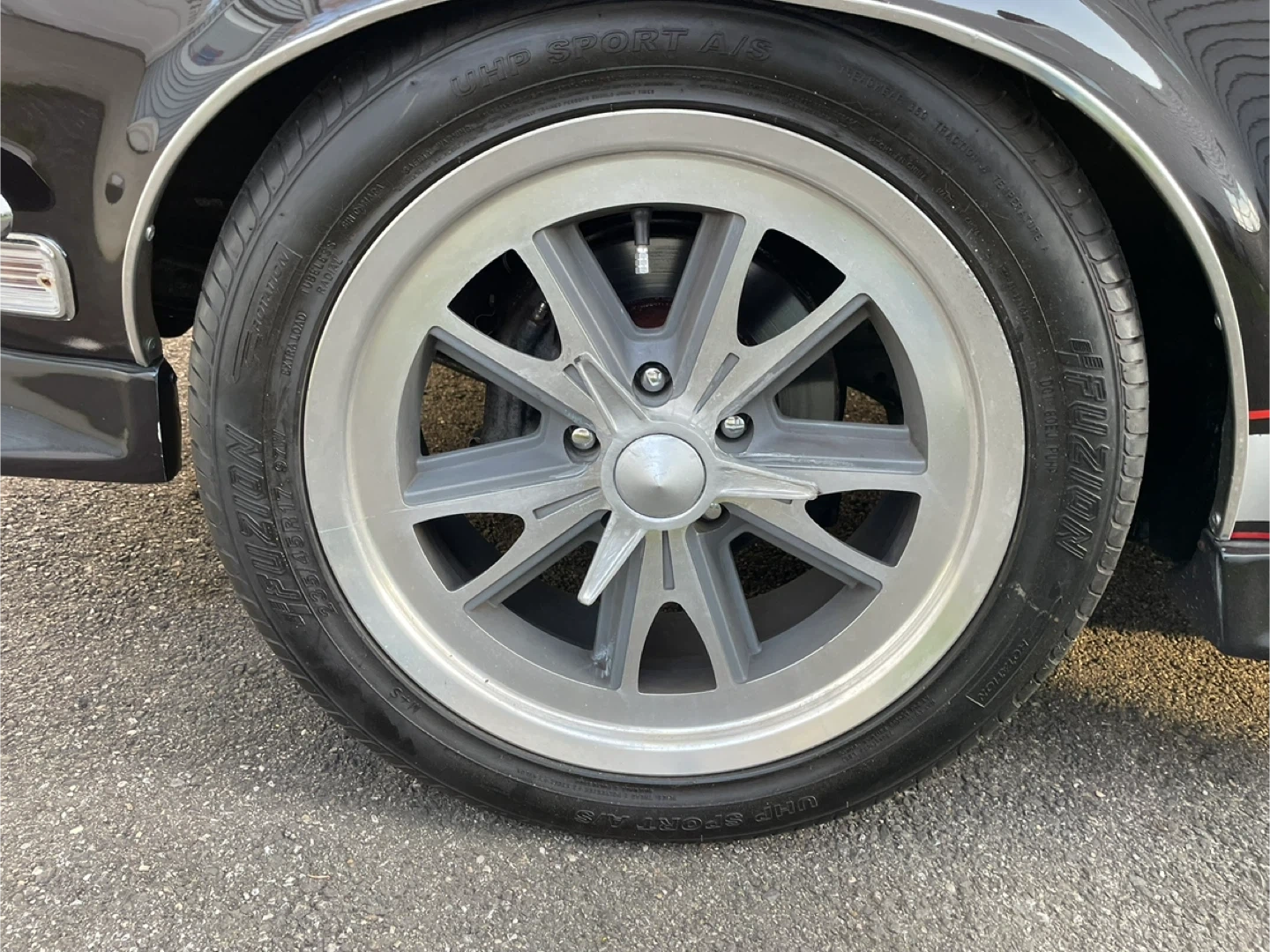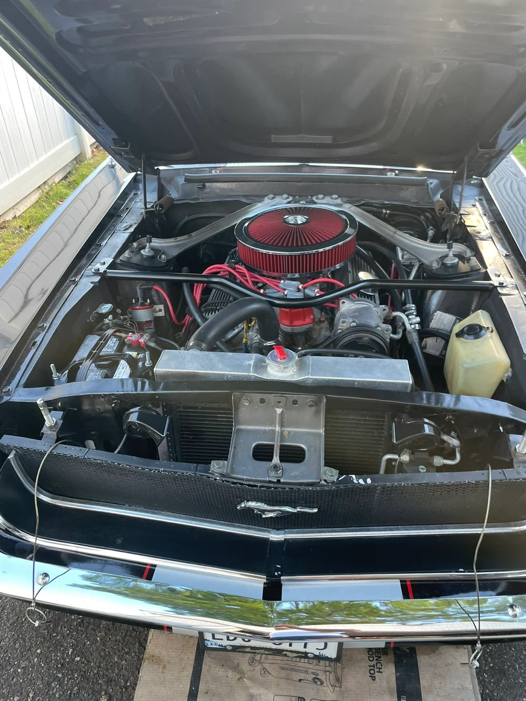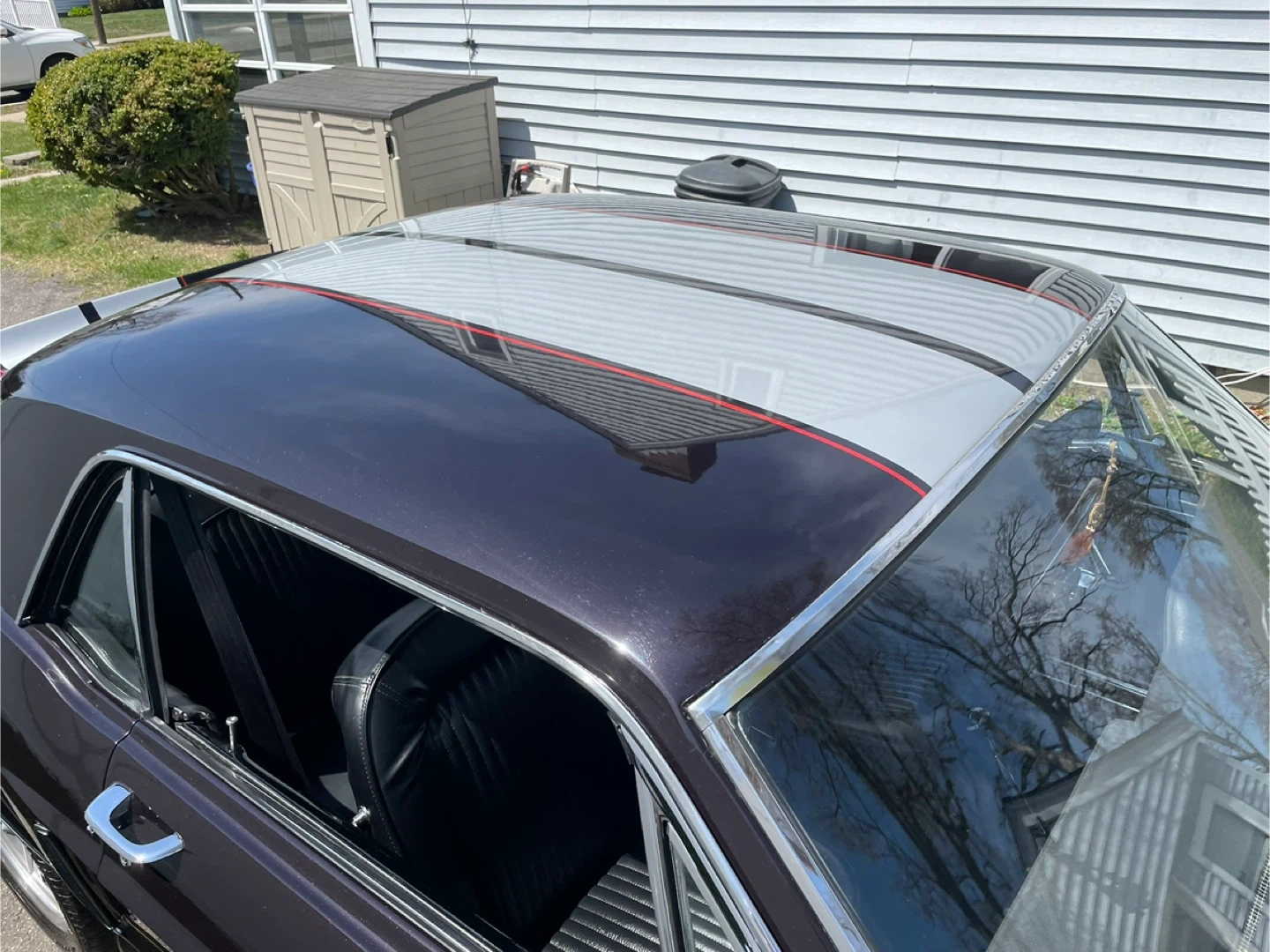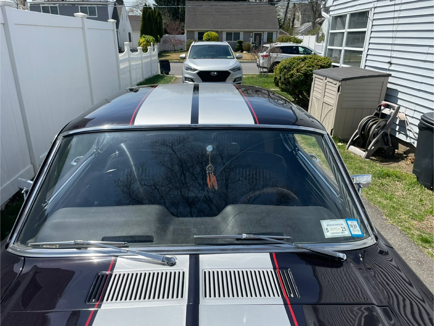 Classic Ford Mustang. Dark metallic paint with silver and red racing stripes. Black interior with wood steering wheel. Ready for a new owner!