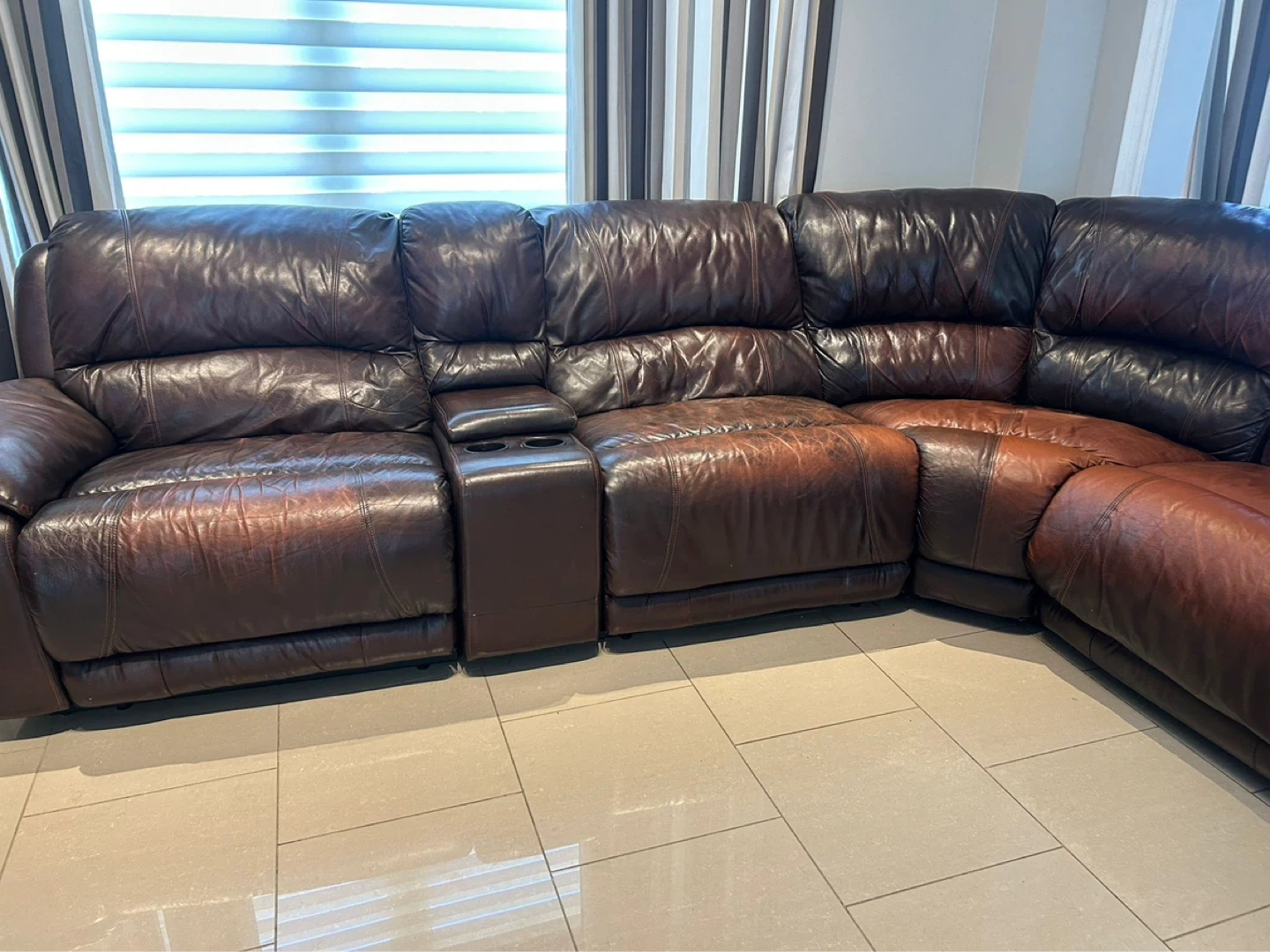 This is a brown leather reclining sectional sofa. It's a corner unit with multiple seating sections and a built-in cup holder console. Plenty of space for the whole family to get comfy!