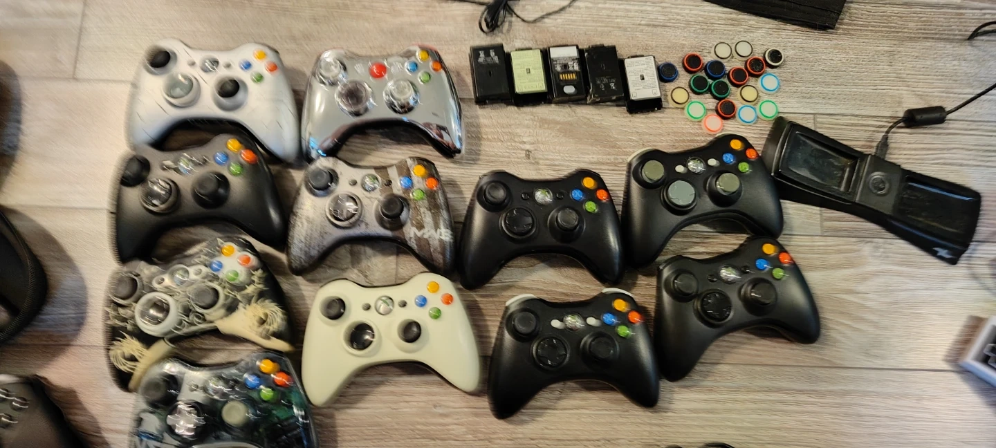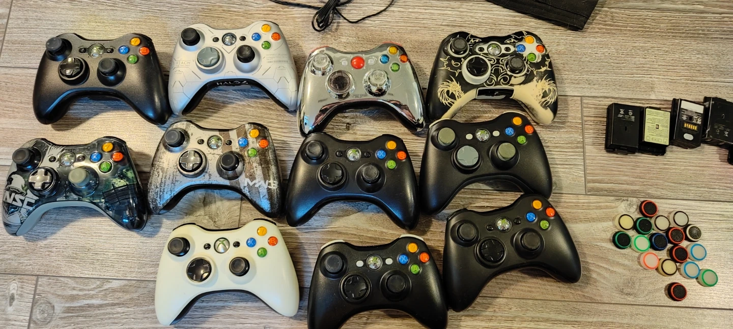 Selling a variety of Xbox 360 controllers in various styles and colours. Also includes accessories like batteries, controller grips, and a charging station! Perfect for expanding your collection or replacing worn-out controllers