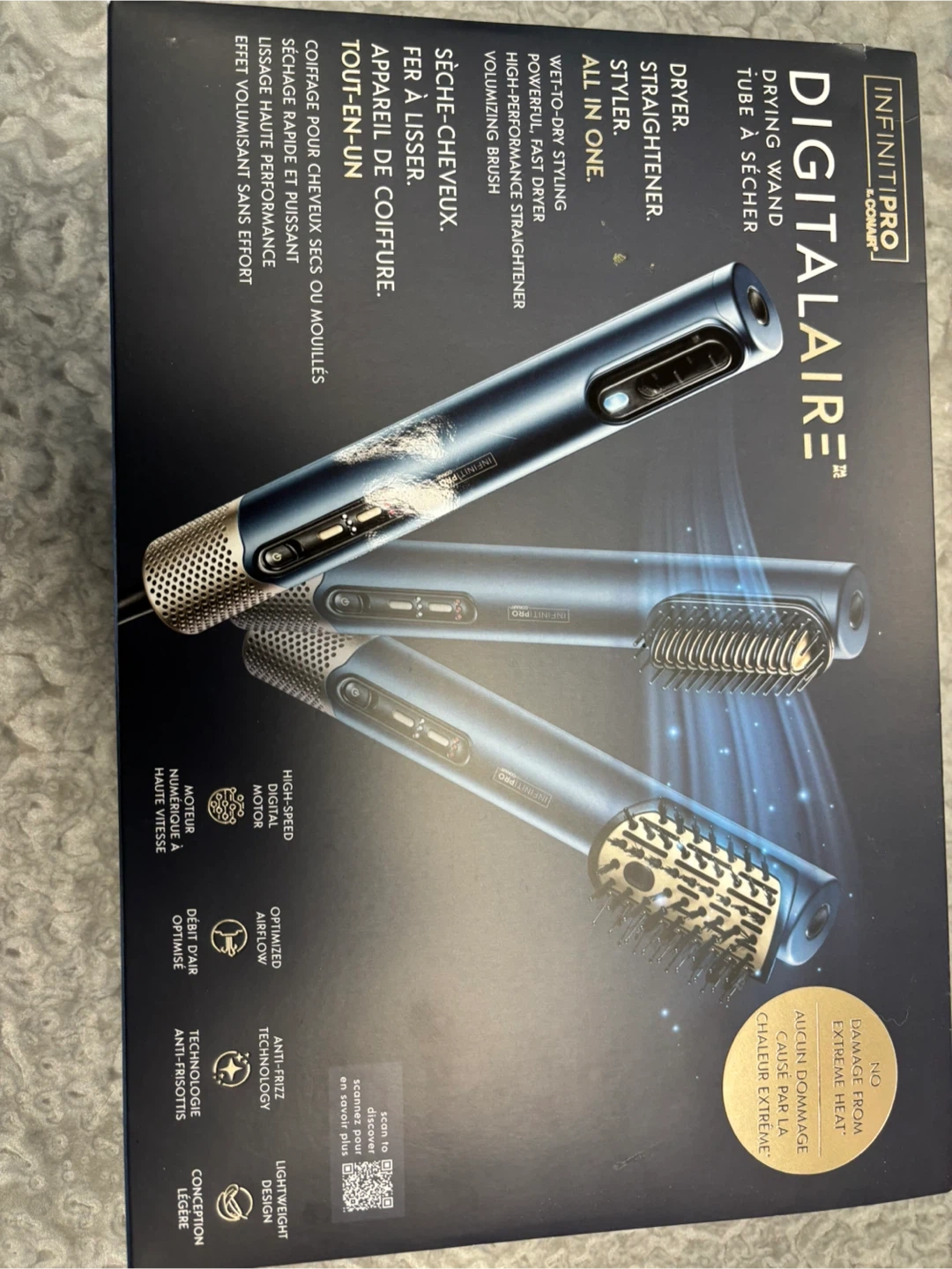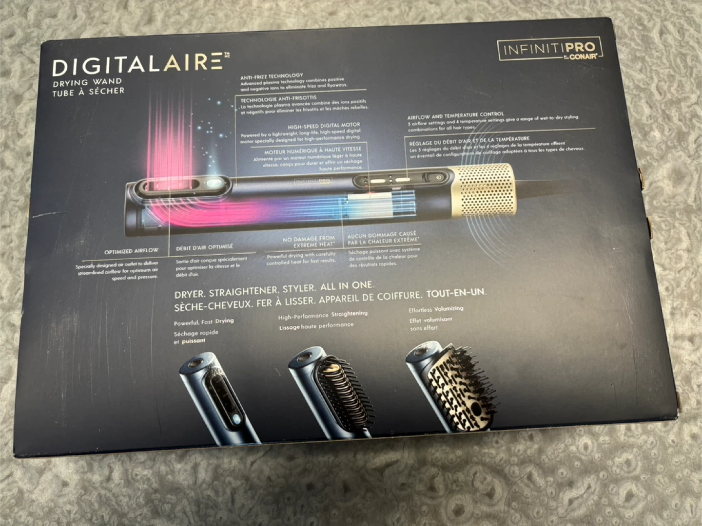 This all-in-one styling tool works as a dryer, straightener, and styler. It features a high-speed digital motor and anti-frizz technology for powerful, fast drying. Includes 1 drying wand and 2 attachments.Brand new. Never used.