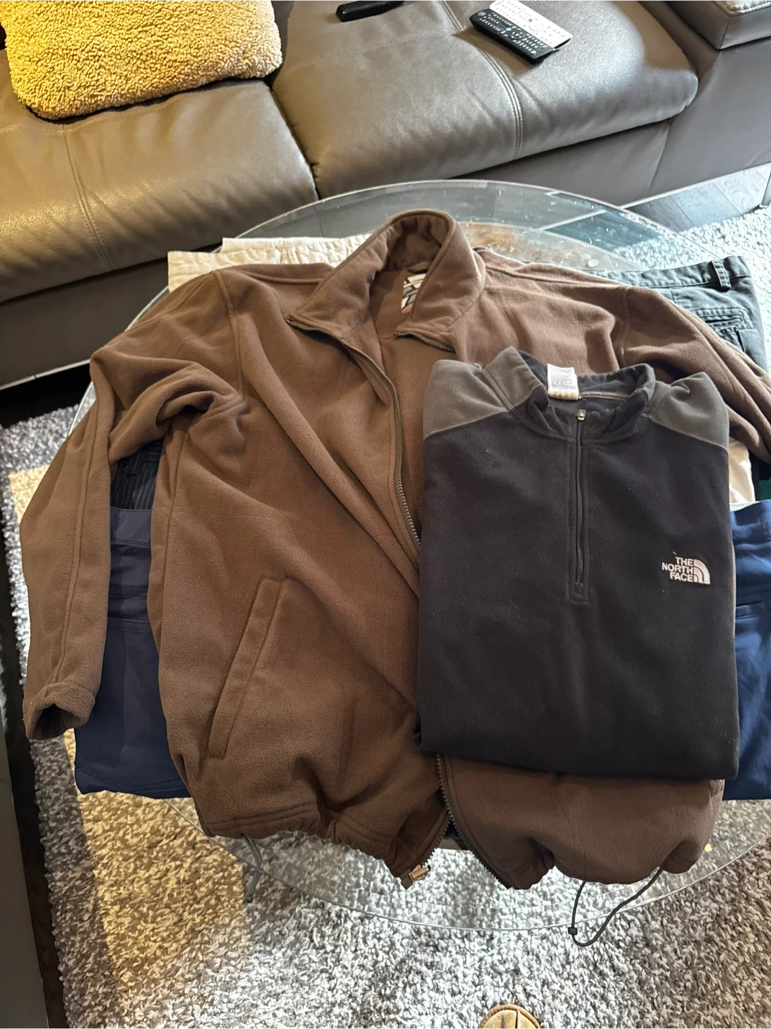 This is a The North Face fleece jacket. It's a quarter-zip style with a black and grey colour blocking. Great for staying warm outdoors!