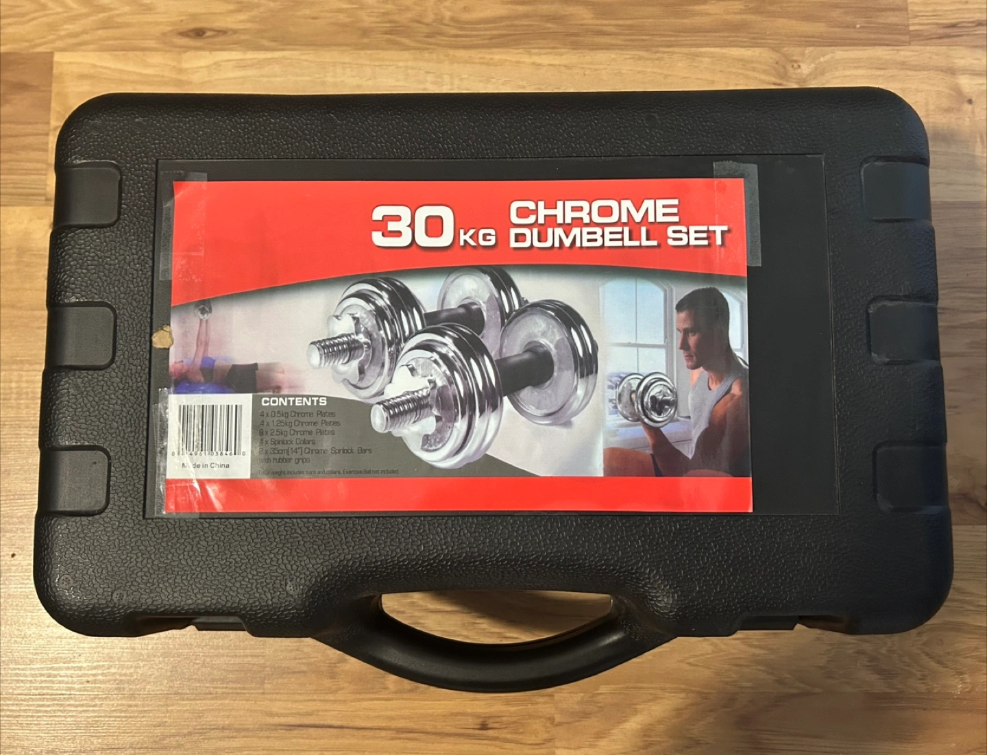Selling a 30kg chrome dumbbell set! It includes 4 x 0.5kg chrome plates, 4 x 1.25kg chrome plates, 8 x 2.5kg chrome plates, 2 x 35.5cm spinlock bars, and 4 x chrome spinlock collars with rubber grips. The set comes in a convenient carry case for easy storage and transport.