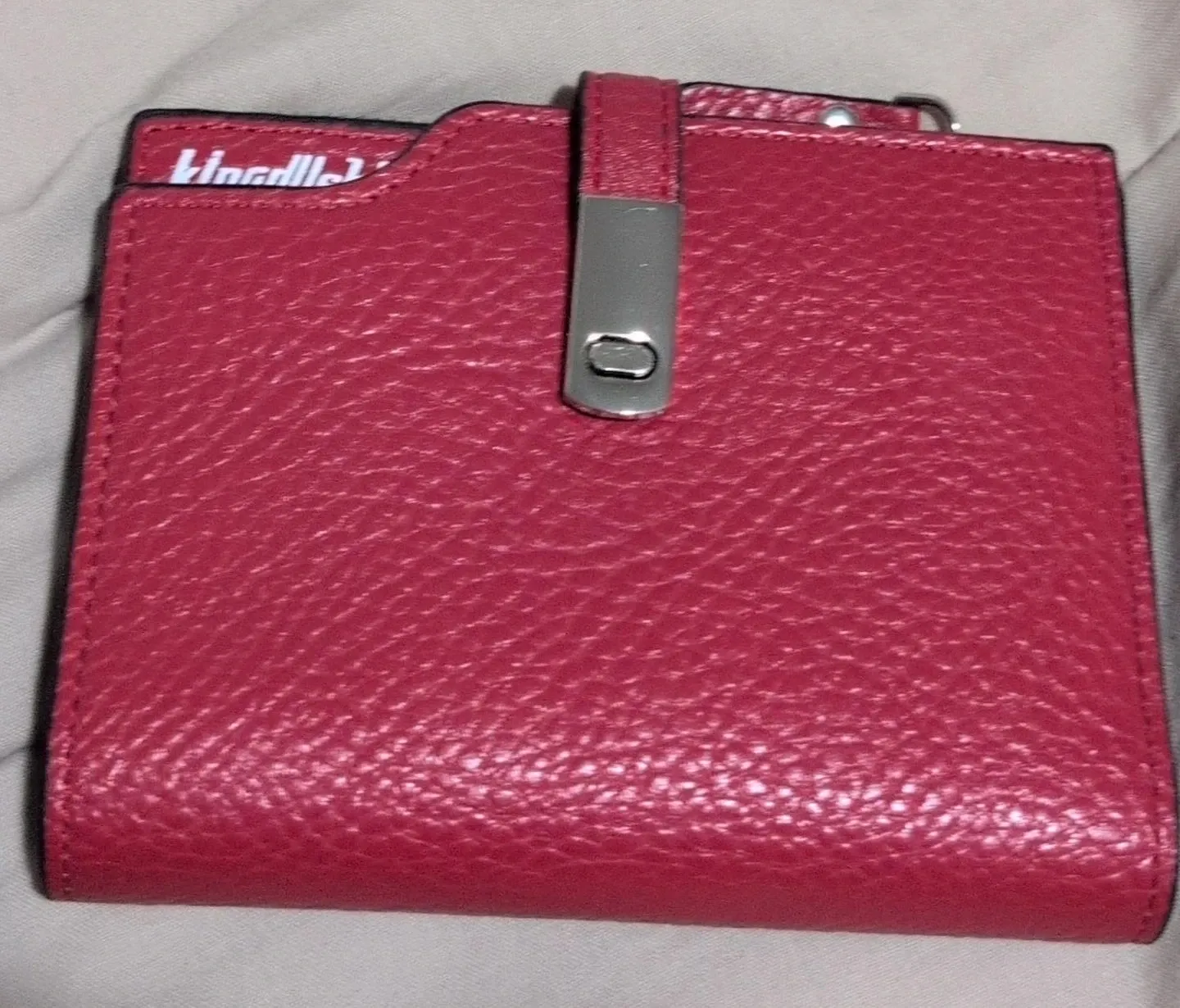 Kingllea bi-fold wallet in a textured crimson faux leather. It features a snap closure and multiple card slots inside. Useful for everyday organization and carrying essentials. Bought on line, never use.
