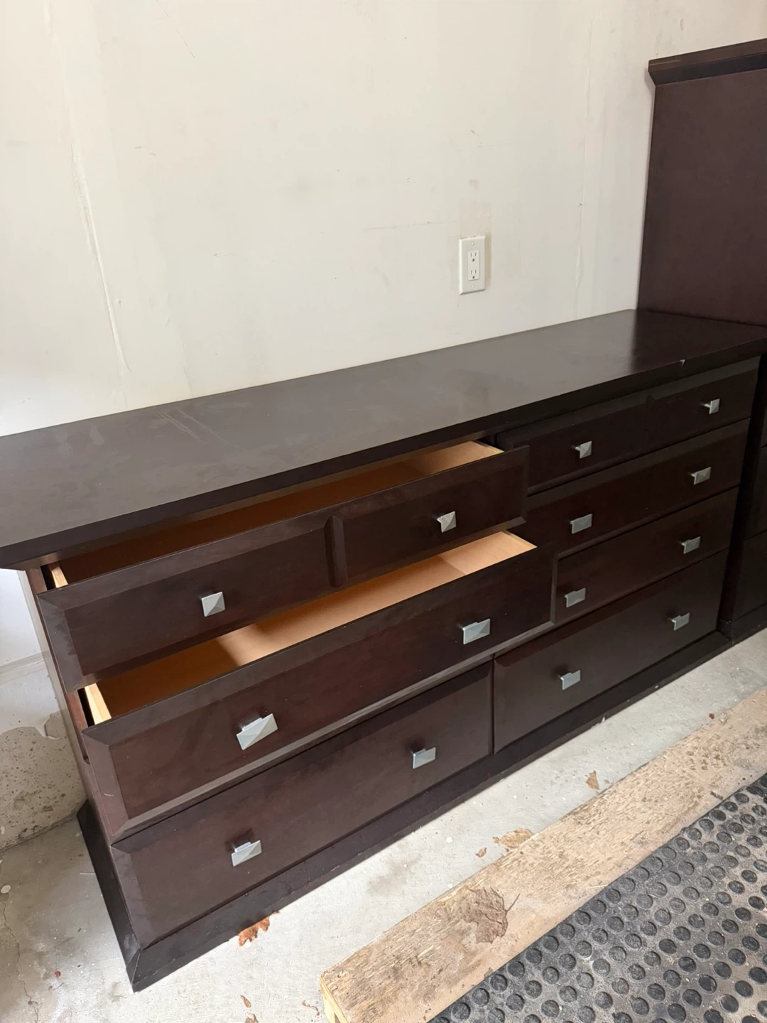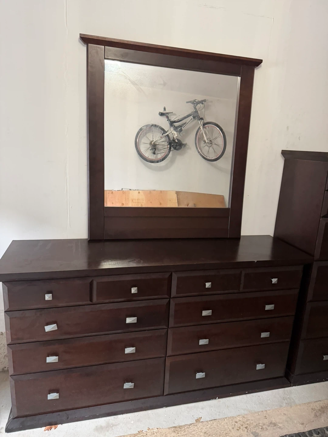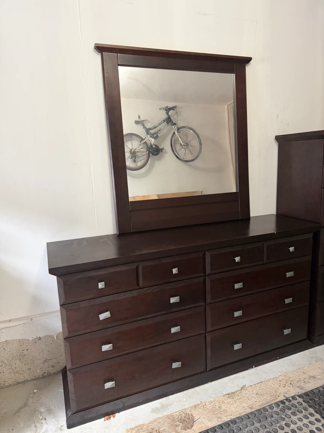 A dark brown dresser with a matching mirror. It has a total of 12 drawers for ample storage. There are some surface marks and a water ring on top. Good conditions. I sale ir cause haven’t room for it. Delivery for extra fee.