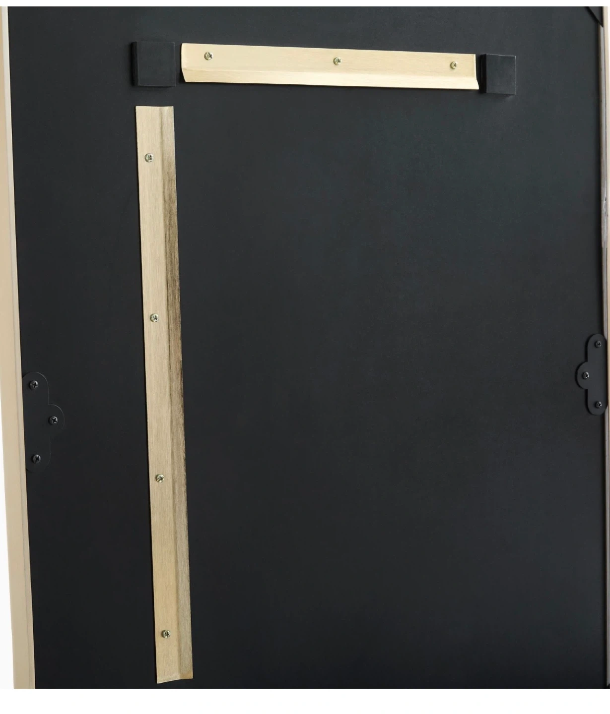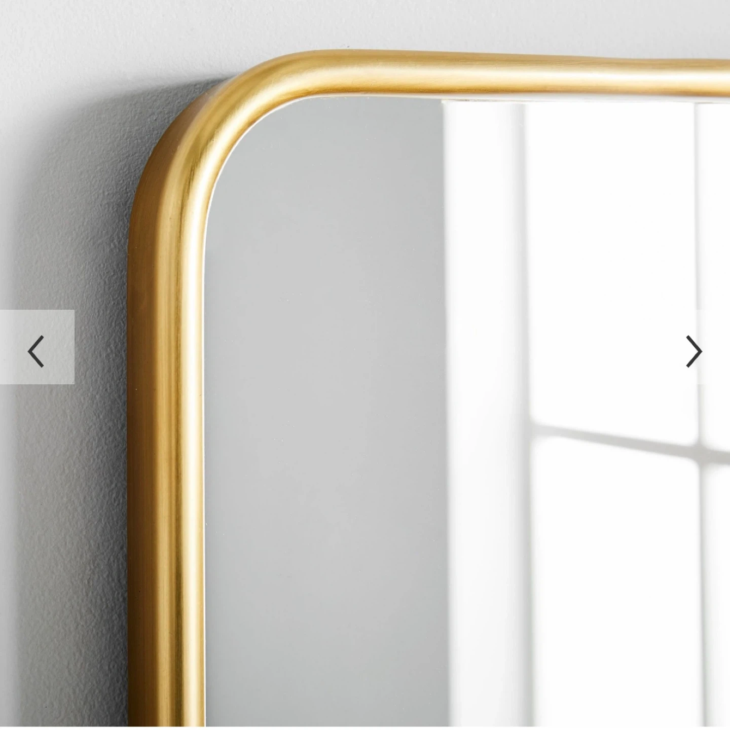 This decorative mirror features a sleek gold metal frame with rounded corners. It's perfect for adding a touch of modern style to any room. The frame's finish is a brushed gold.