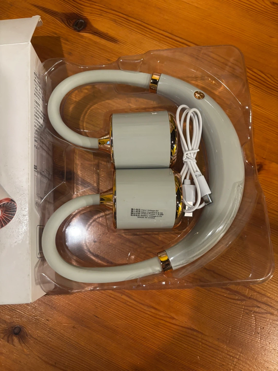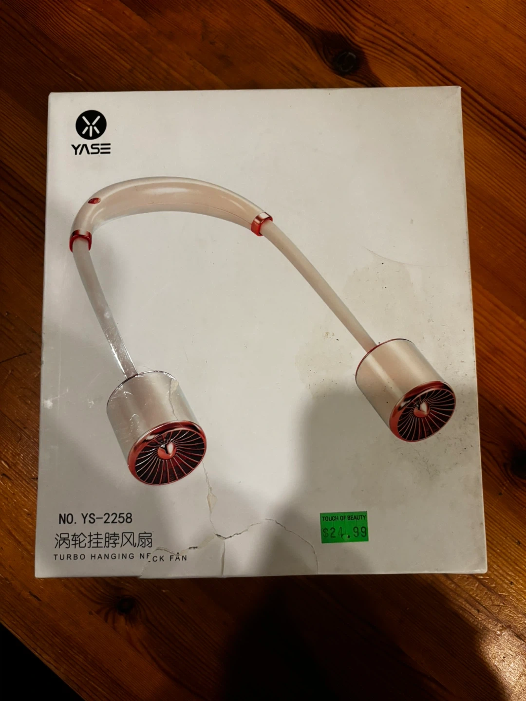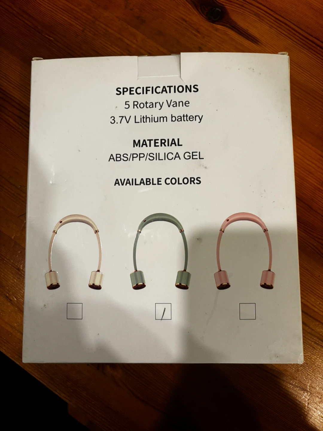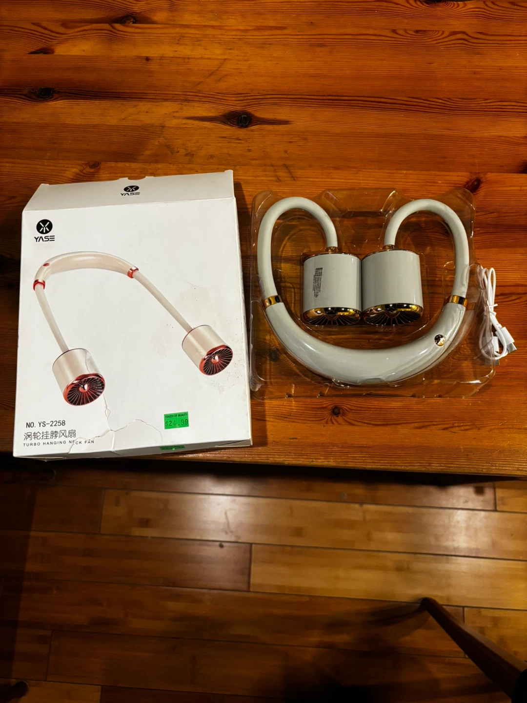 This is a YASE Turbo Hanging Neck Fan with 5 rotary vanes. It's made of ABS/PP/Silica Gel and has a 3.7V Lithium battery. Includes a charging cable.