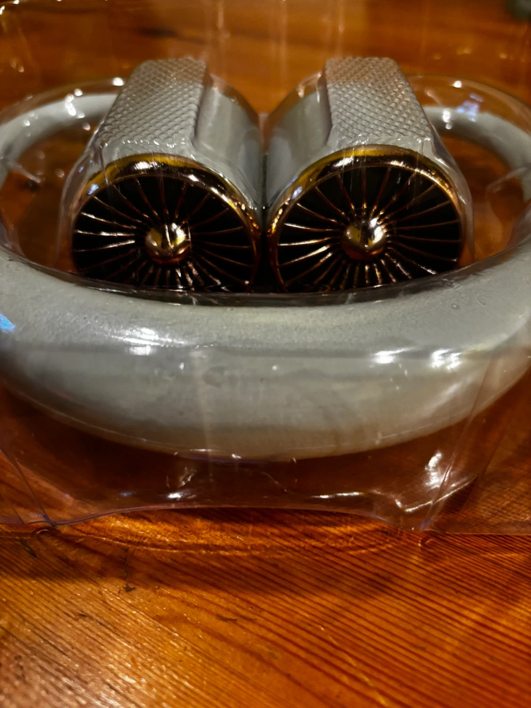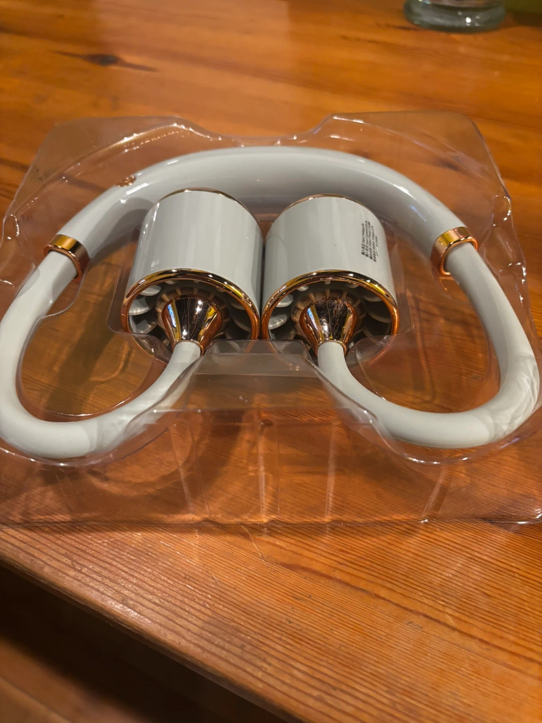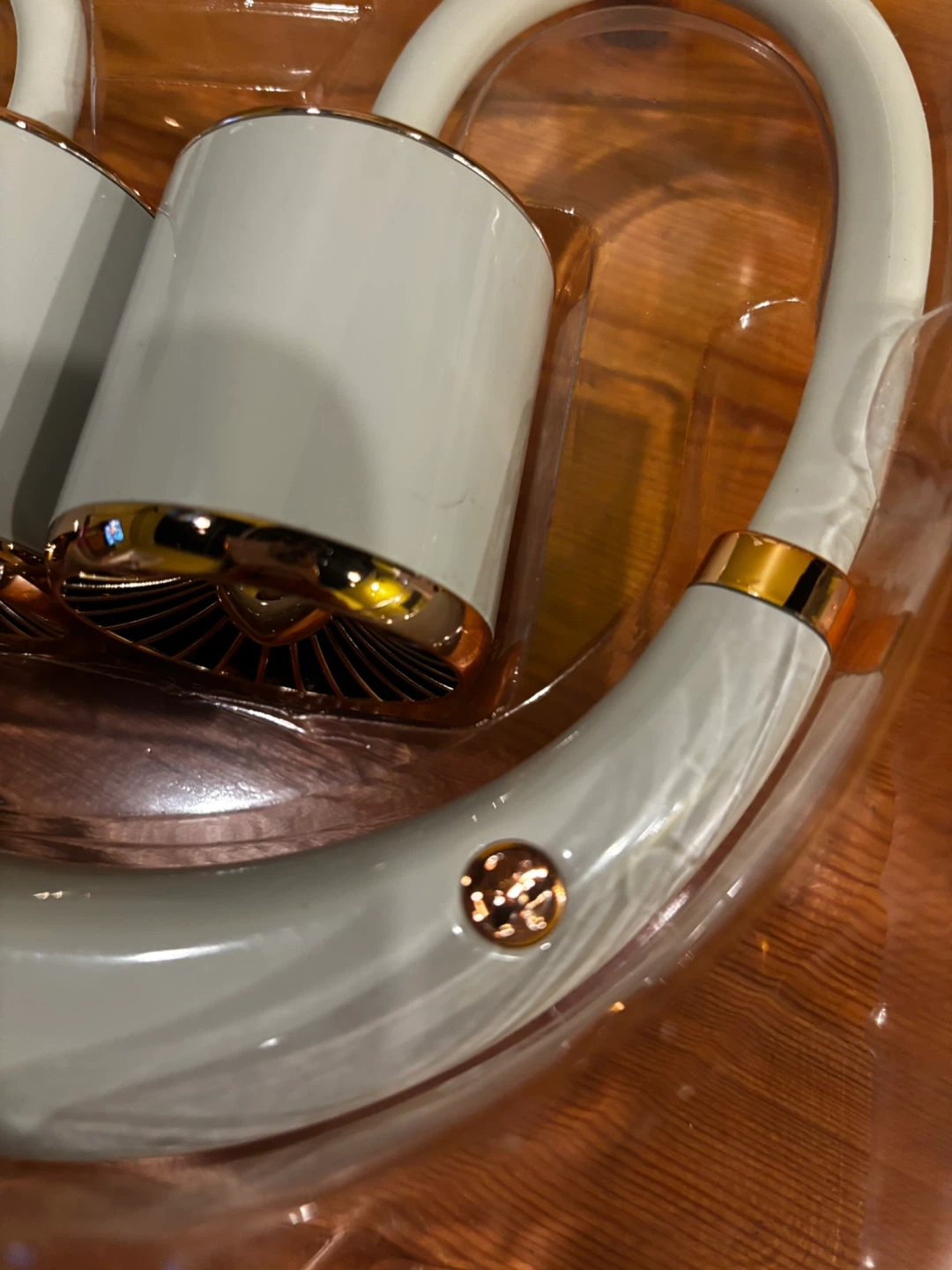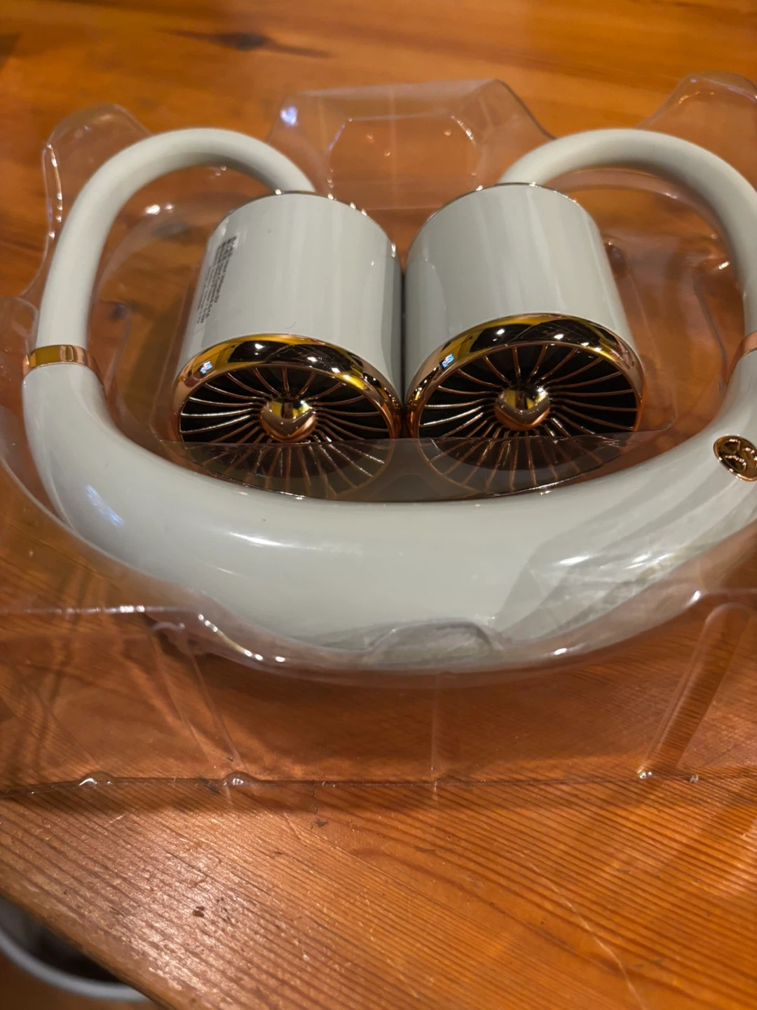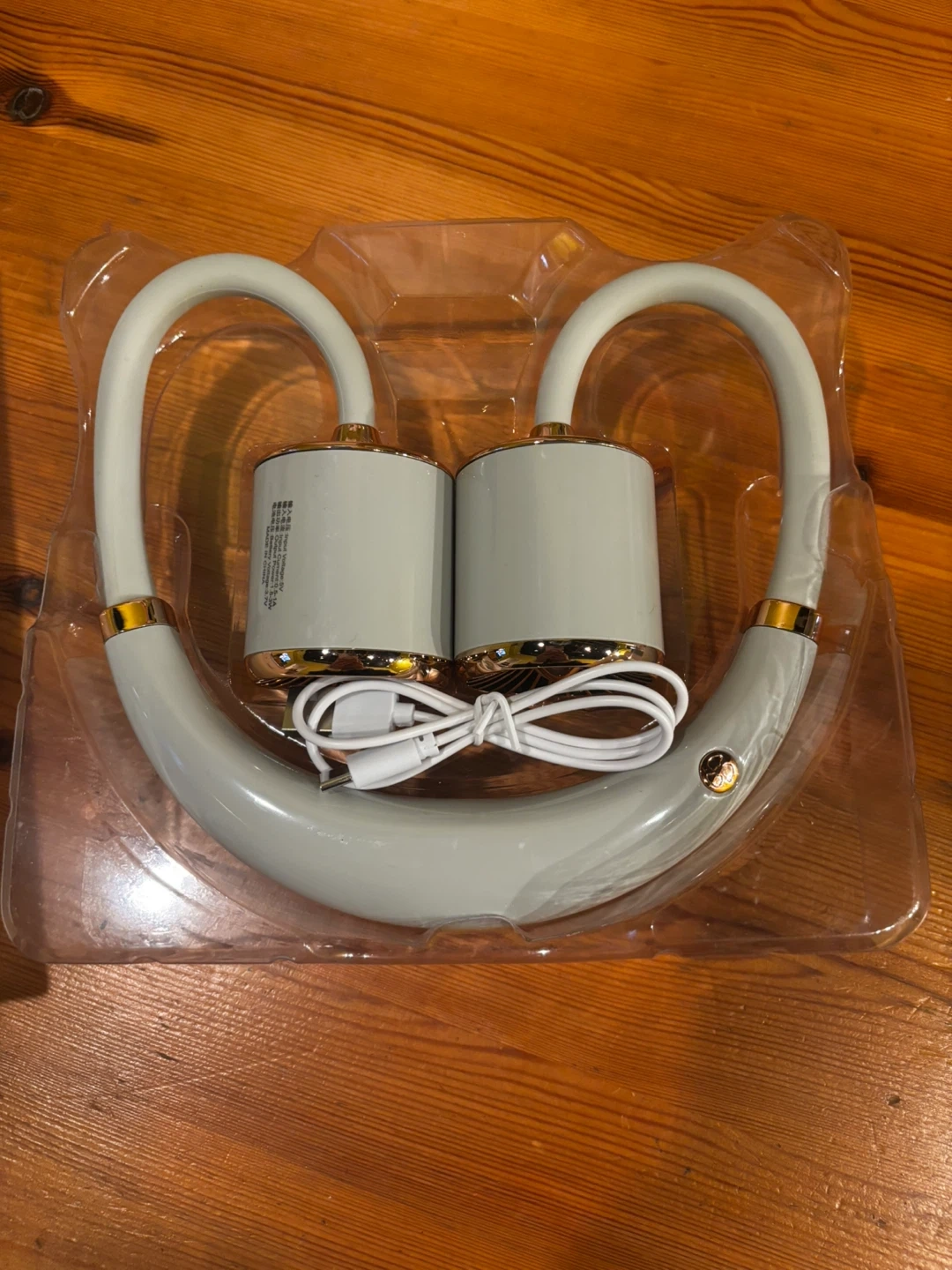 This is a YASE Turbo Hanging Neck Fan with 5 rotary vanes. It's made of ABS/PP/Silica Gel and has a 3.7V Lithium battery. Includes a charging cable.