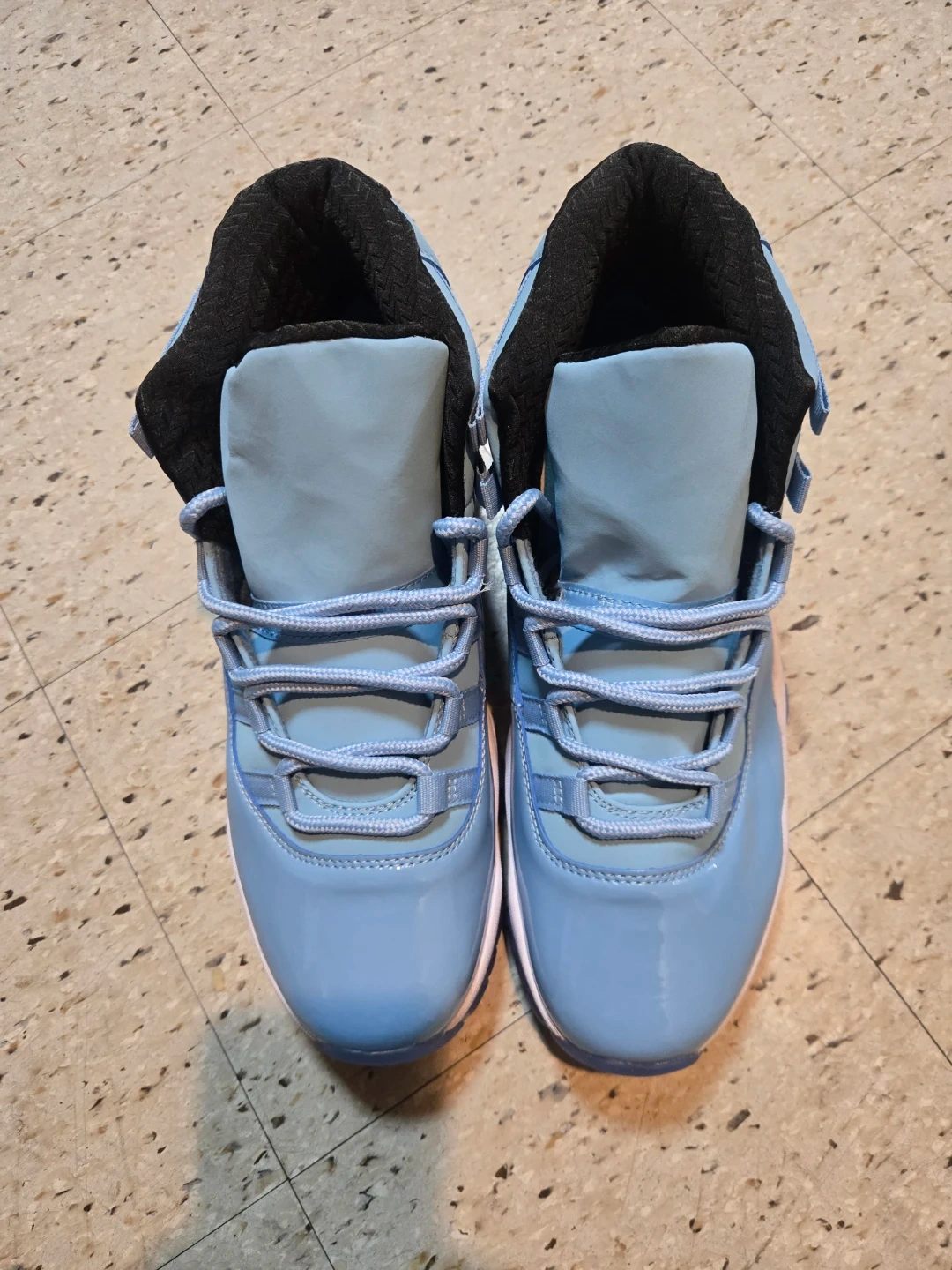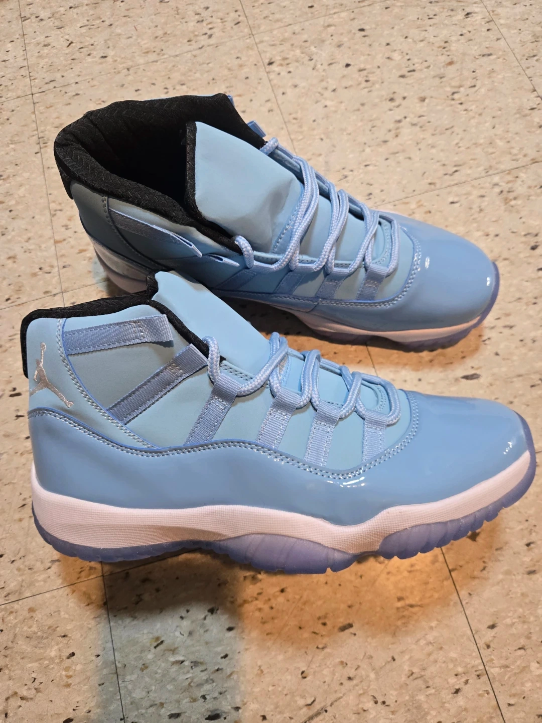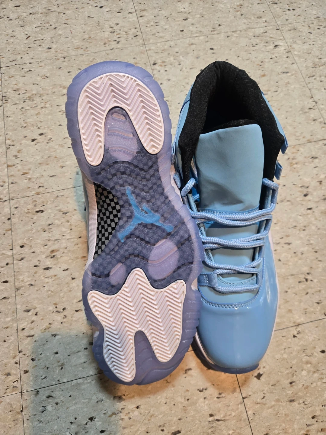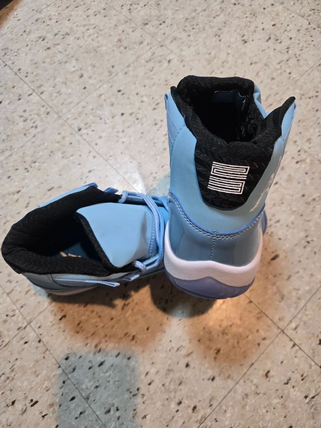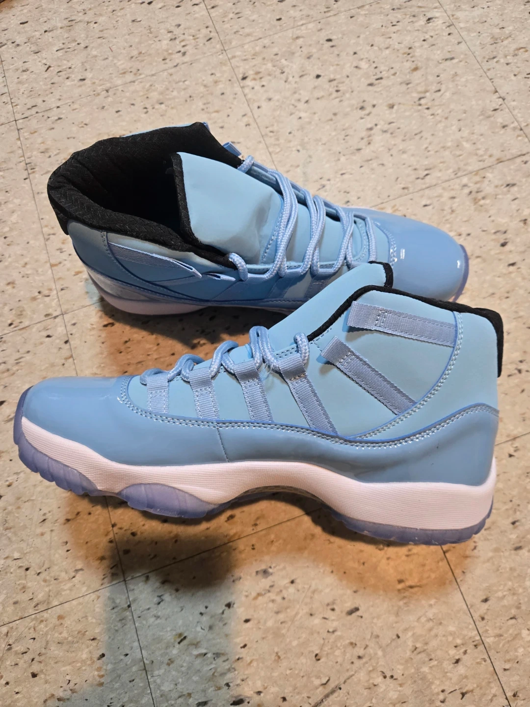 These are Air Jordan 11 Retro sneakers in a University Blue colorway. They feature a patent leather and textile upper with a translucent outsole. Includes original laces and Jumpman branding.