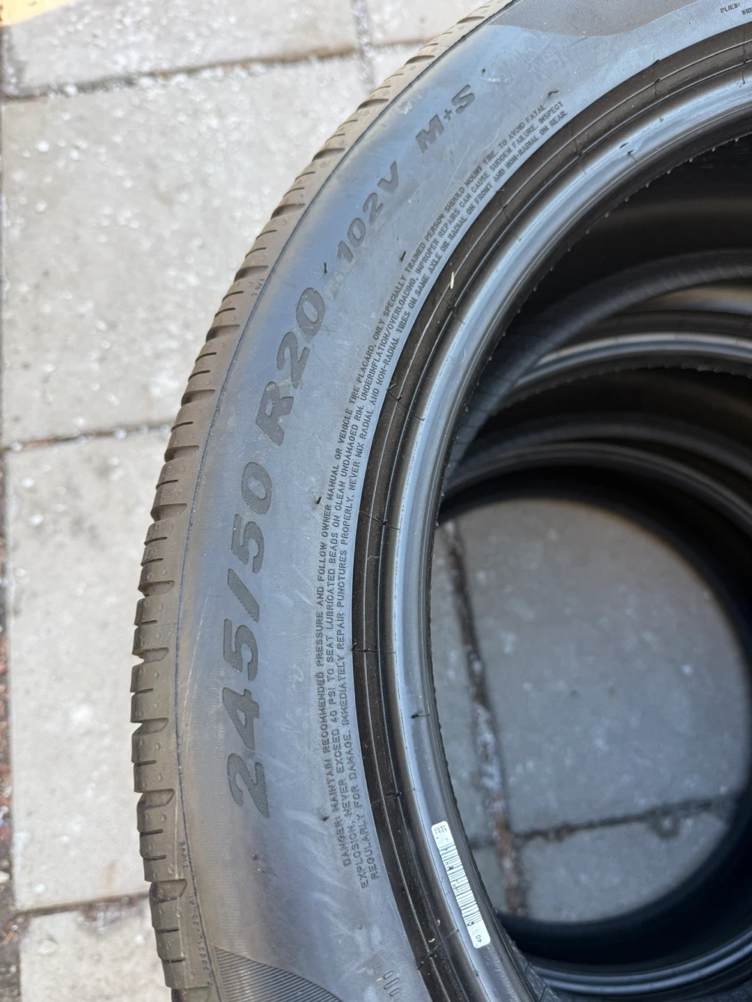 Set of four 245/50R20 102V M+S tires. These tires are designed for all-season performance. They feature a specific tread pattern for good traction. They're a great option for cars needing this tire size.