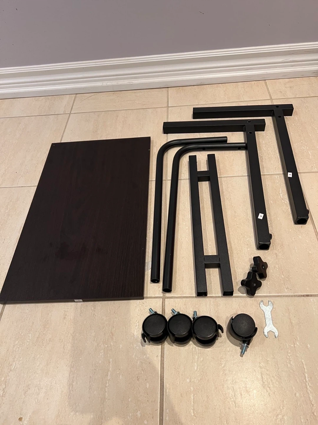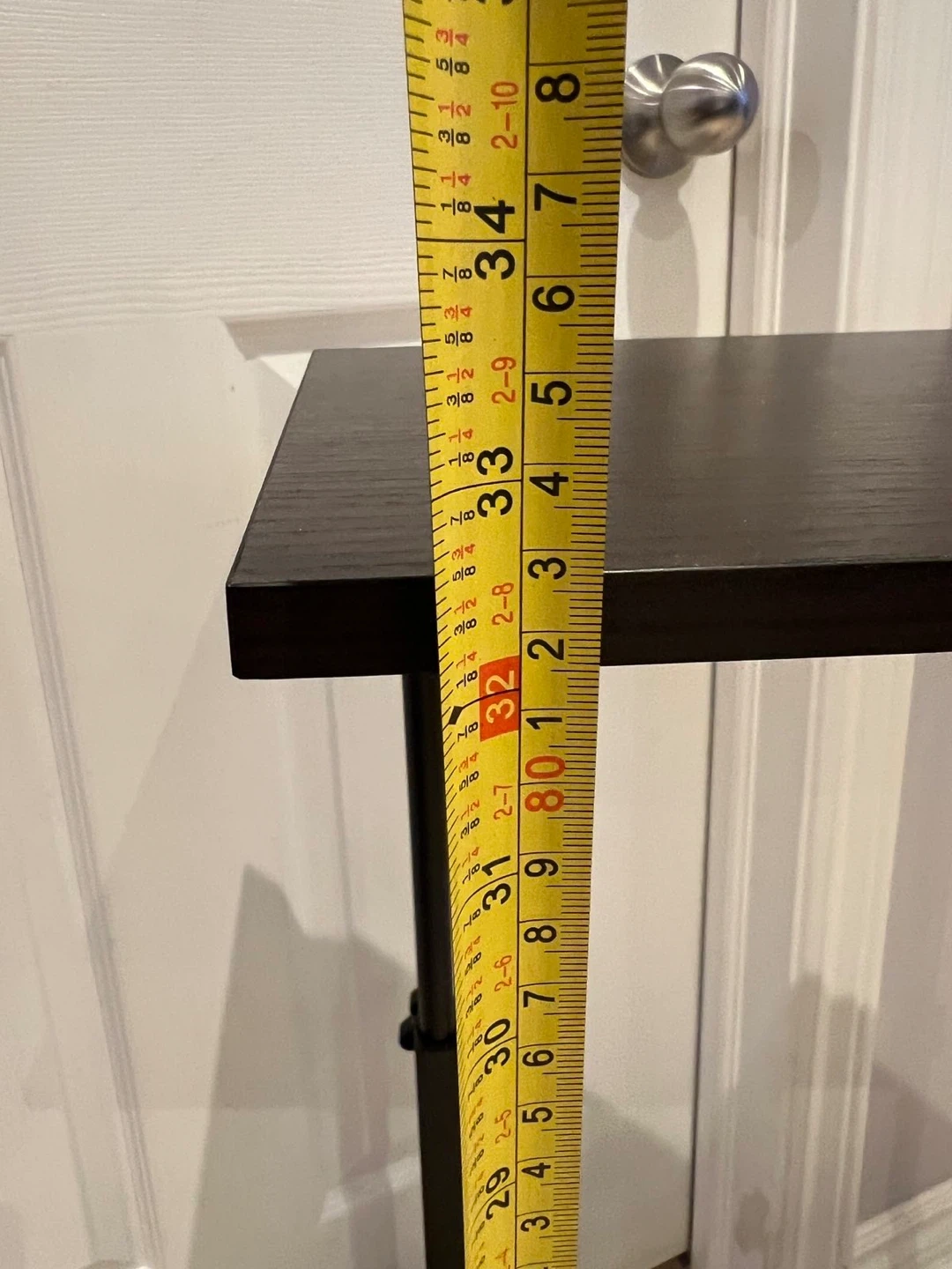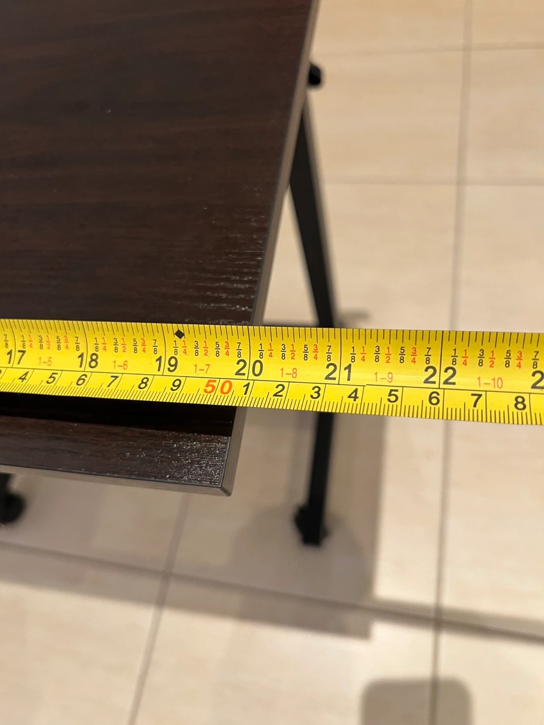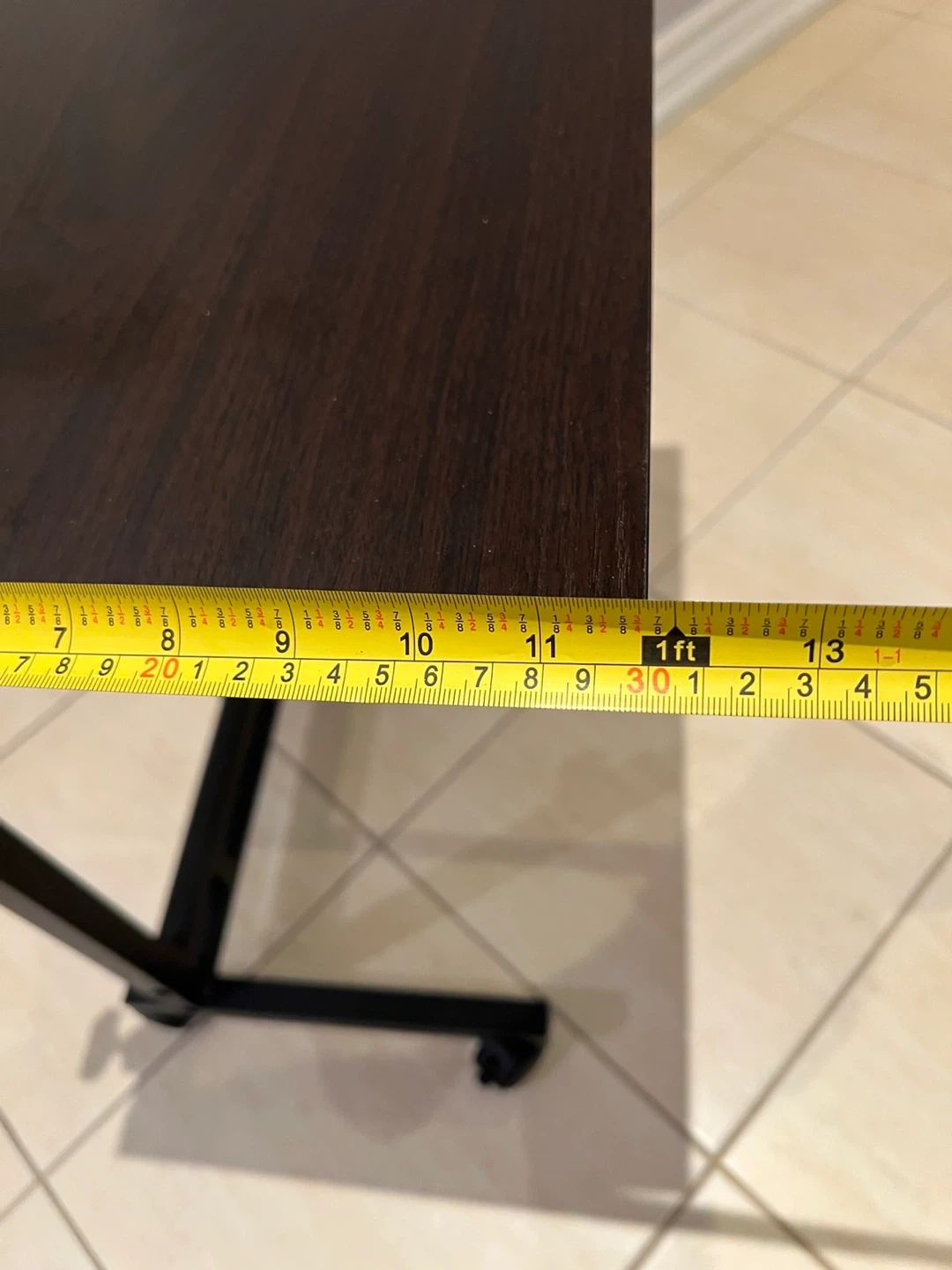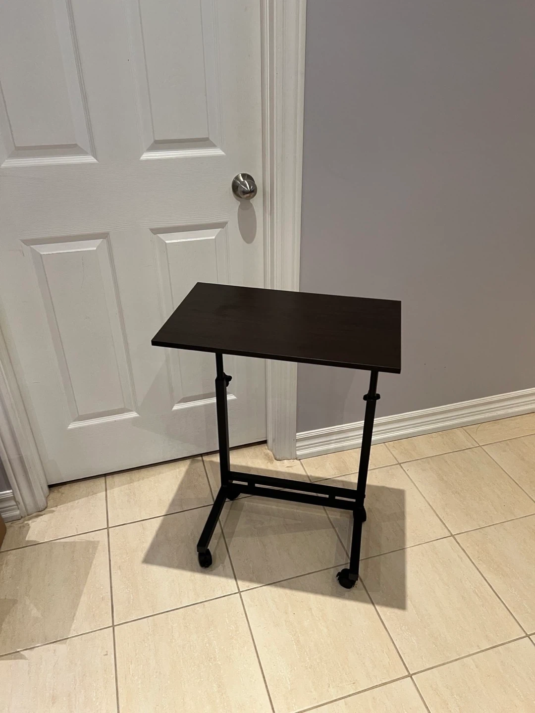A handy rolling side table with an adjustable height. It's perfect for use next to a couch or bed. The dark brown top offers a sleek look.