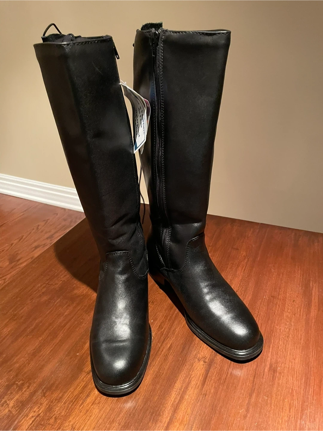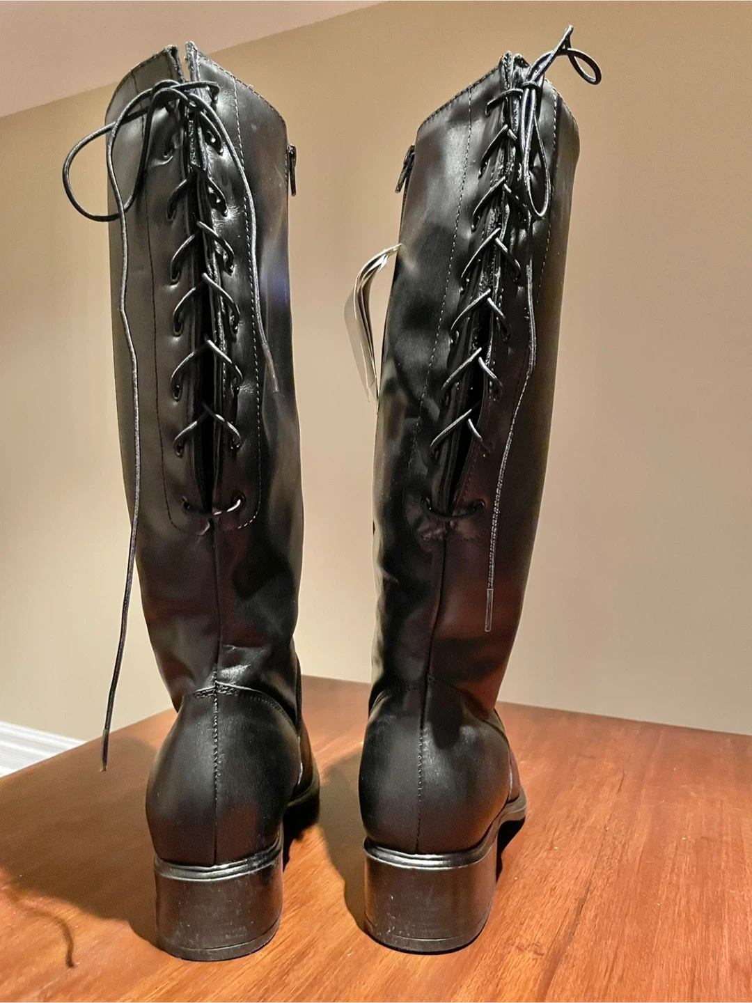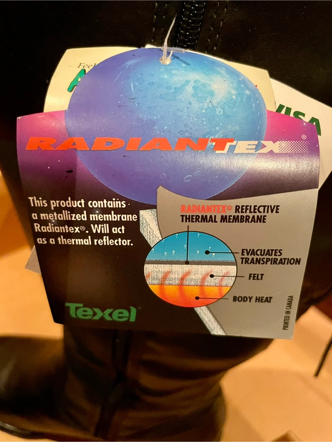 These black tall boots feature a Radiant Tex reflective thermal membrane. They're designed to act as a thermal reflector, evacuating transpiration while keeping body heat in. Includes side zippers and laced backs. Real leather with waterproof coating.