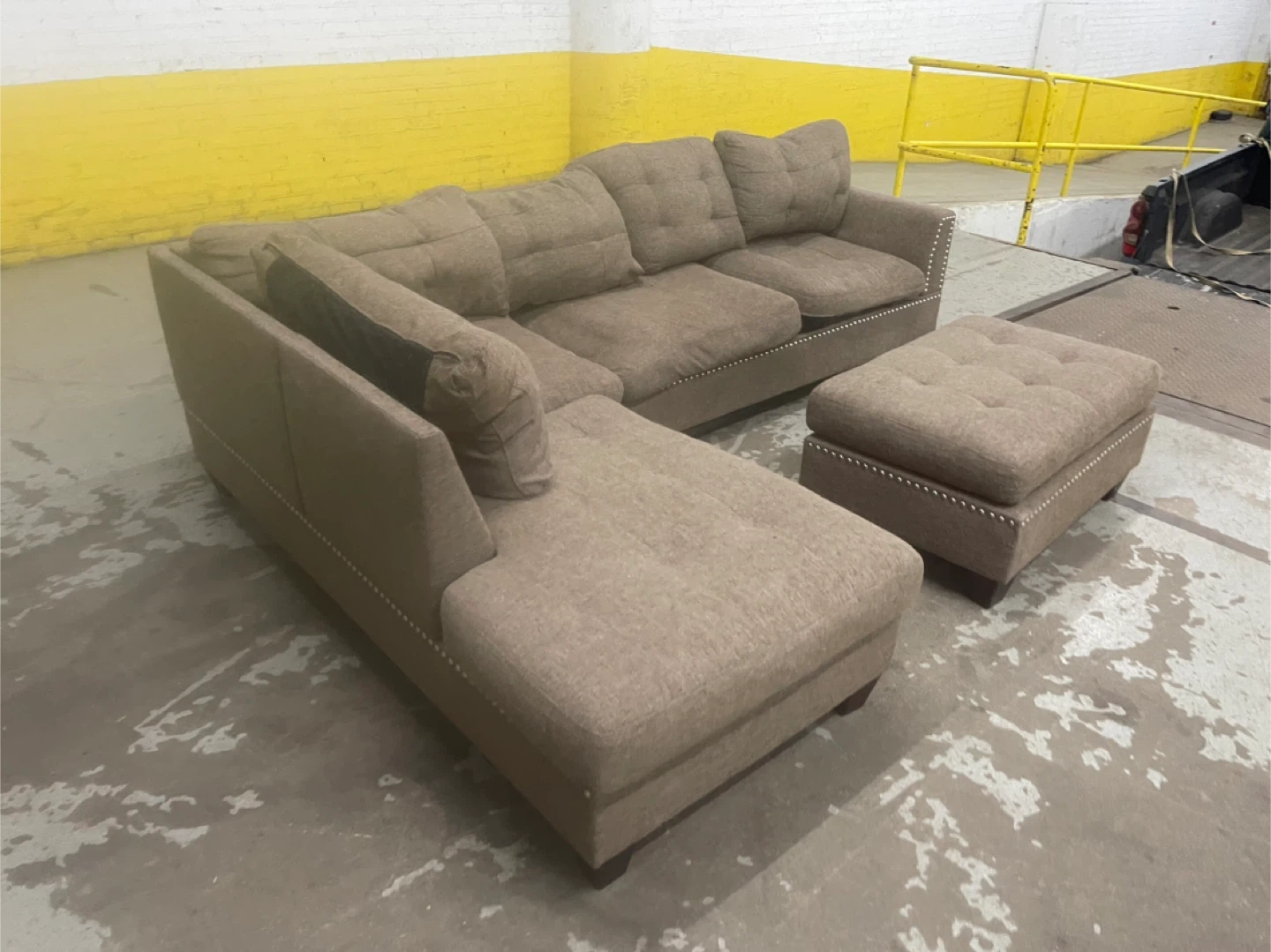 This is a taupe fabric sectional couch with an ottoman. It features tufted cushions and decorative nailhead trim. This set provides ample seating for a living room.