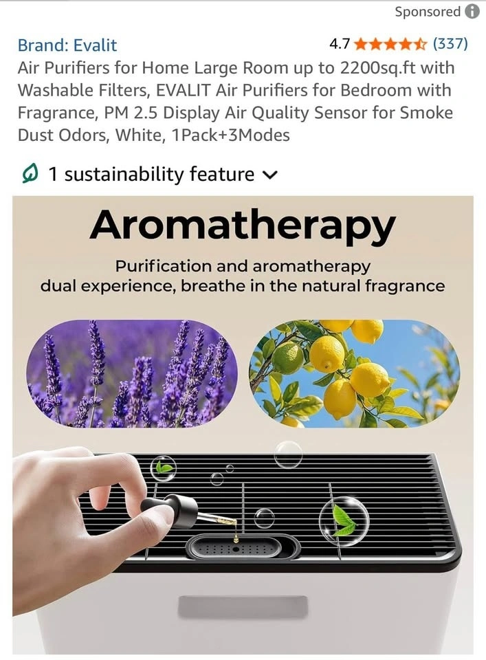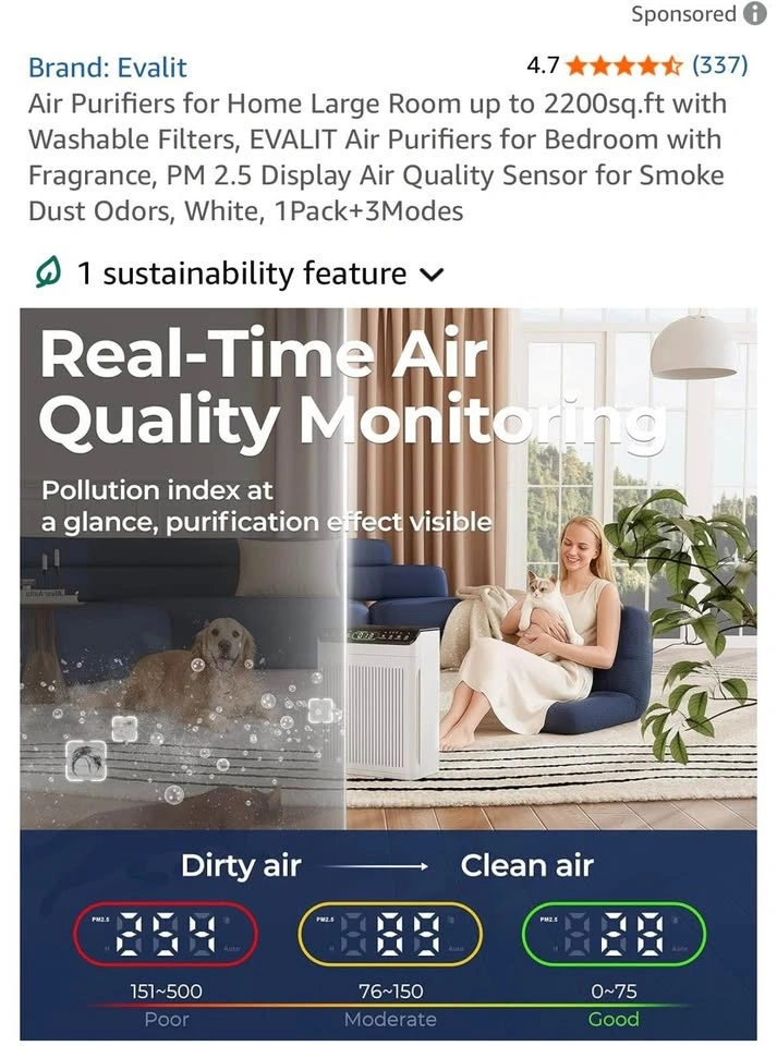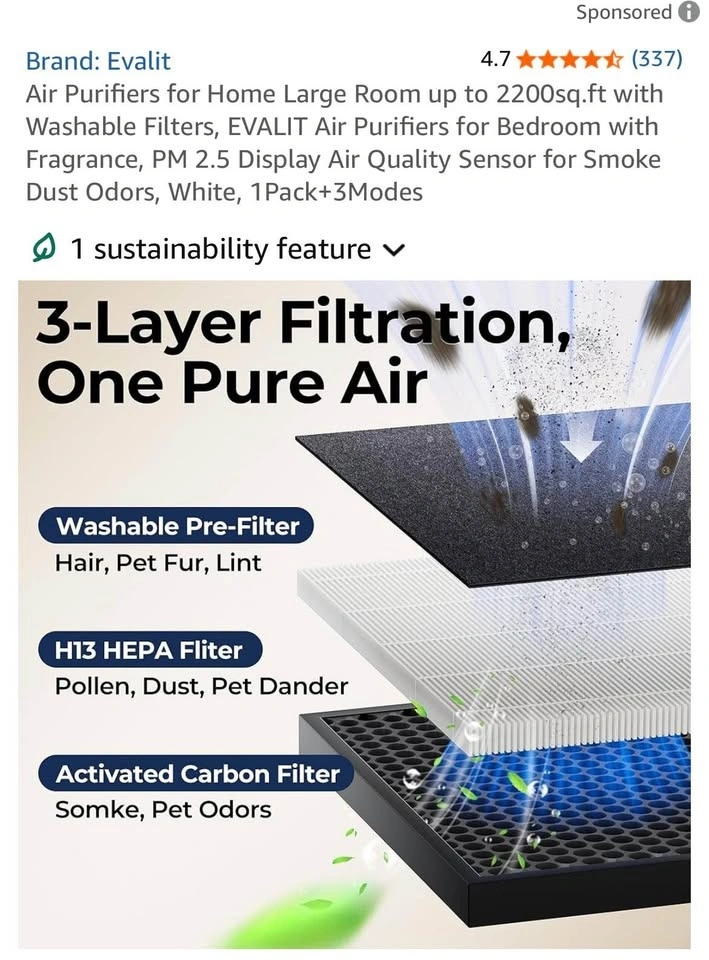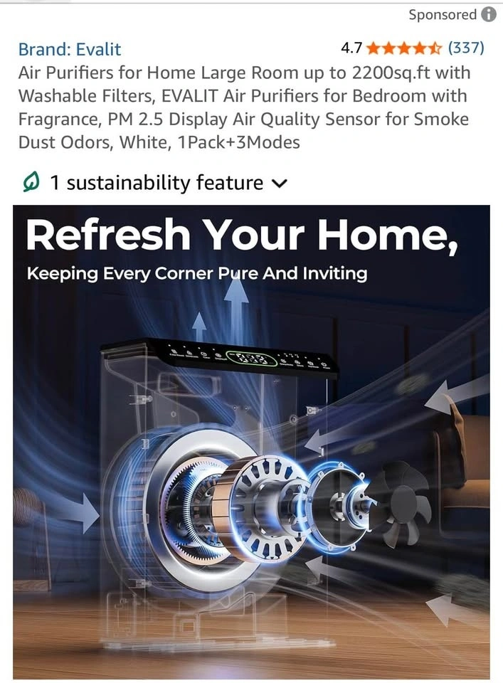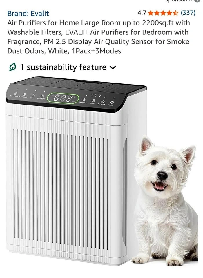 Evalit Air Purifier for Large Rooms up to 2200 sq.ft delivers powerful, whole-home air cleaning with advanced HEPA filtration. Designed for families and pet owners, it captures dust, pollen, smoke, pet hair, and odors while improving indoor air quality. Featuring a washable pre-filter, PM2.5 air quality display, smart auto mode, and aromatherapy function, it provides clean, fresh, and comfortable air with quiet, energy-efficient operation.