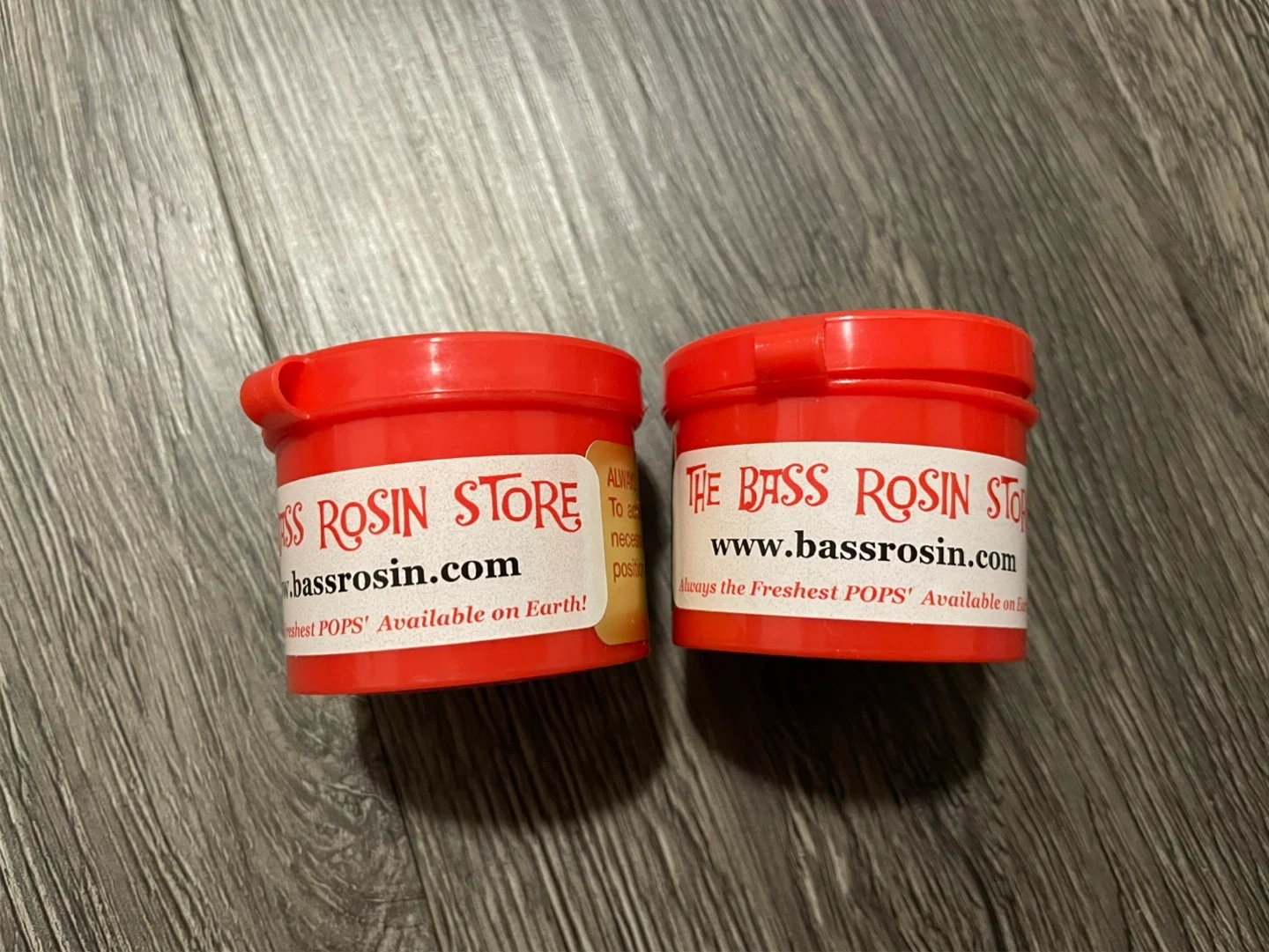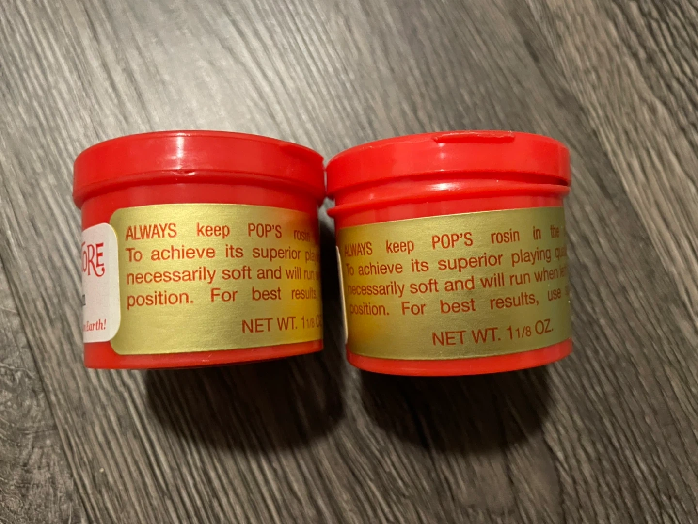 Two jars of POPS rosin for violins or Double Bass. Each jar contains 1 1/8 oz of rosin. This rosin is designed to remain soft and run when needed. Always keep POPS rosin in the correct playing position.