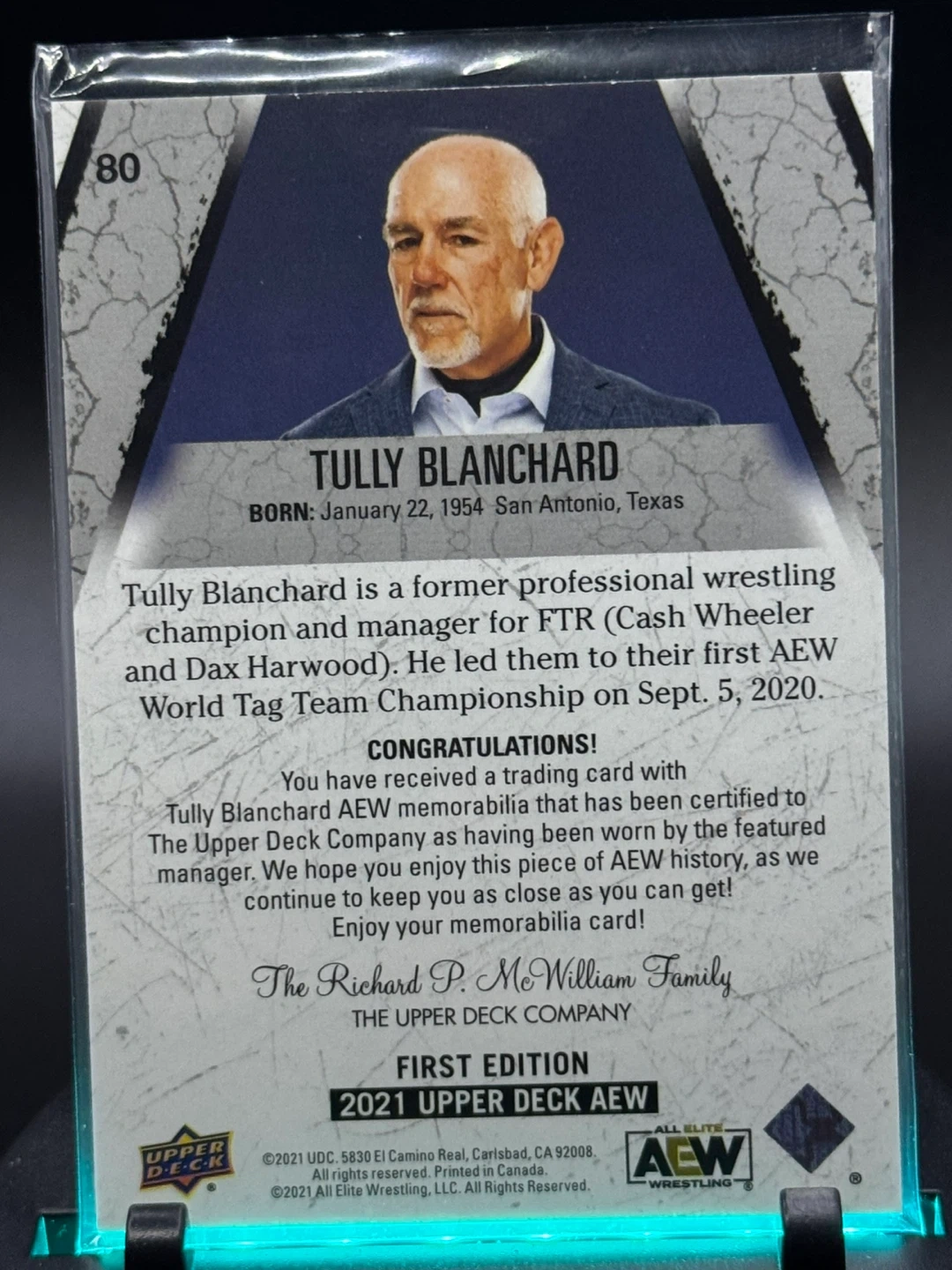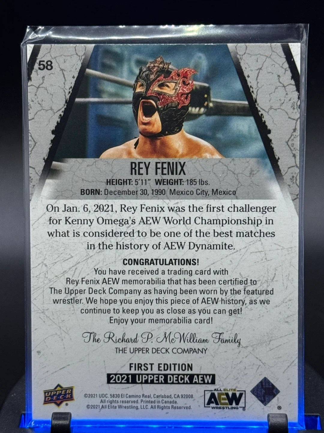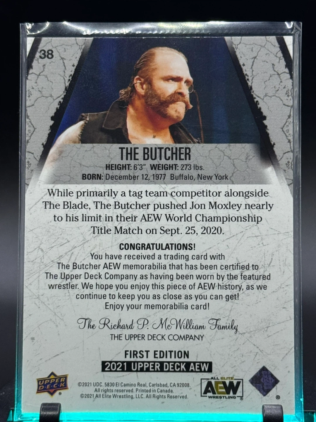 You've got a trading card lot featuring AEW wrestlers The Butcher and Rey Fenix. Both are 2021 Upper Deck First Edition cards. Each includes a piece of memorabilia from the featured wrestler. These cards are certified by The Upper Deck Company.