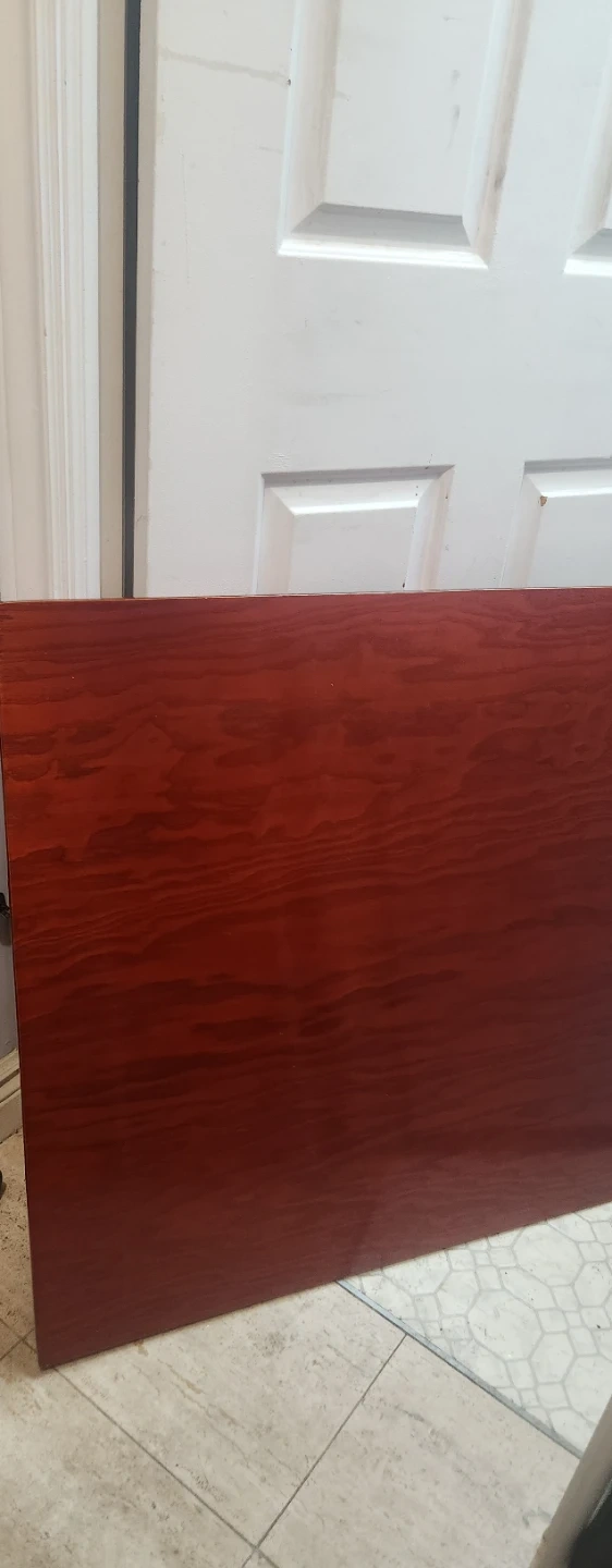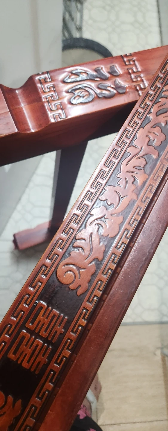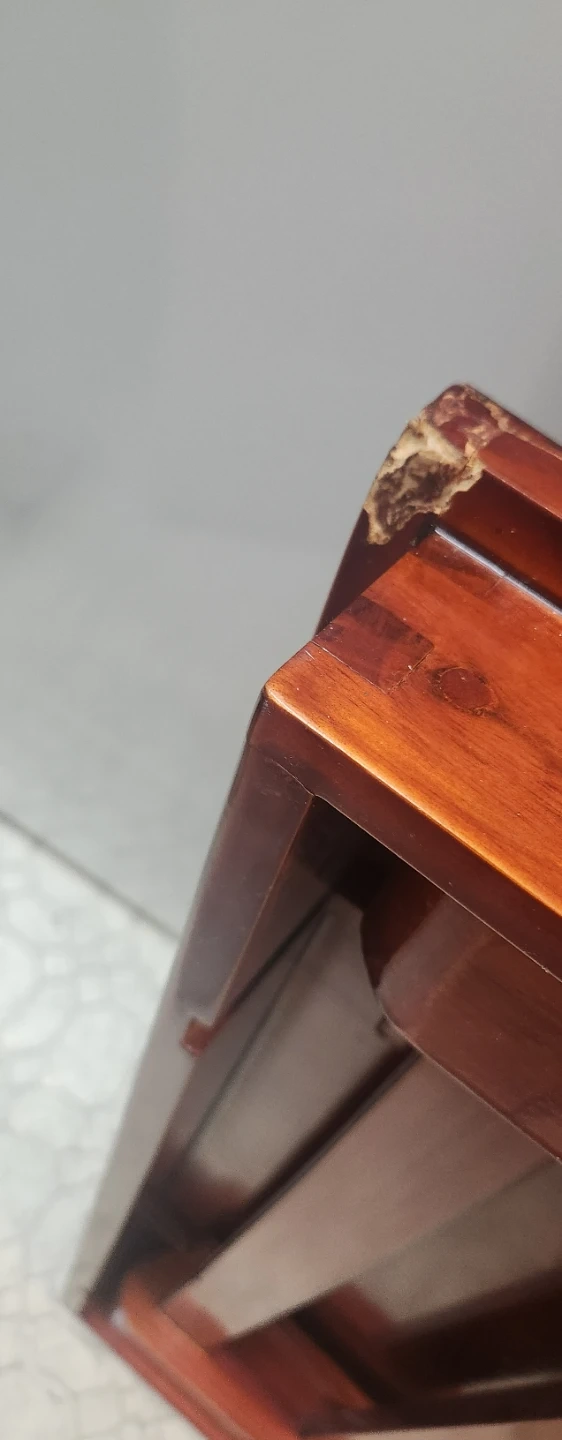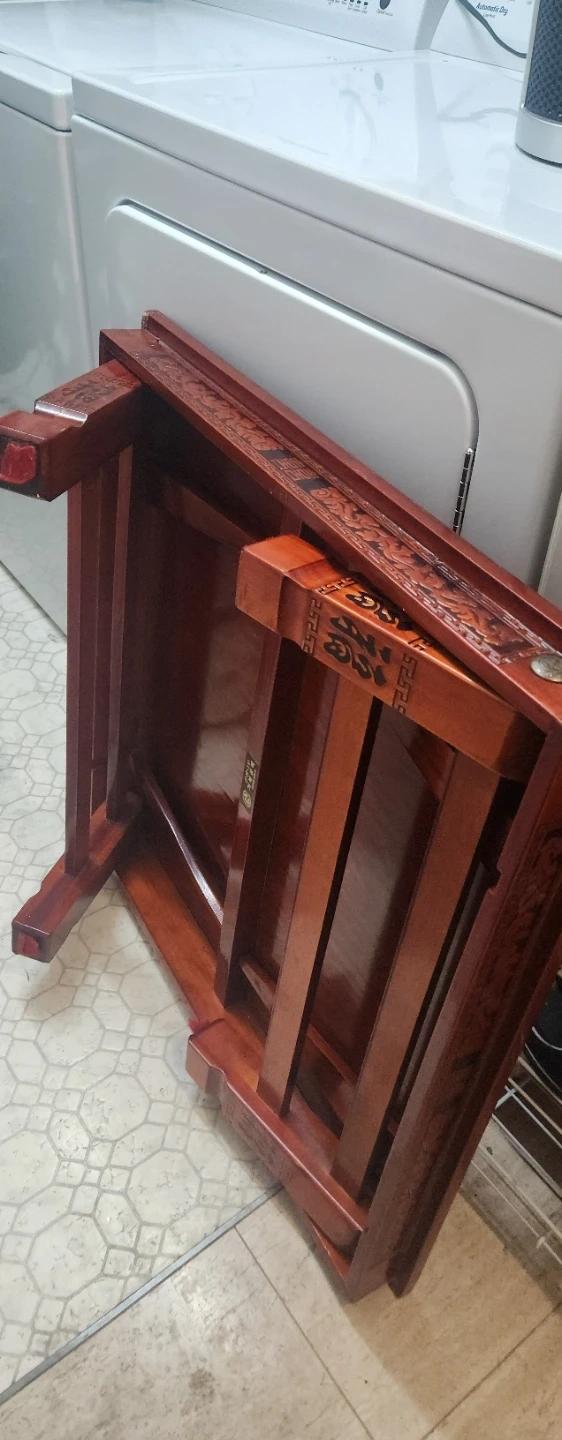 This is a lovely wooden end table with intricate carvings. It's a deep reddish-brown wood finish. One corner has some minor damage, as shown in the pictures.