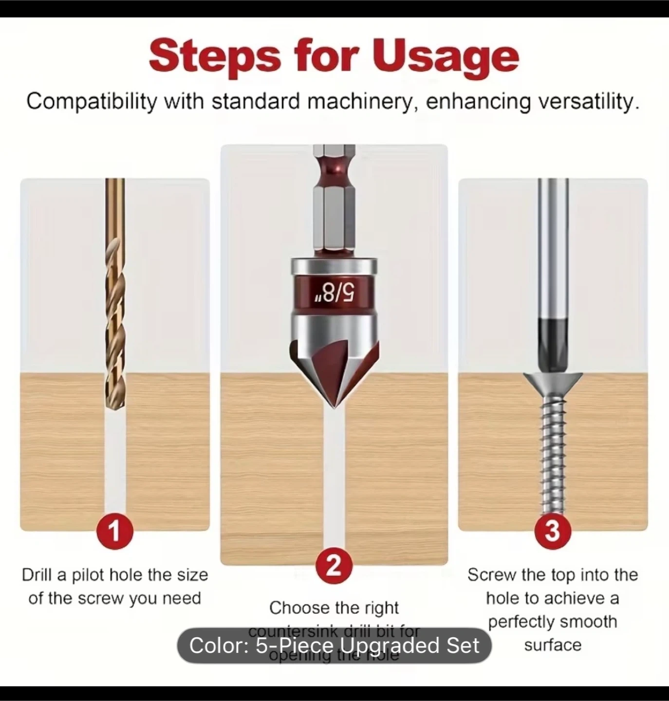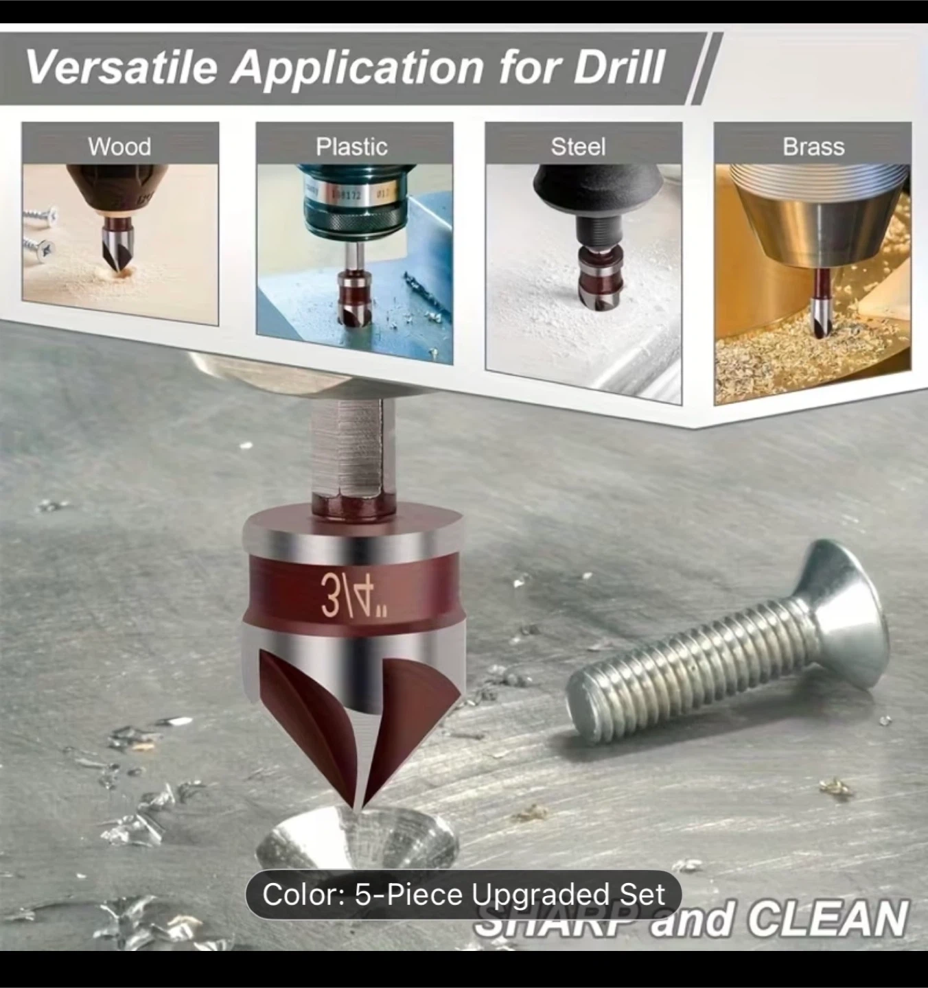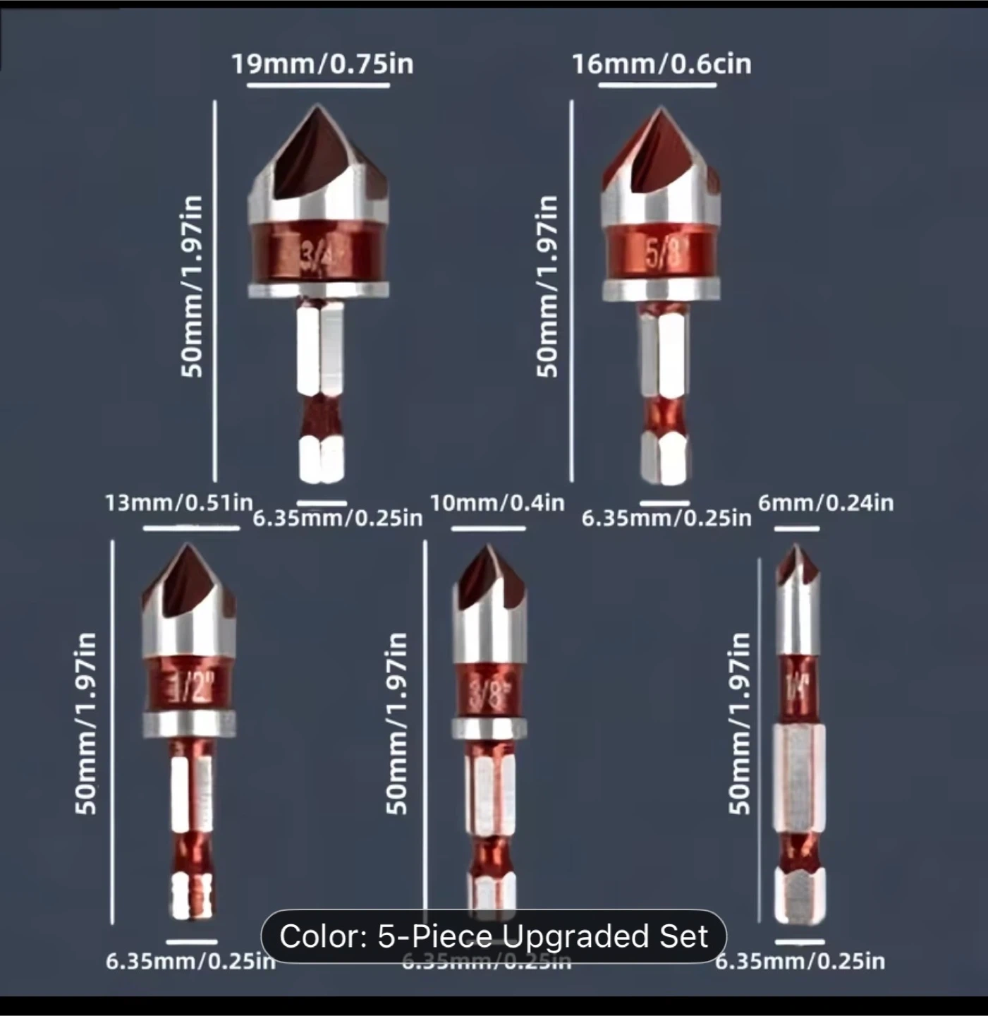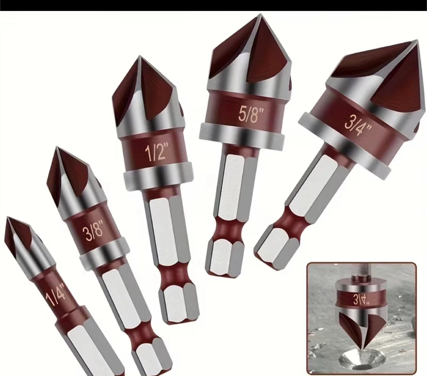 A Set of 5 High-Speed Steel Countersink Drill Bits (Equipped with 1/4 Inch, 3/8 Inch, 1/2 Inch, 5/8 Inch, And 3/4 Inch Hex Shanks), Featuring an 82-Degree High-Speed Steel Five-Blade Quick-Change Hex Shank, Suitable for Drilling Into Metal, Plastic