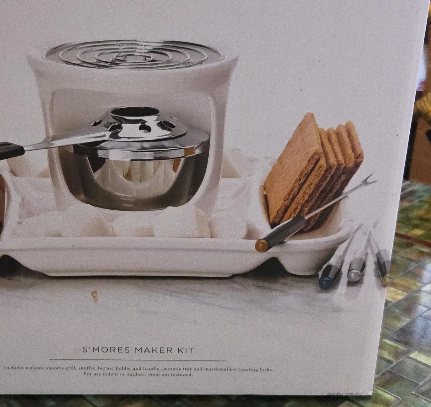 Includes ceramic s'mores grill, burner holder and handle, ceramic tray, and 4 marshmallow roasting forks. It's for indoor or outdoor use. Food is not included.