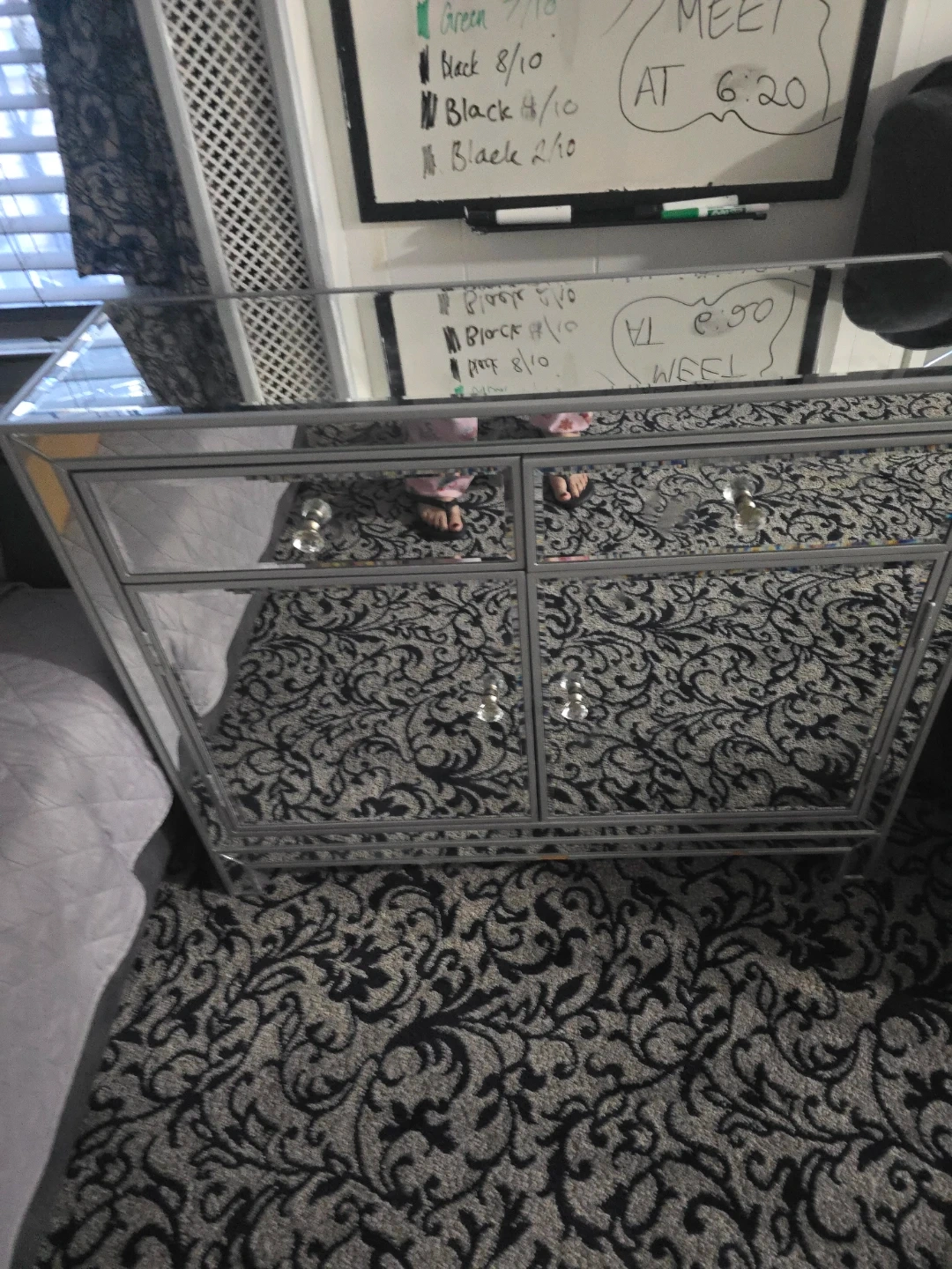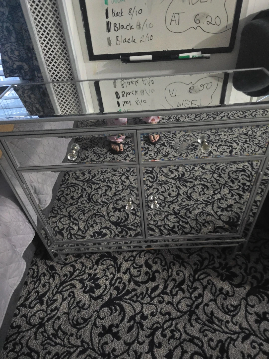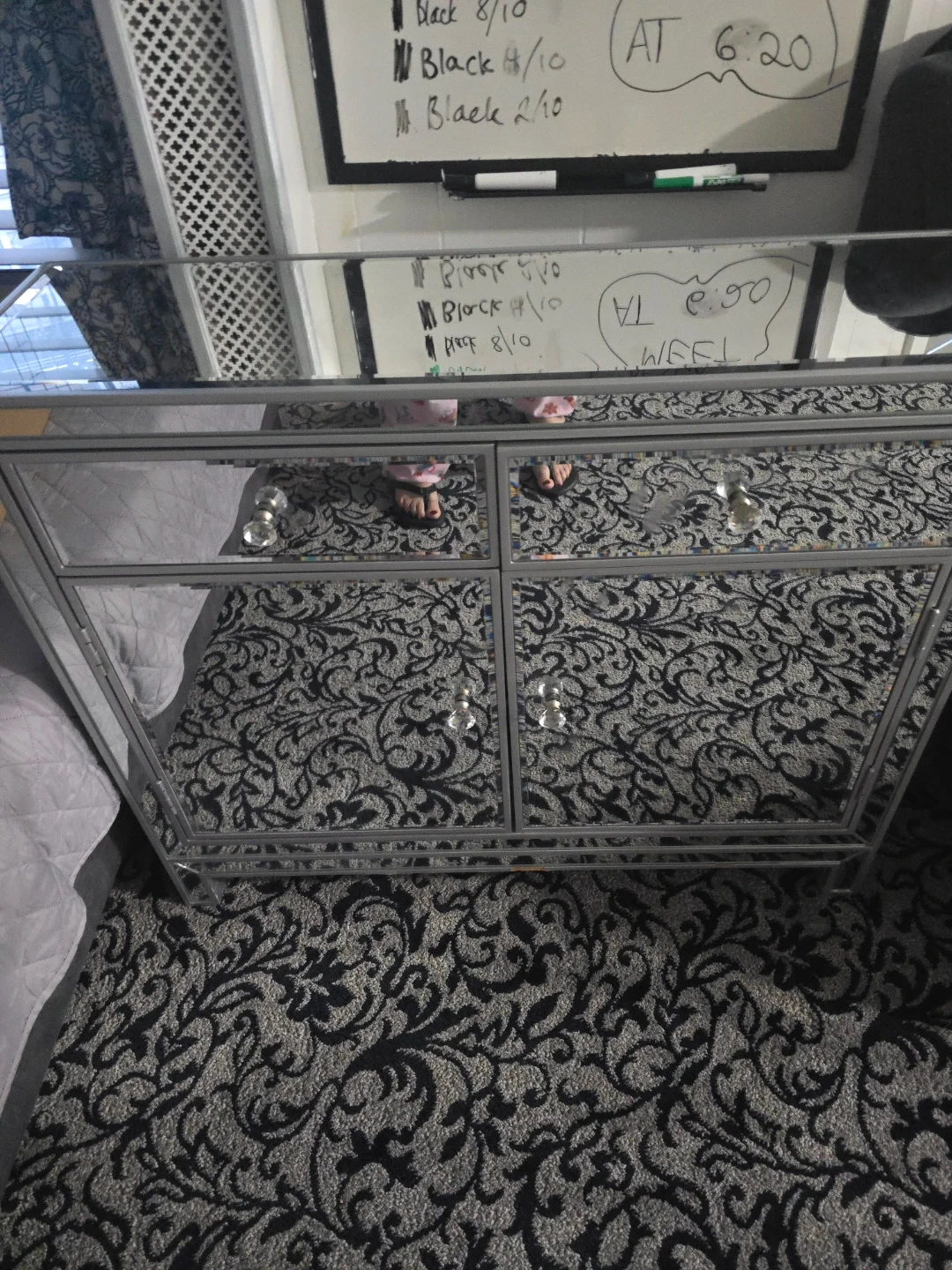 This dresser features a mirrored finish with decorative crystal knobs. It has four drawers for storage. The patterned drawer fronts add a unique touch. Great for adding a glamorous accent to any room!