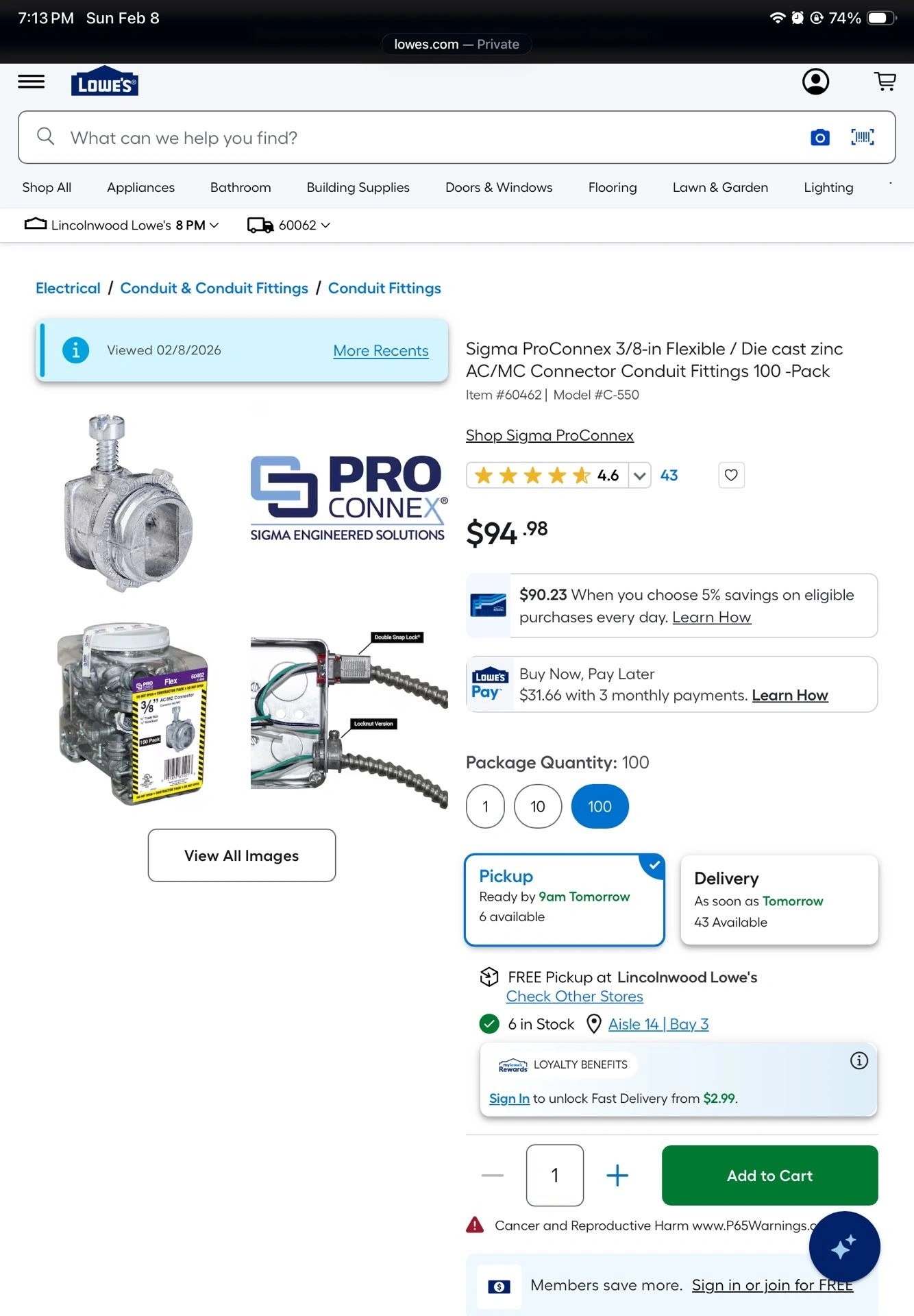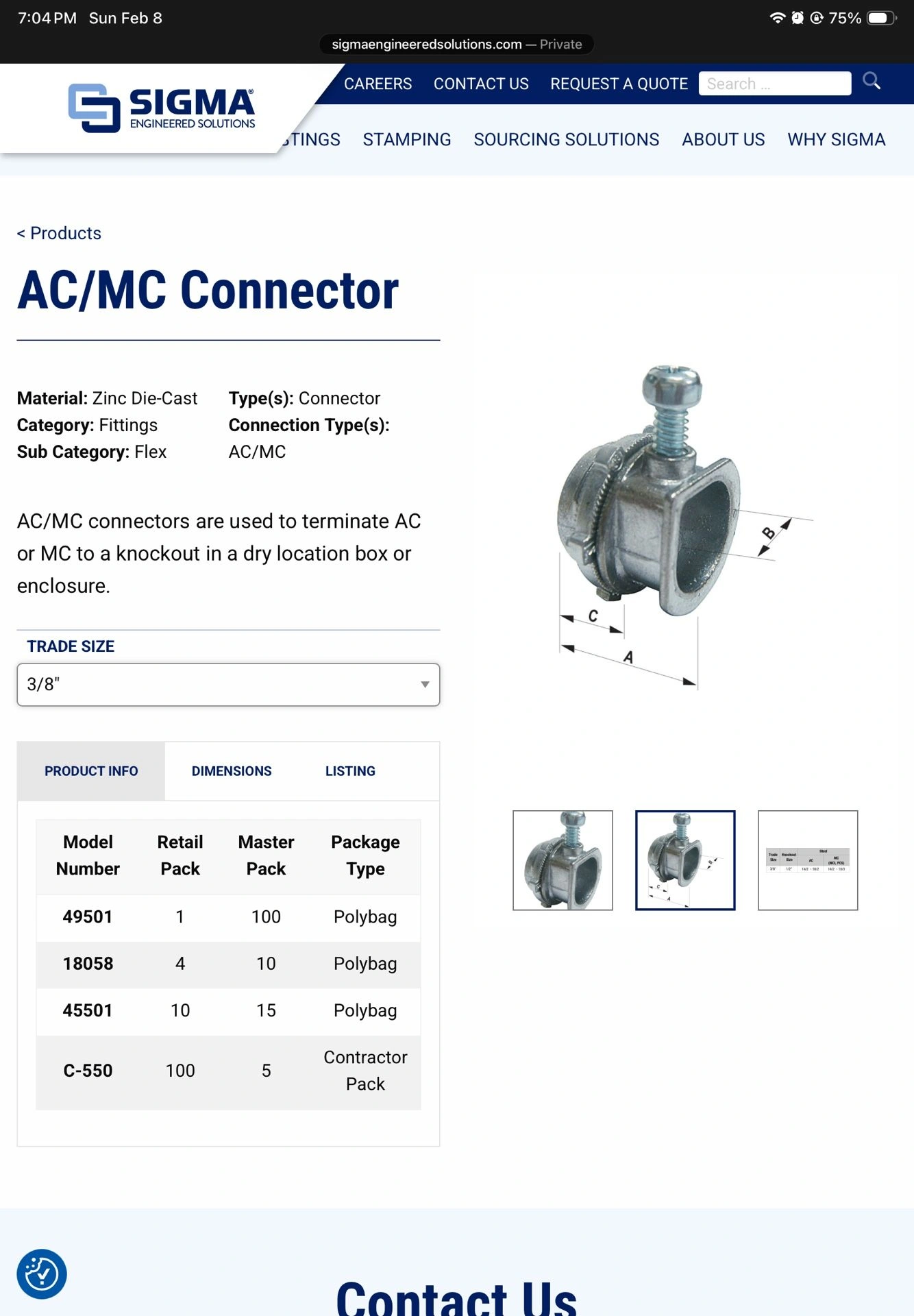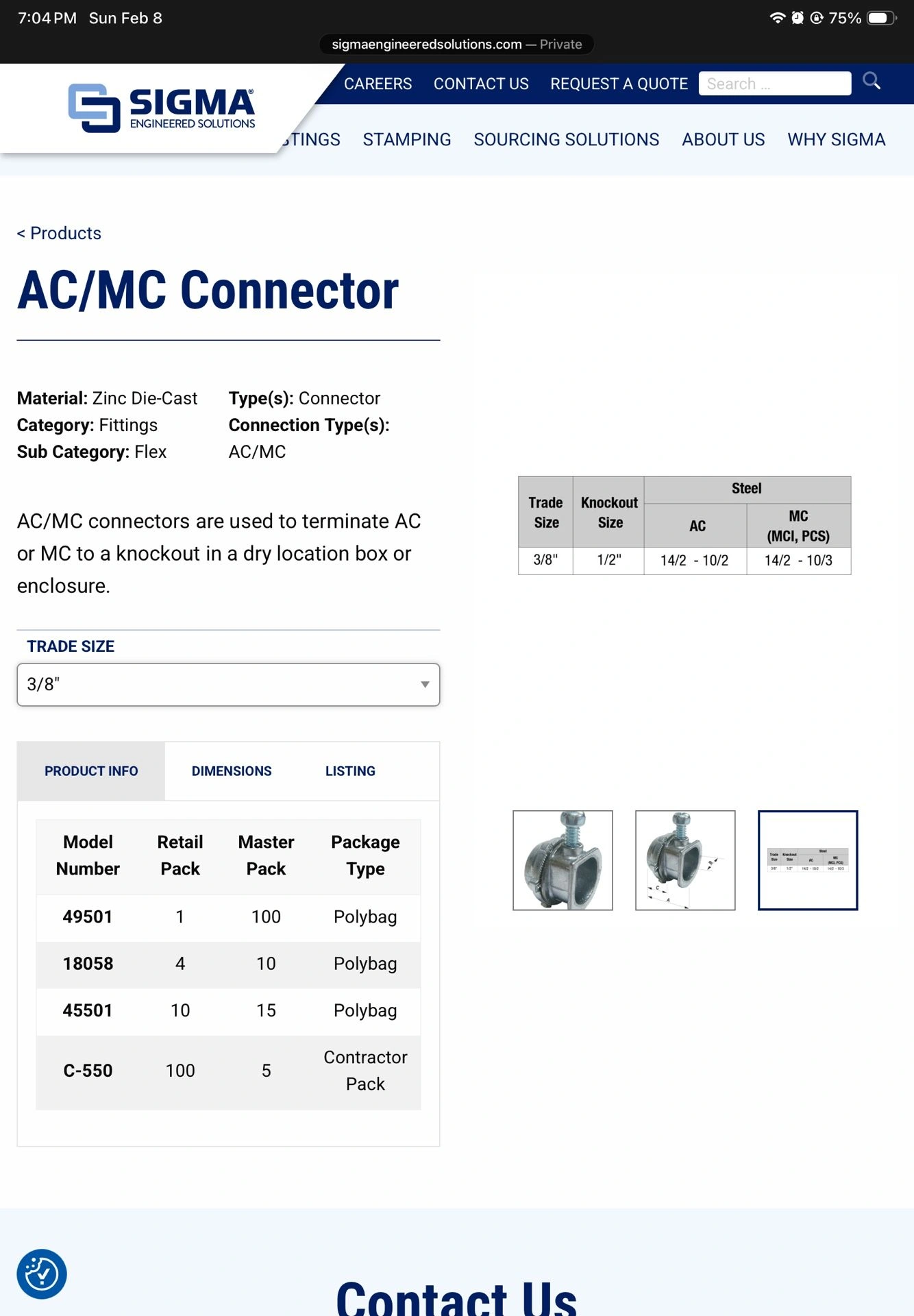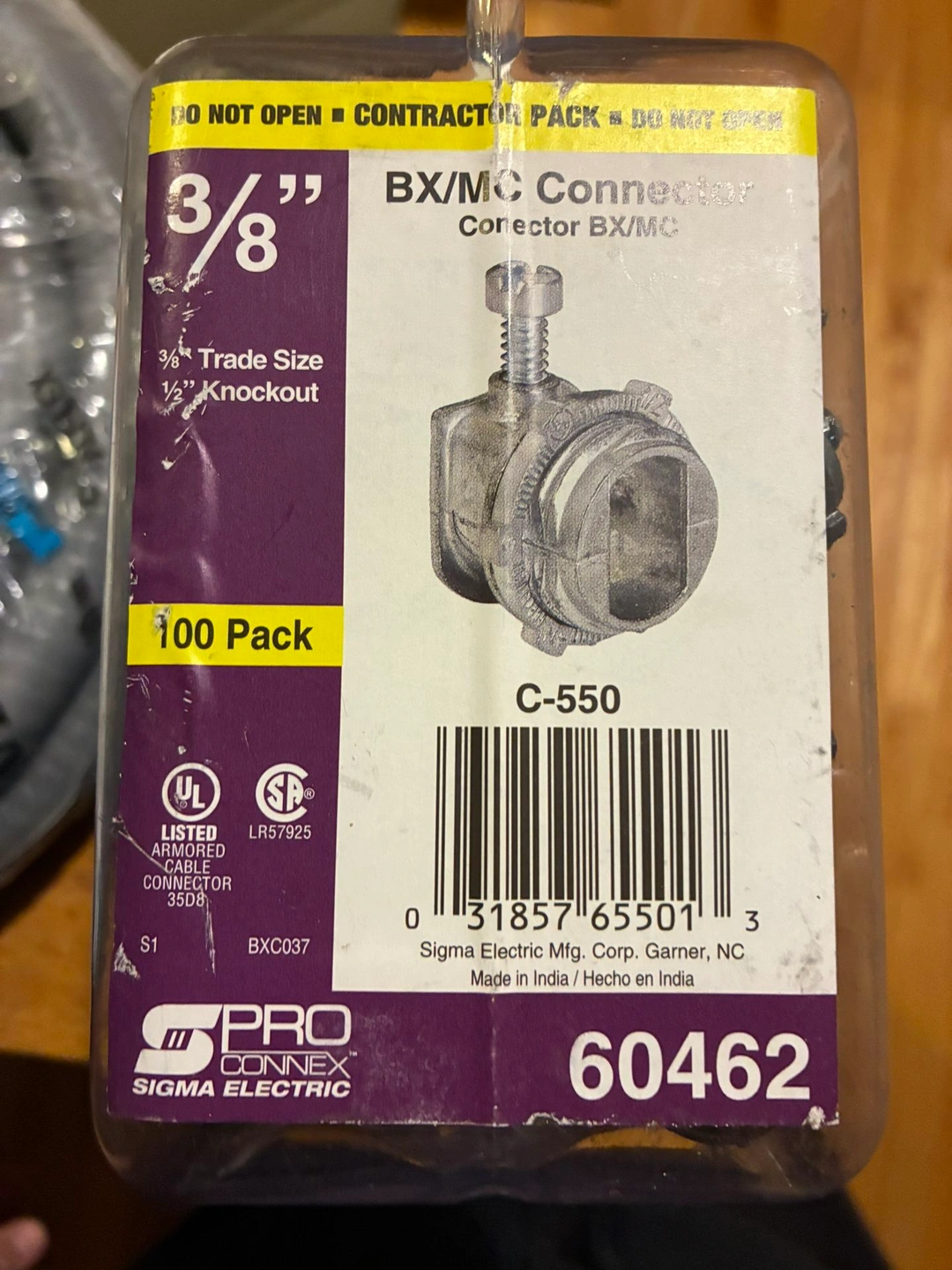 Sealed contractor pack of 100 Sigma ProConnex 3/8-inch Flexible / Die cast zinc AC/MC Connector Conduit Fittings. Model #C-550. Material: Zinc. Brand: Sigma Electric.
