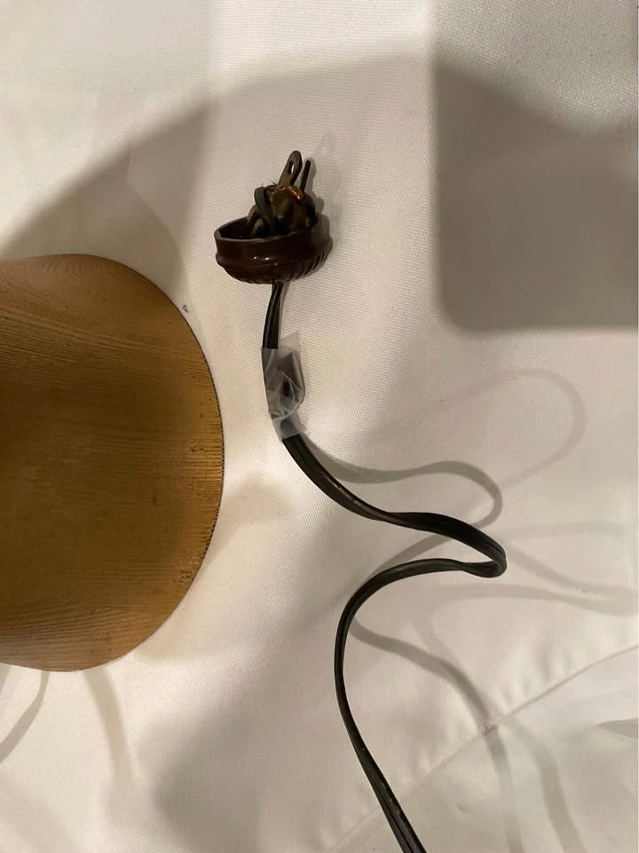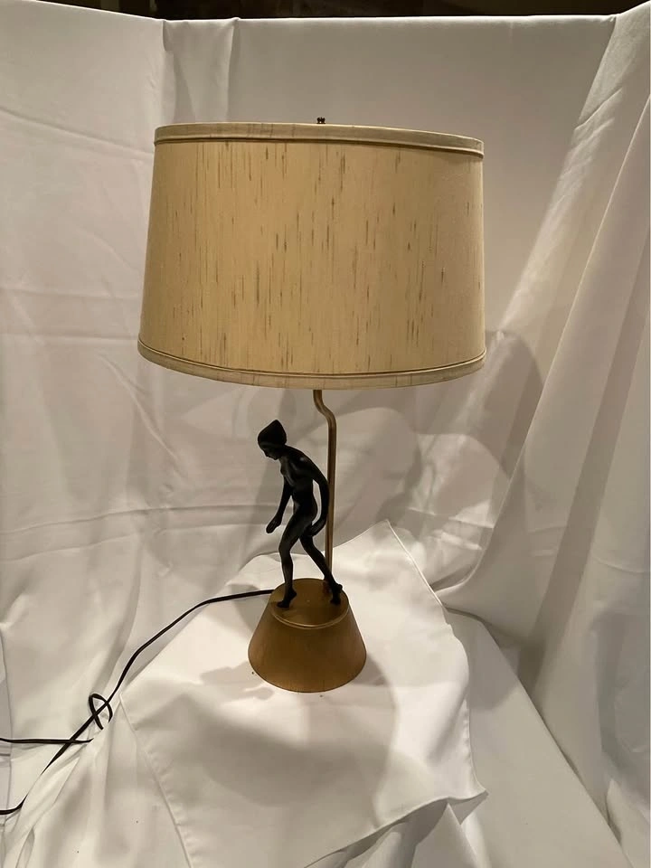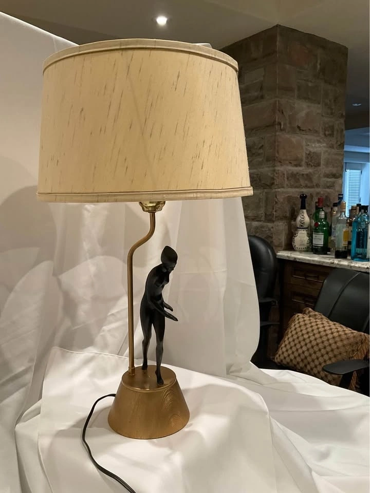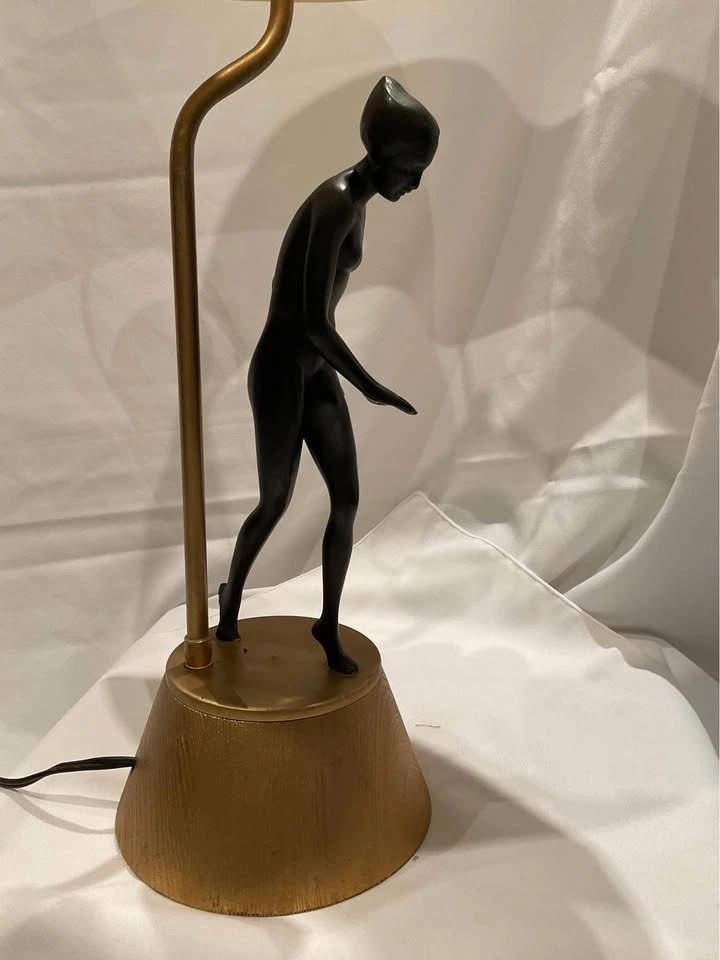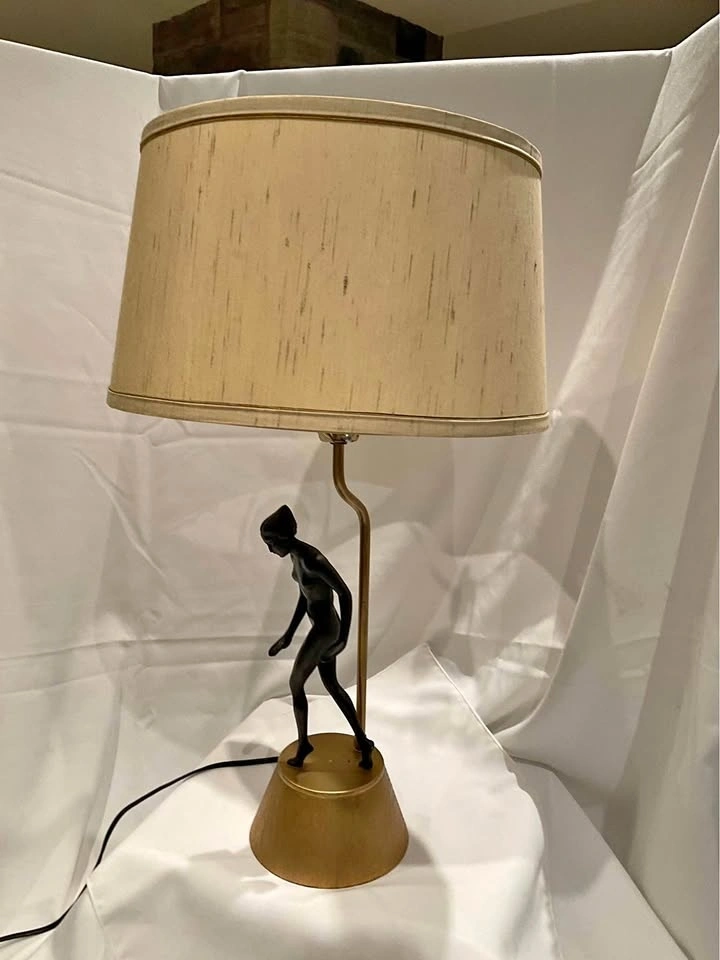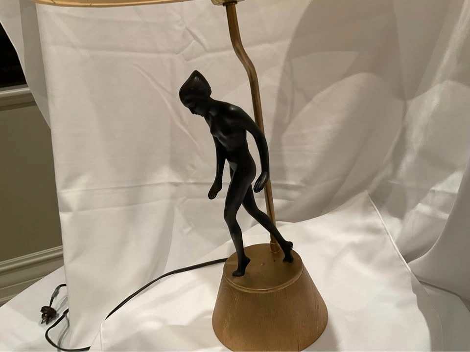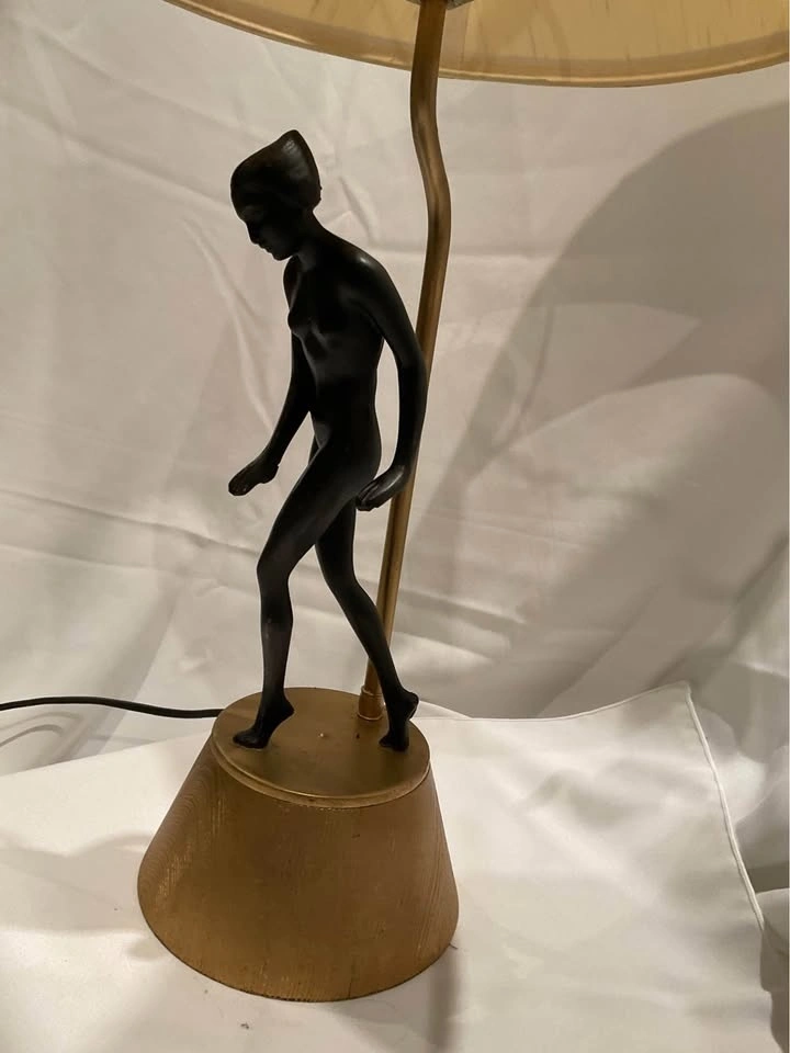 Vintage Art Deco Figural Table Lamp. She is Stunning! Original Shade - Base seems to be ceramic with a wood grain. Height 28 “ with shade. Base 5 1/2”. NOTE: requires new plug and is priced accordingly. Smoke & Pet Free Home. Cash Only - Richmond Hill / Bathurst & King Rd.
