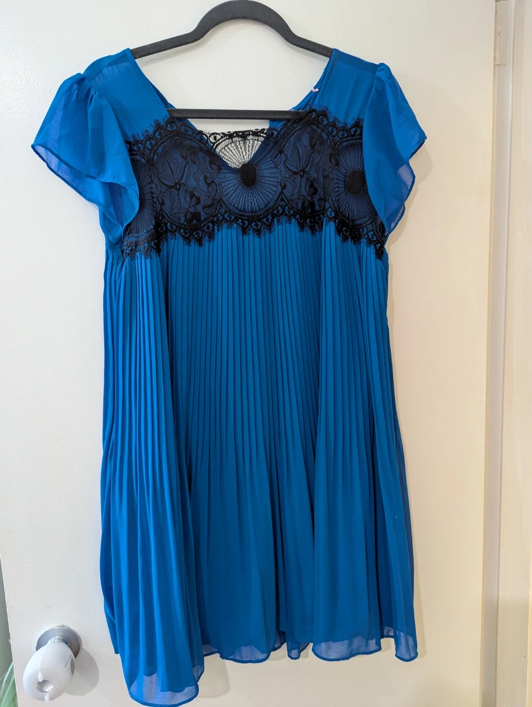 Cobalt Blue dress featuring a black lace insert at the neckline and short flutter sleeves. It has a pleated A-line skirt. This dress is stylish and airy, perfect for a warm day out!