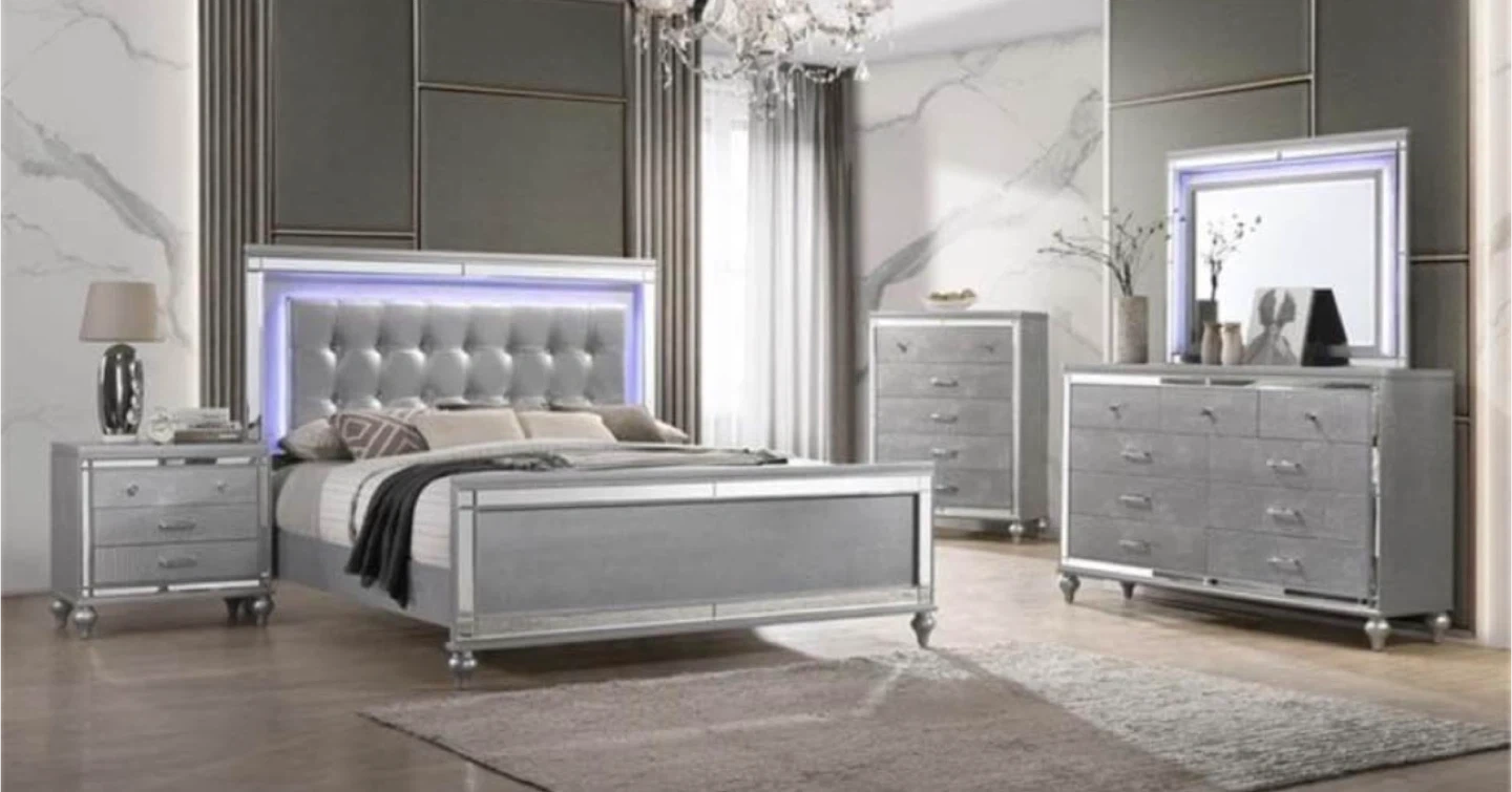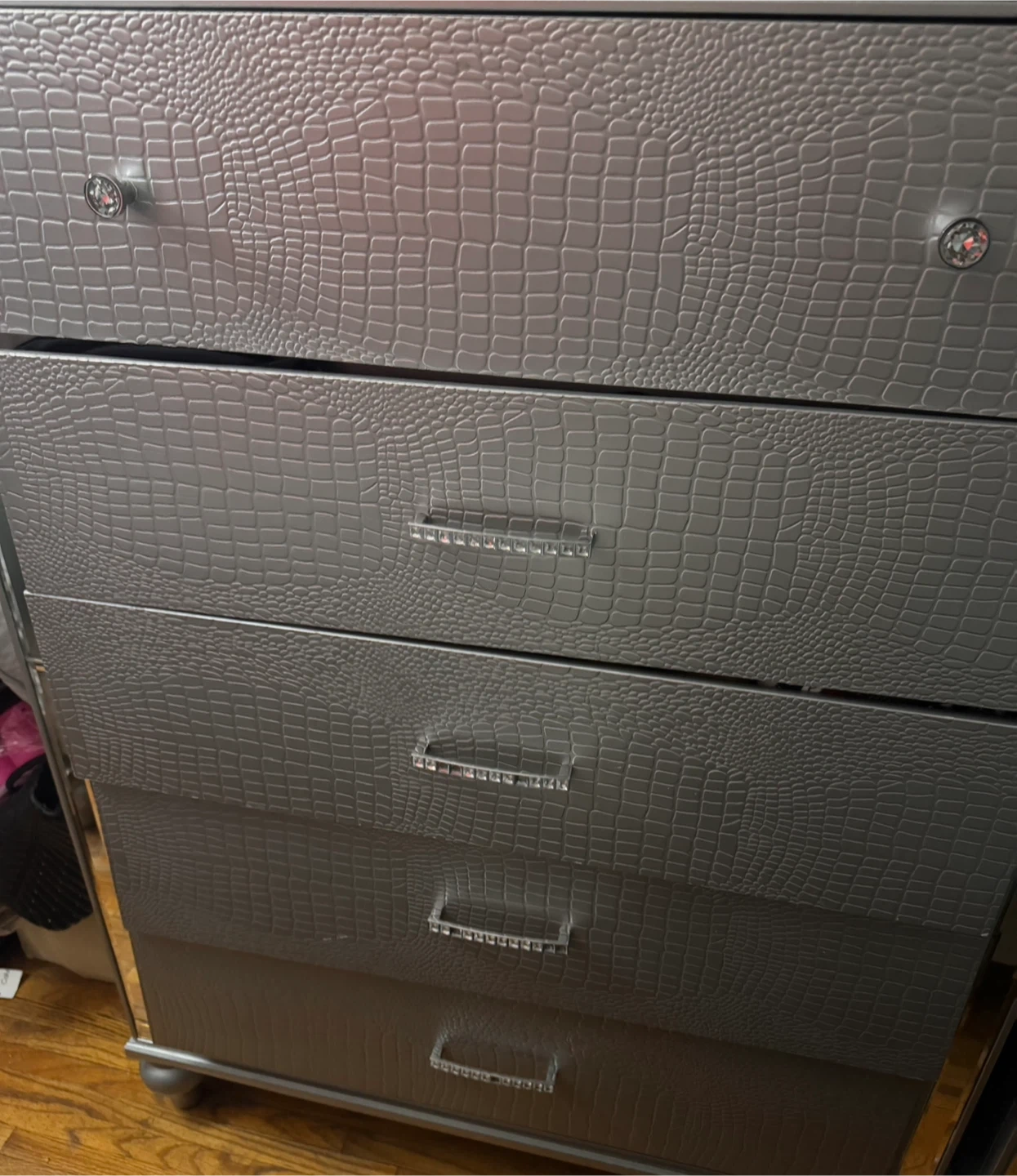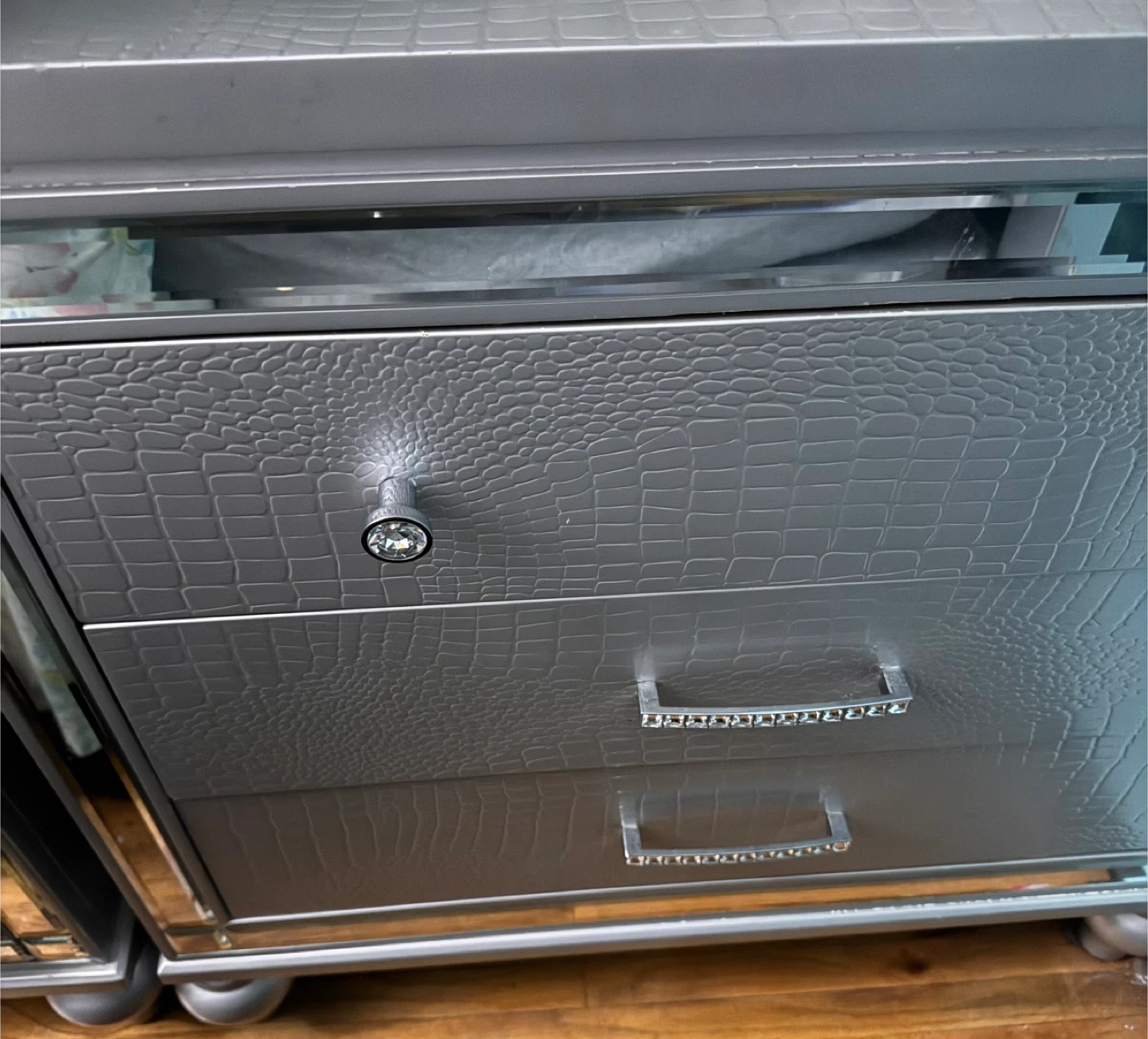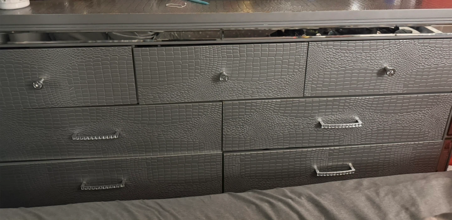 This dresser features a unique silver crocodile texture finish on its drawer fronts. It comes with crystal-embellished handles for a touch of glam. Plenty of drawer space for storage. This would be a stylish addition to a bedroom.
